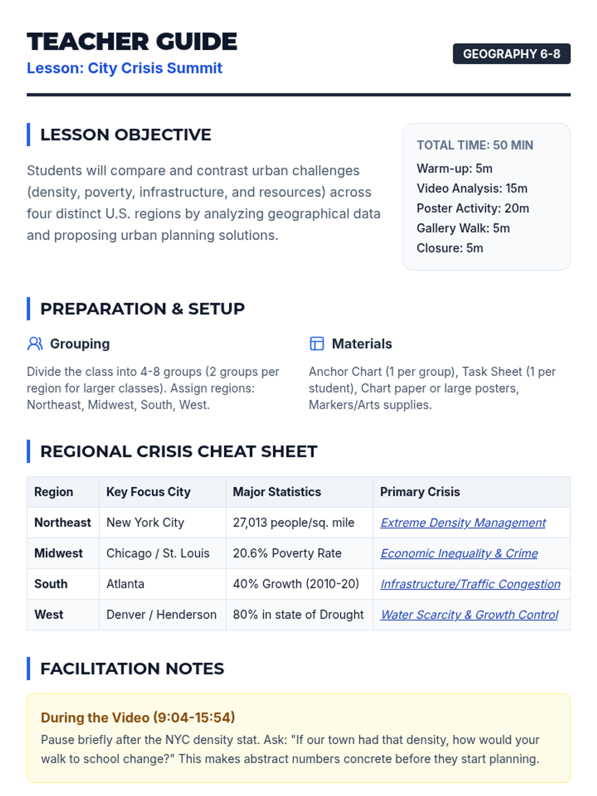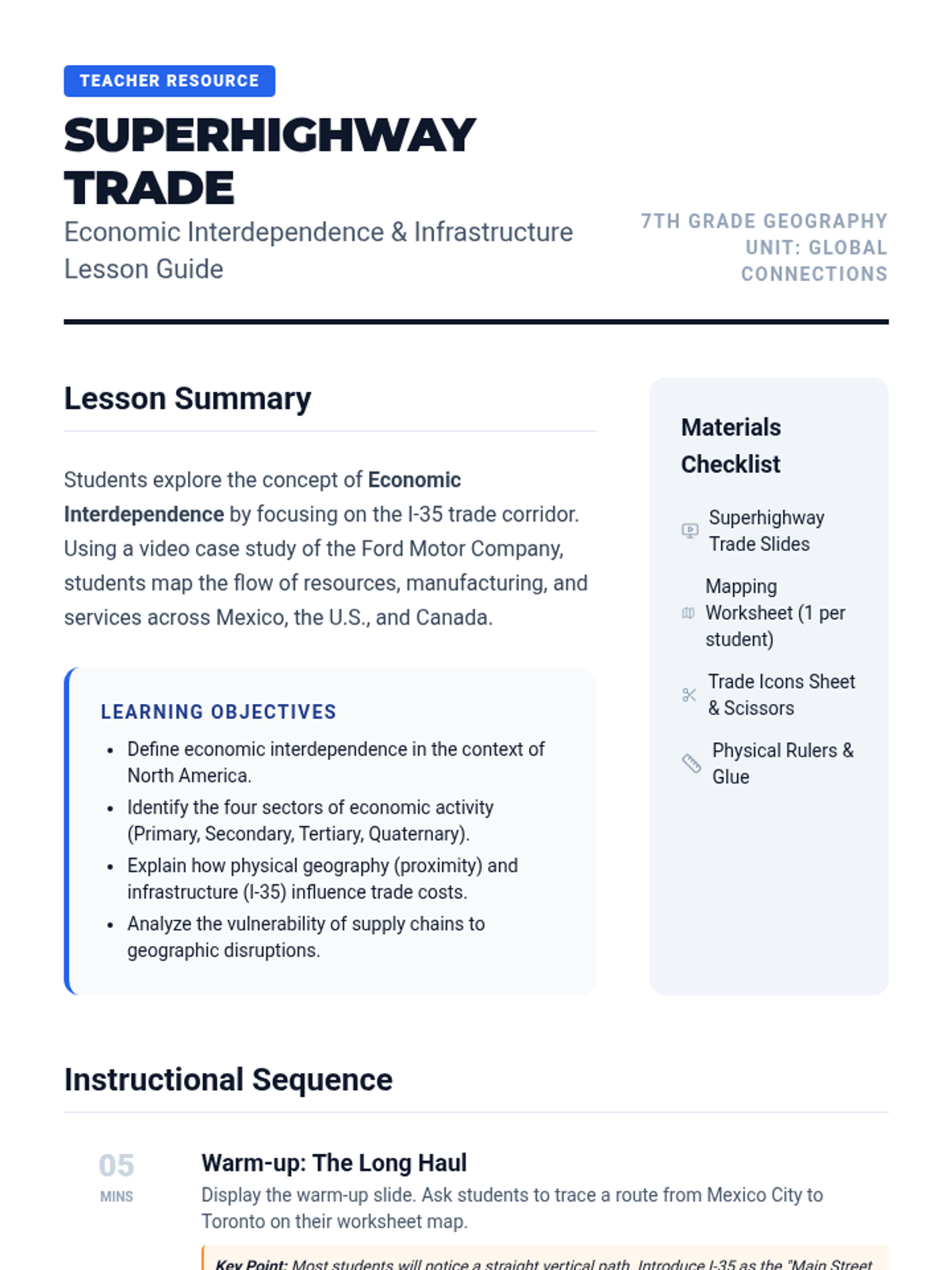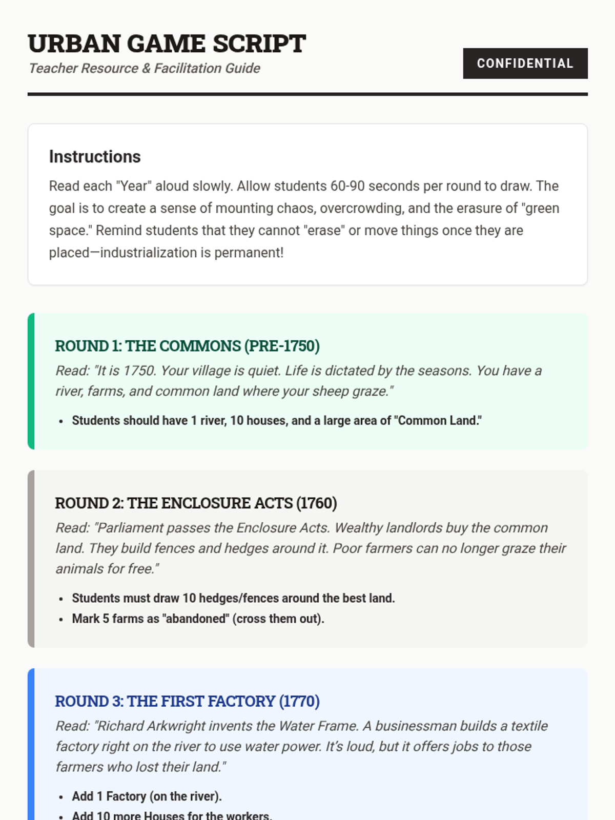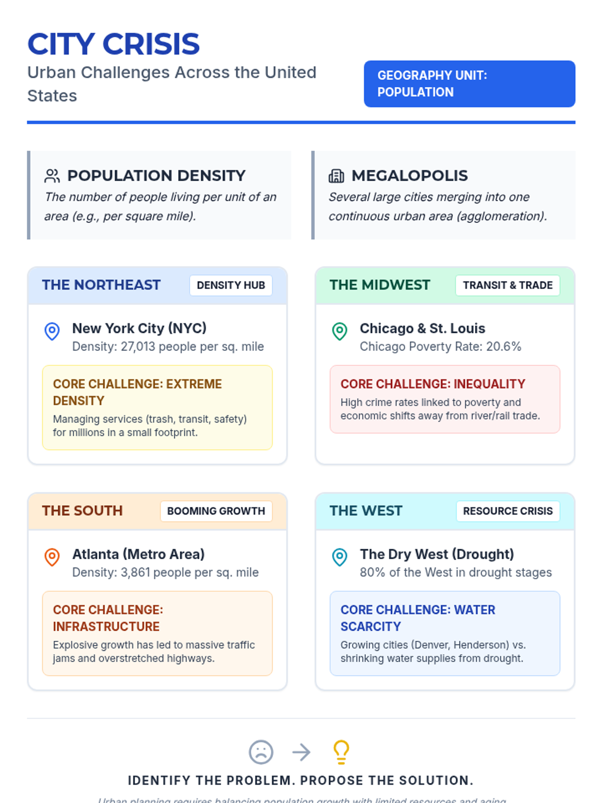 This sequence explores the functional, geographic, and symbolic roles of state capital cities. Students analyze historical placement patterns, simulate the legislative process, and design a modern capital city based on contemporary demographic and infrastructure needs.