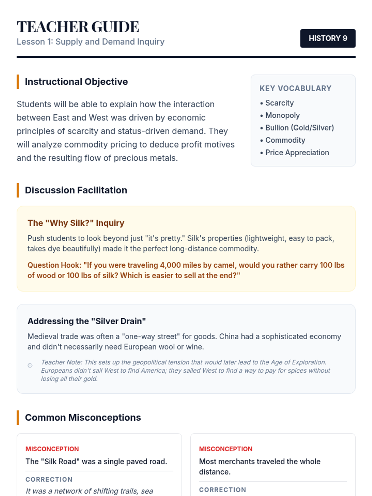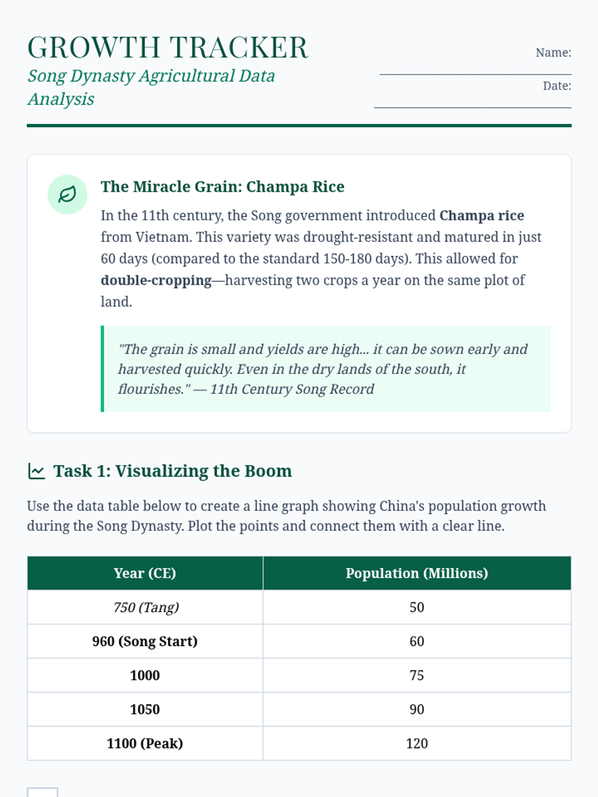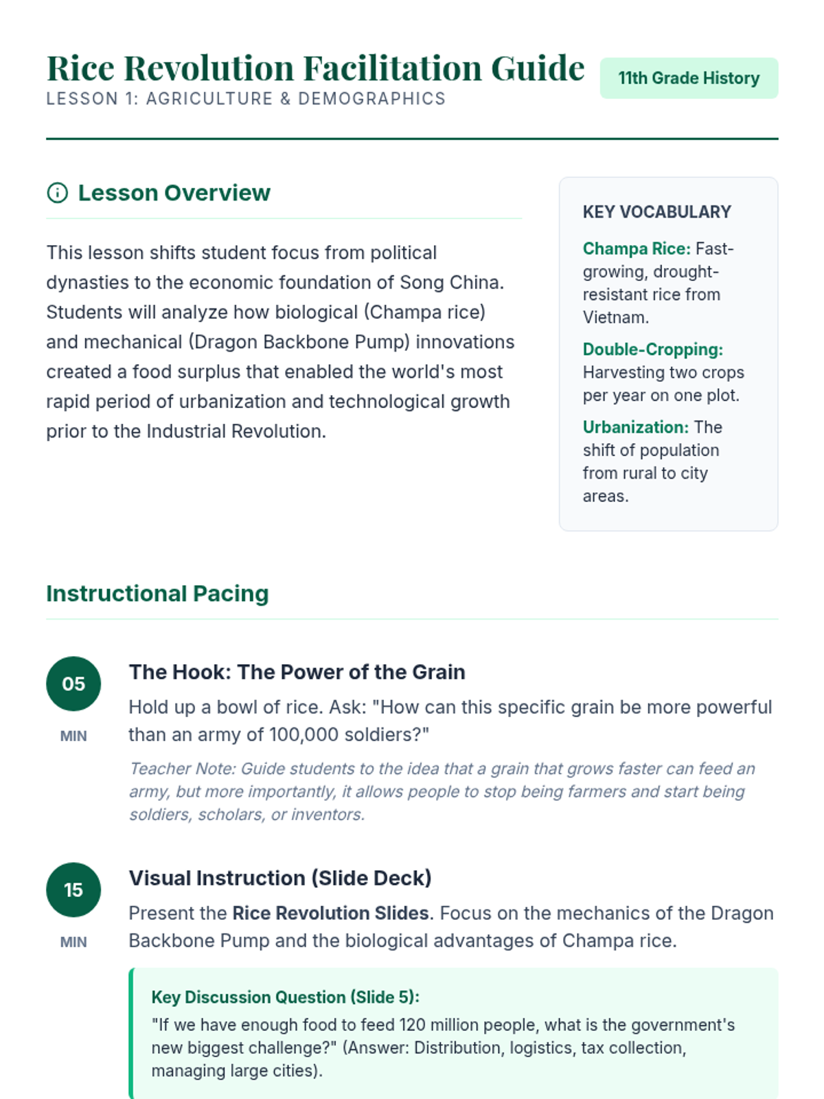 This 5-lesson sequence explores the 'Song Dynasty Economic Revolution,' analyzing the technological and economic innovations that placed China at the forefront of global development. Students examine agricultural breakthroughs, the 'Four Great Inventions,' financial systems like paper money, and the urbanization depicted in the Qingming Scroll to understand the conditions required for rapid innovation.