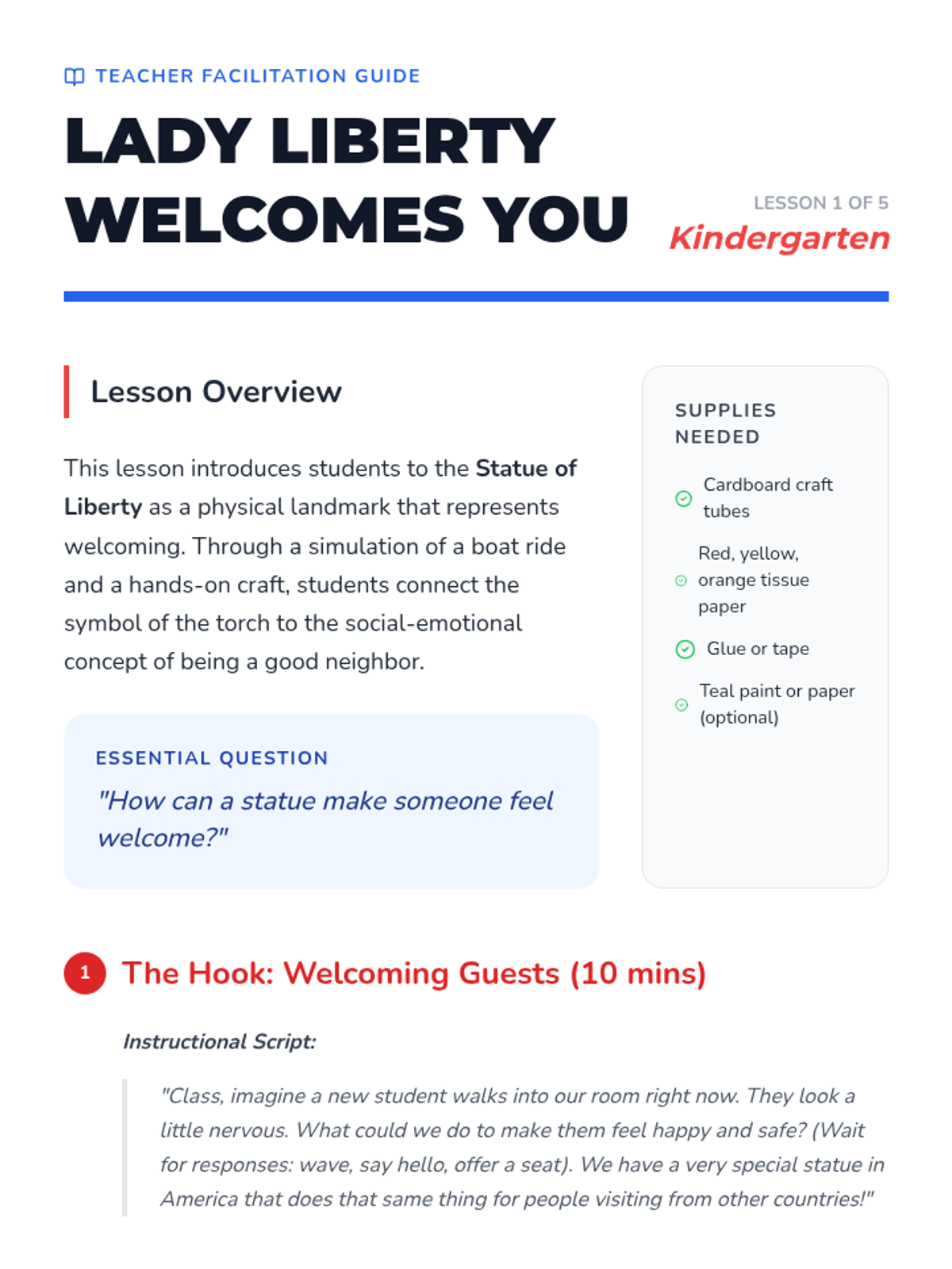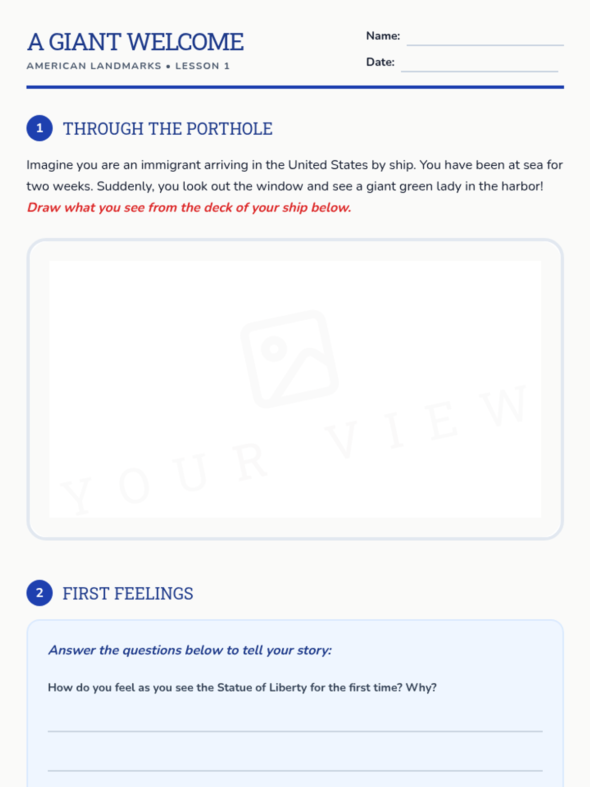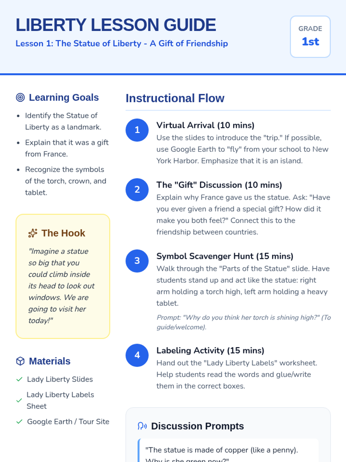 A 3rd-grade sequence exploring the Statue of Liberty's history, construction, symbolism, and connection to immigration at Ellis Island, emphasizing empathy and historical perspective.