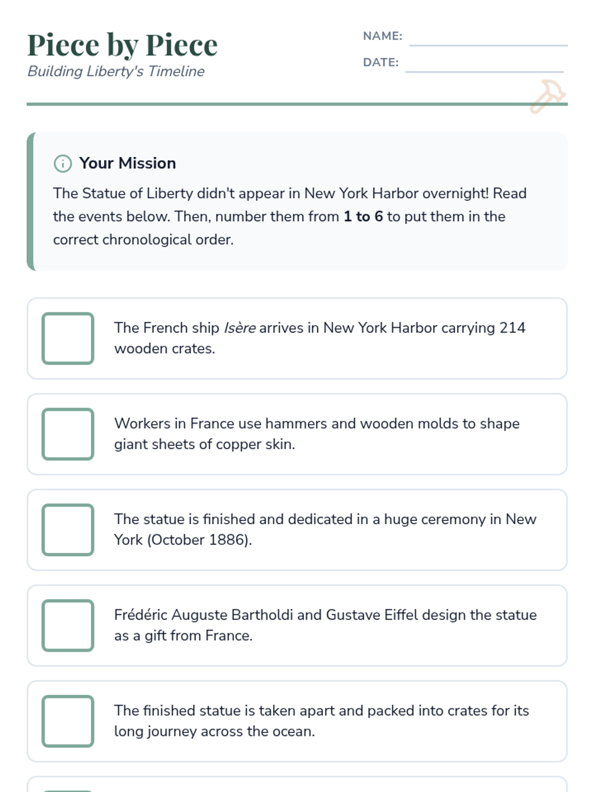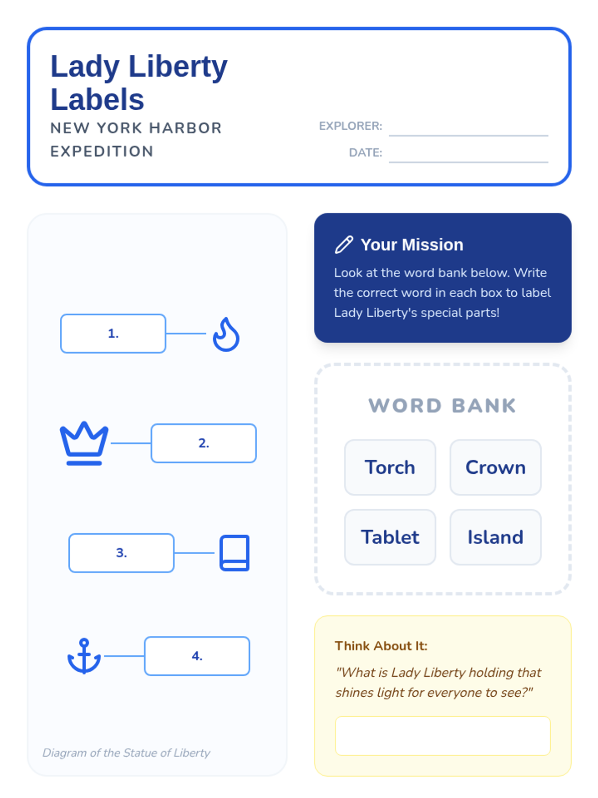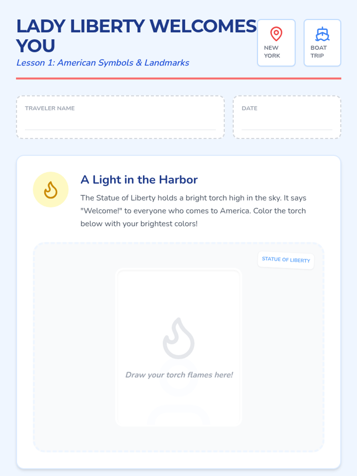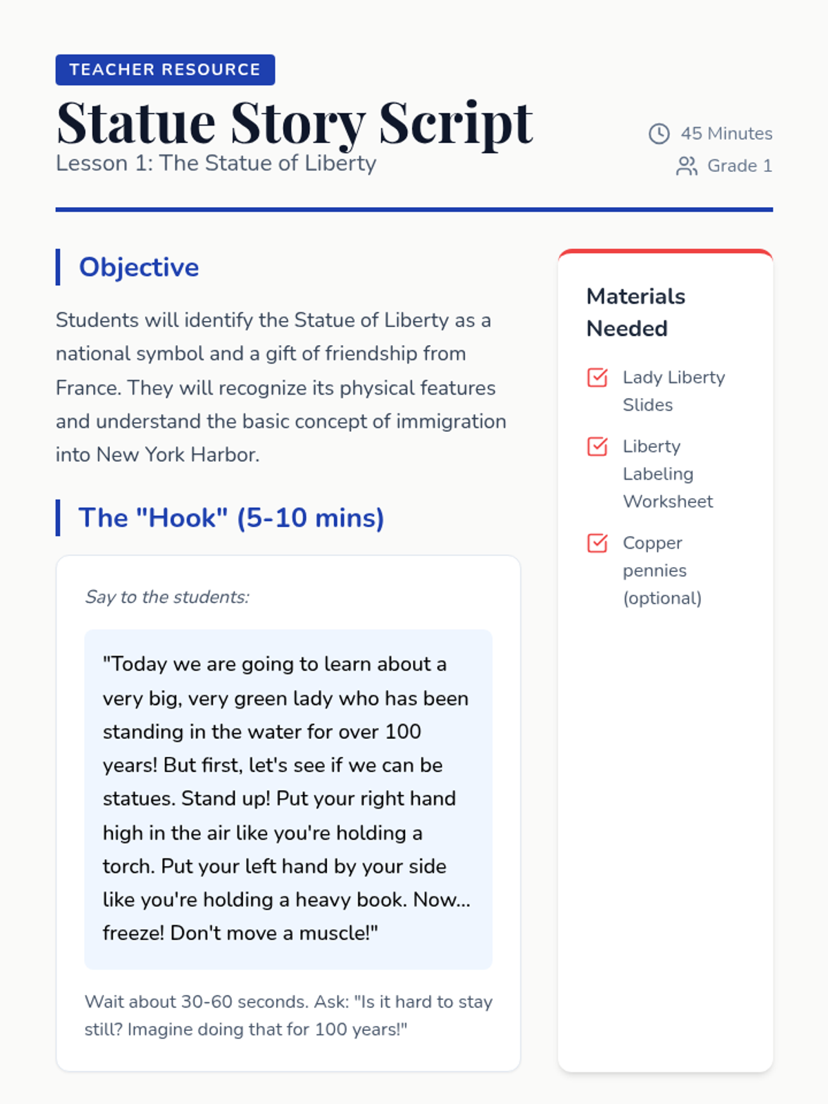 A 3rd-grade sequence exploring the Statue of Liberty's history, construction, symbolism, and connection to immigration at Ellis Island, emphasizing empathy and historical perspective.