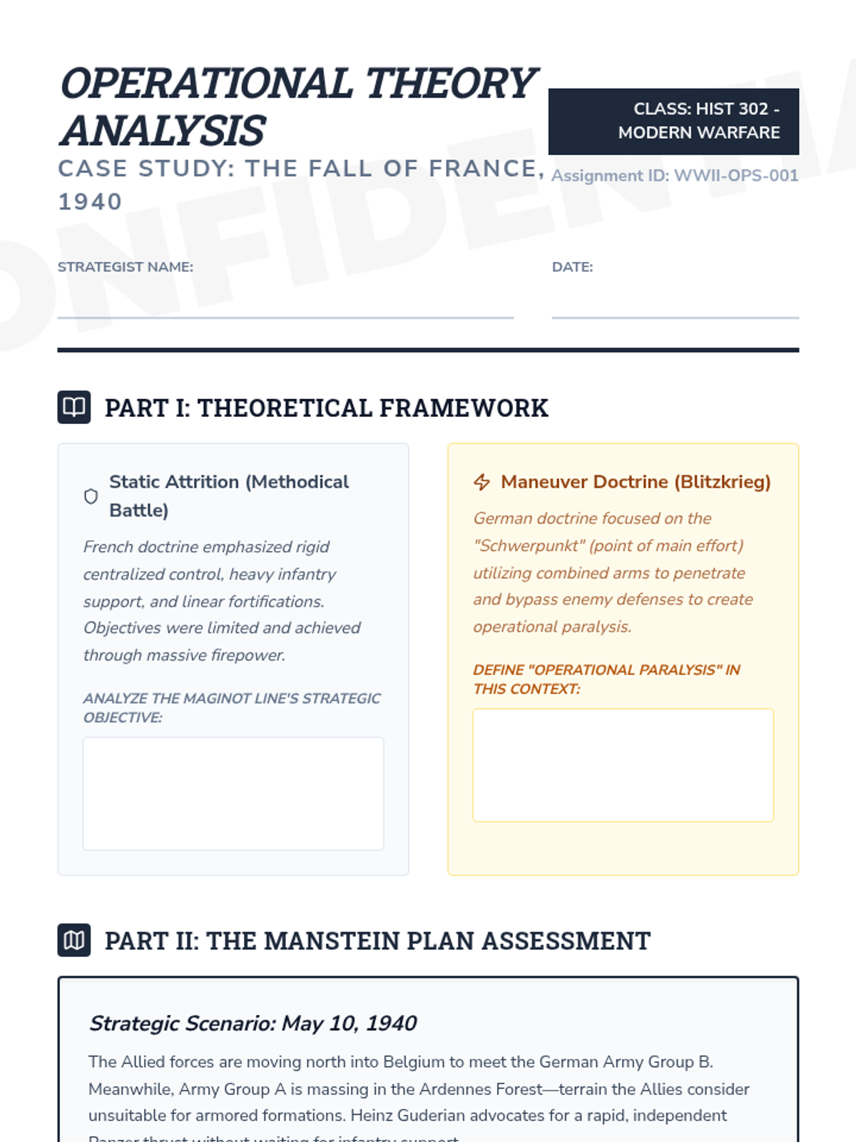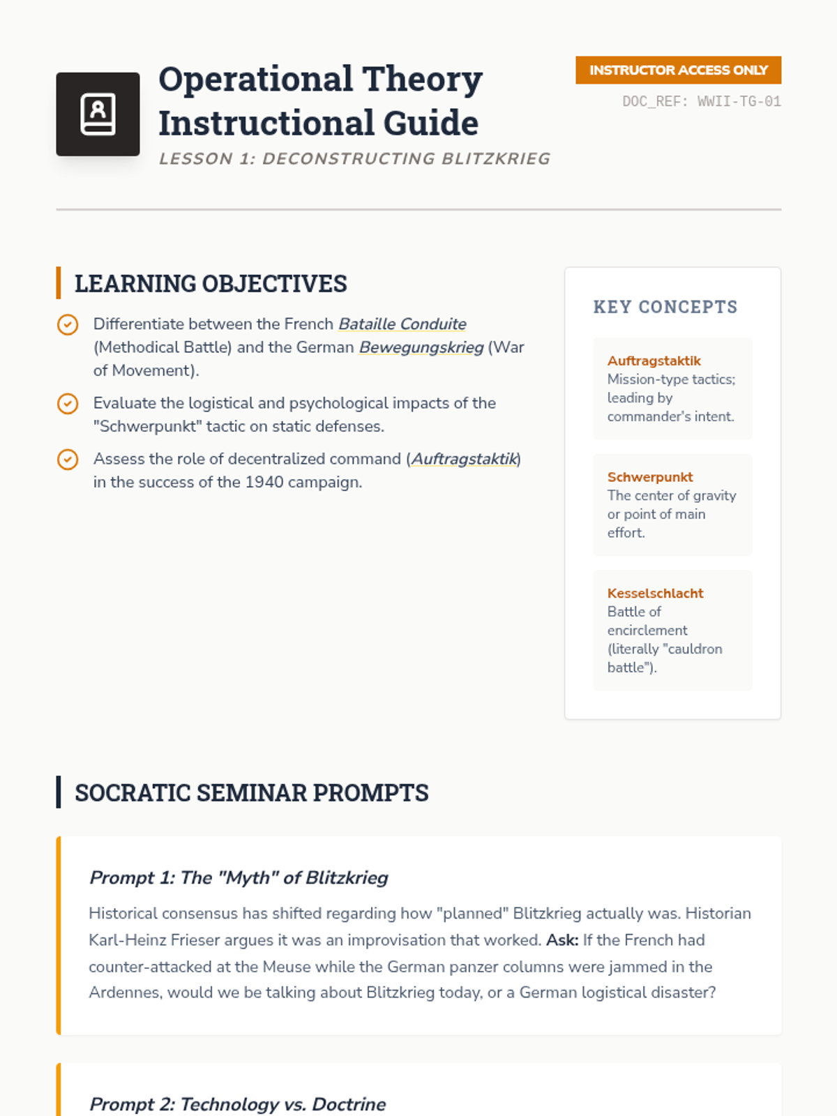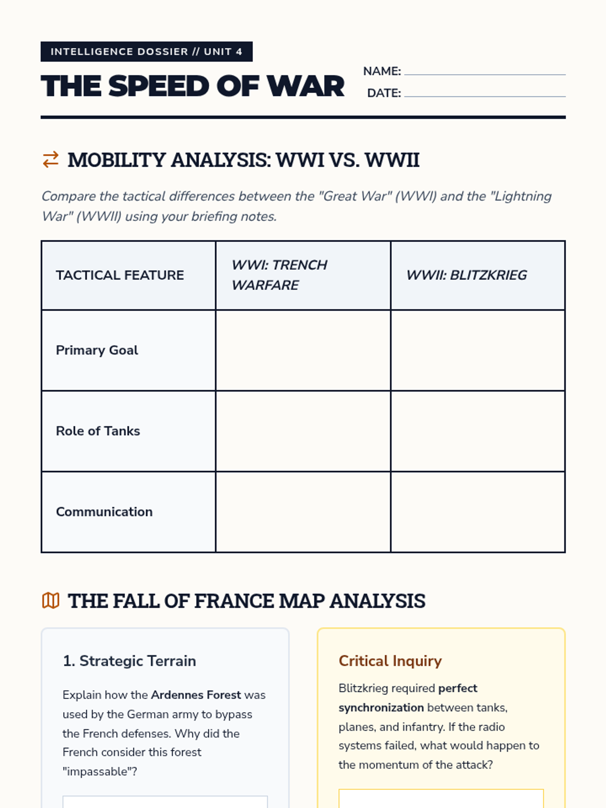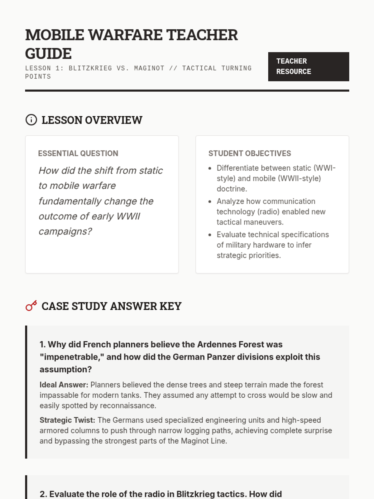 An in-depth 11th-grade history sequence examining World War II through the lens of military strategy, geography, and technological innovation. Students analyze key turning points from the Fall of France to D-Day, participating in strategic simulations and case studies.