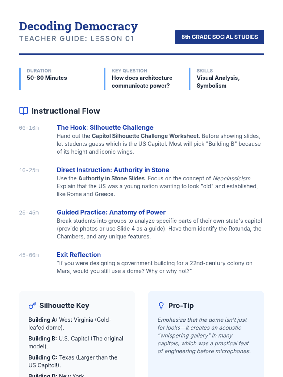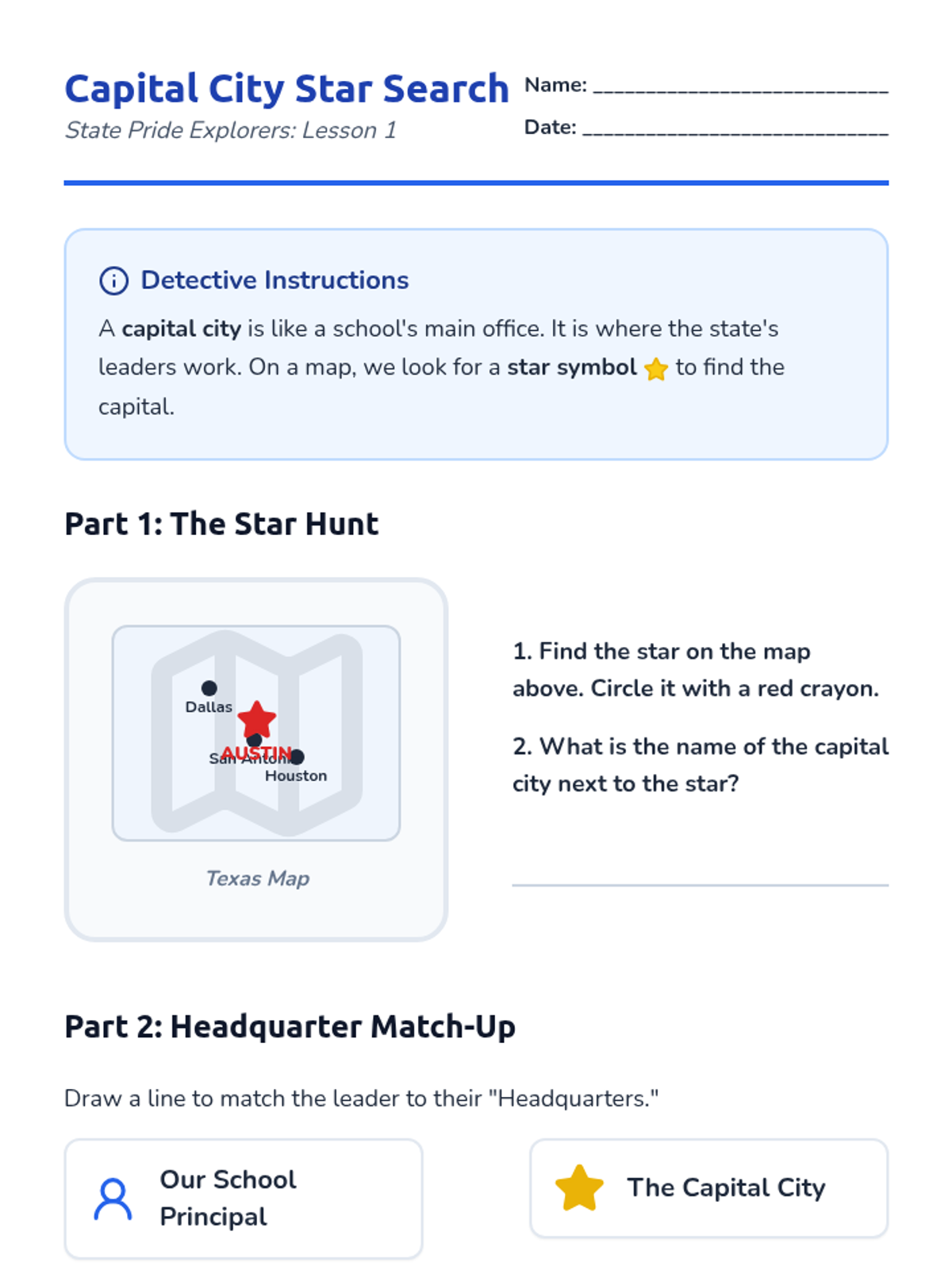 Students explore the cultural identity and governance of a state through its symbols, capital city, and leadership. This project-based unit connects abstract political concepts to concrete local examples using Texas as a primary model.