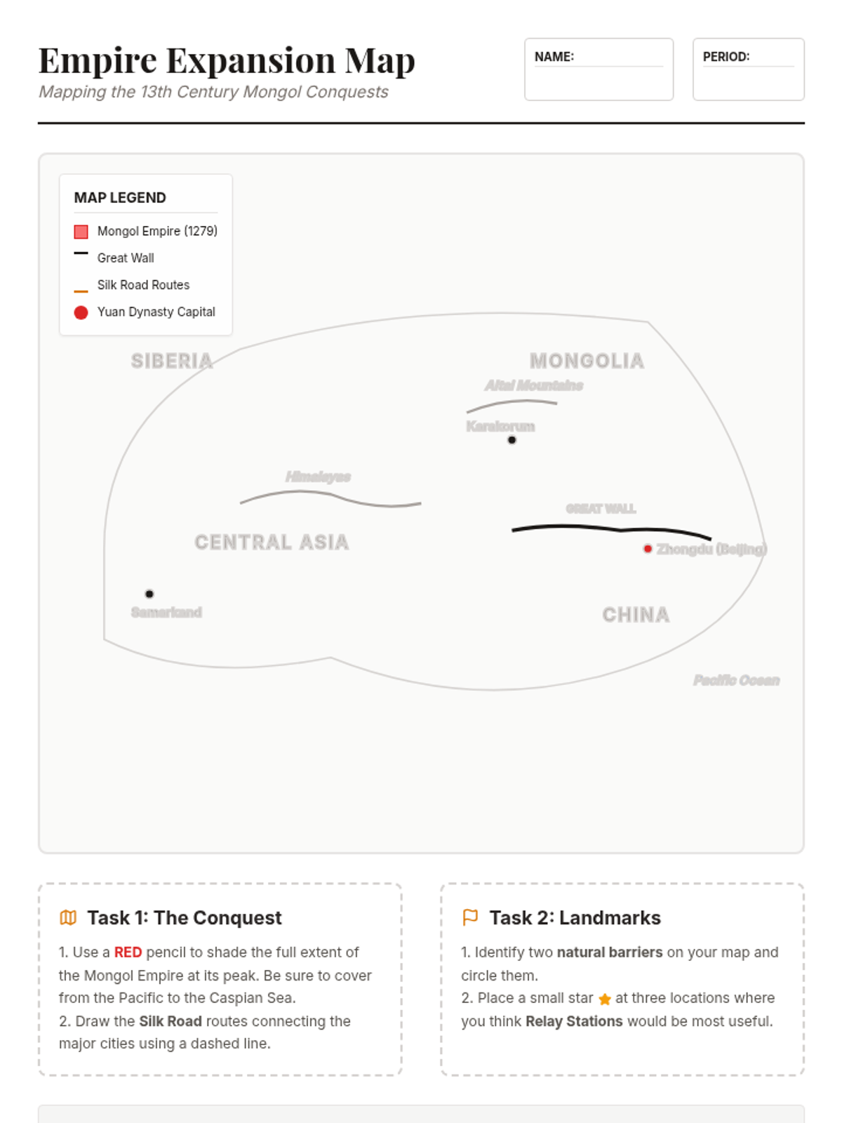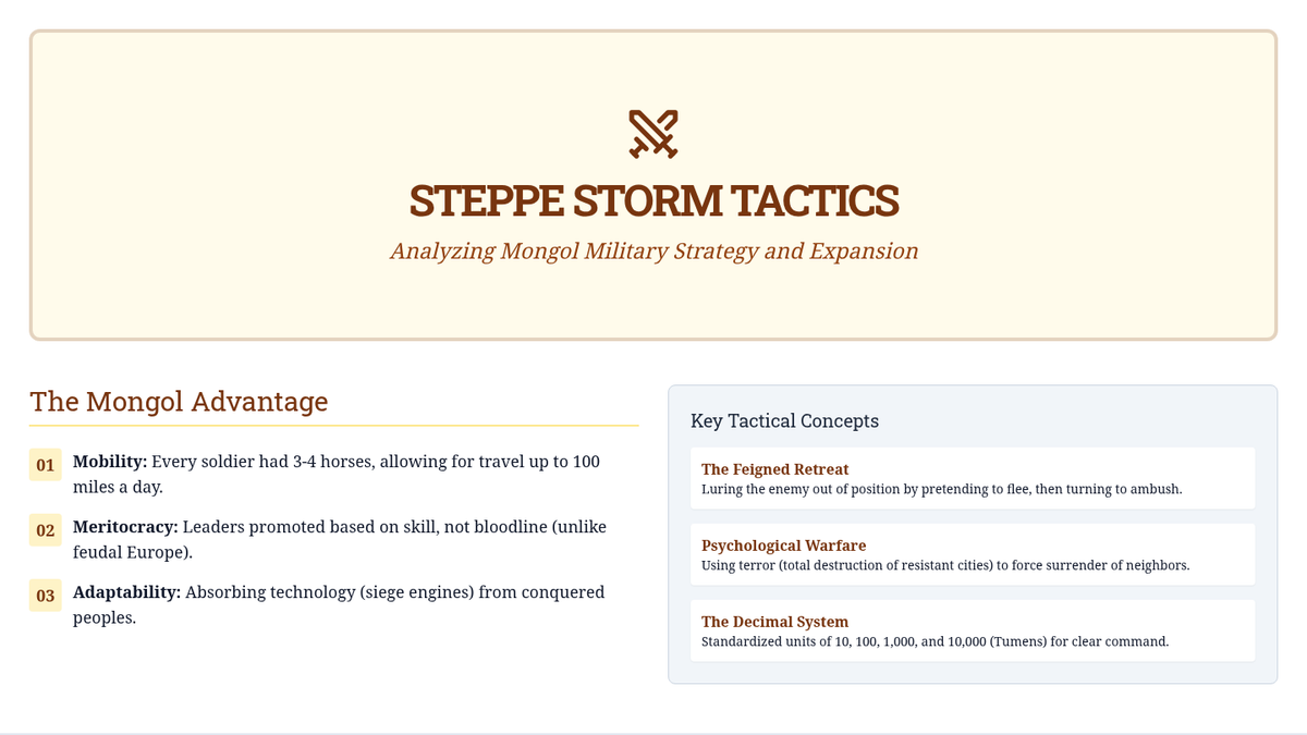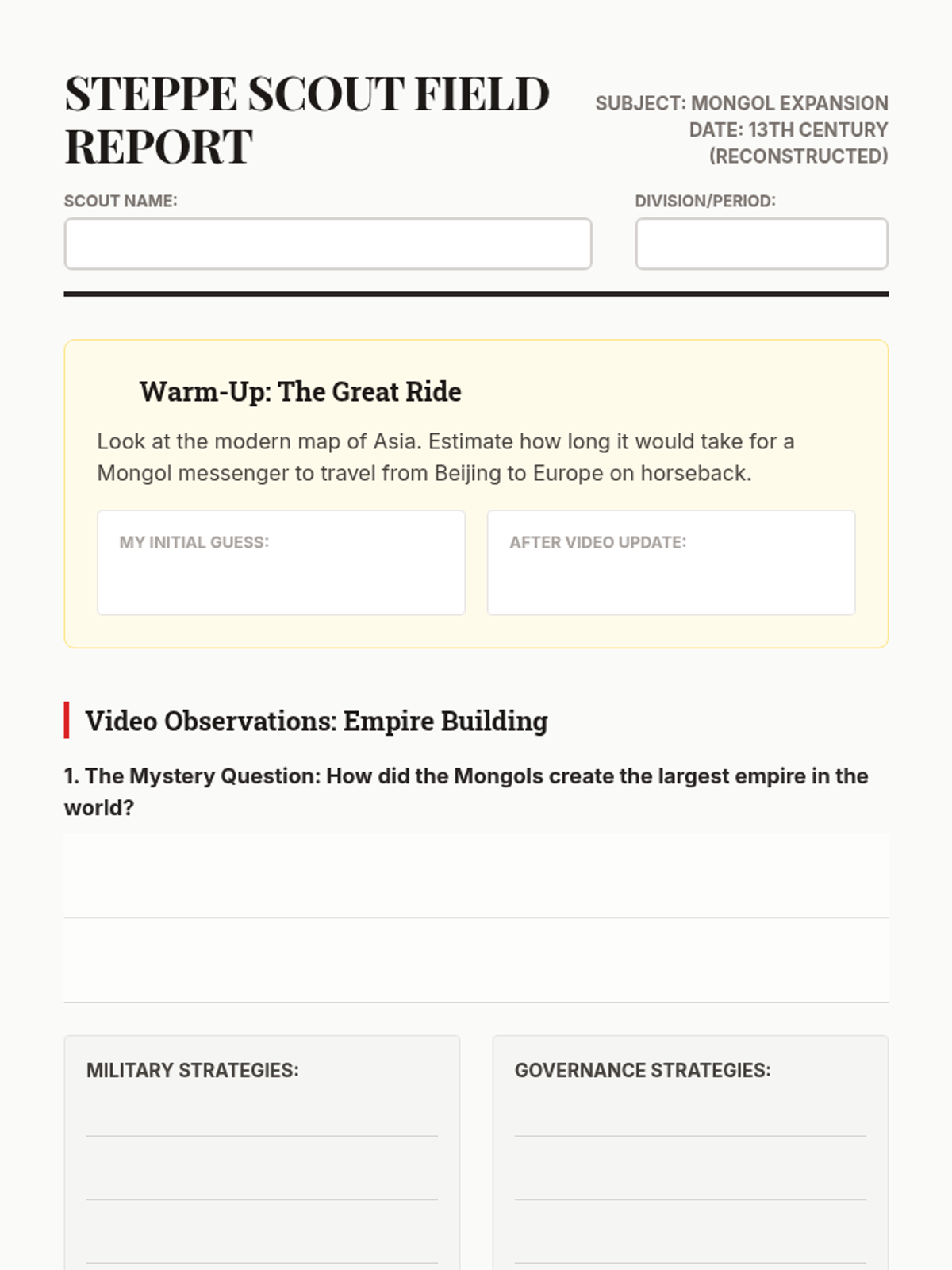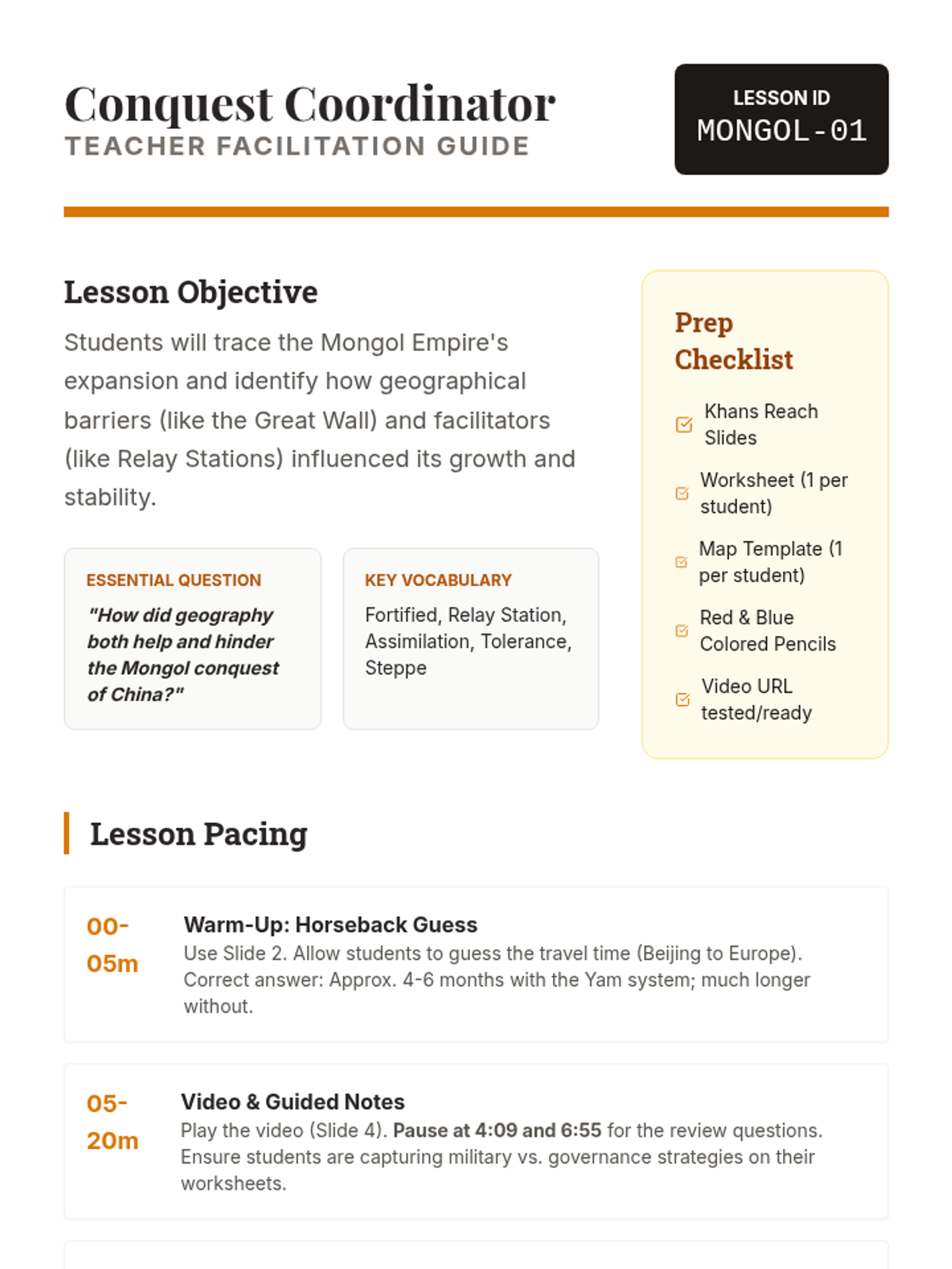 This sequence explores the Mongol Empire's rise from nomadic tribes to a global superpower. Students investigate the environmental factors of the steppe, tactical innovations, the administration of the Yuan Dynasty, and the transformative cultural and economic exchanges of the Pax Mongolica, culminating in a critical evaluation of Genghis Khan's historical legacy.