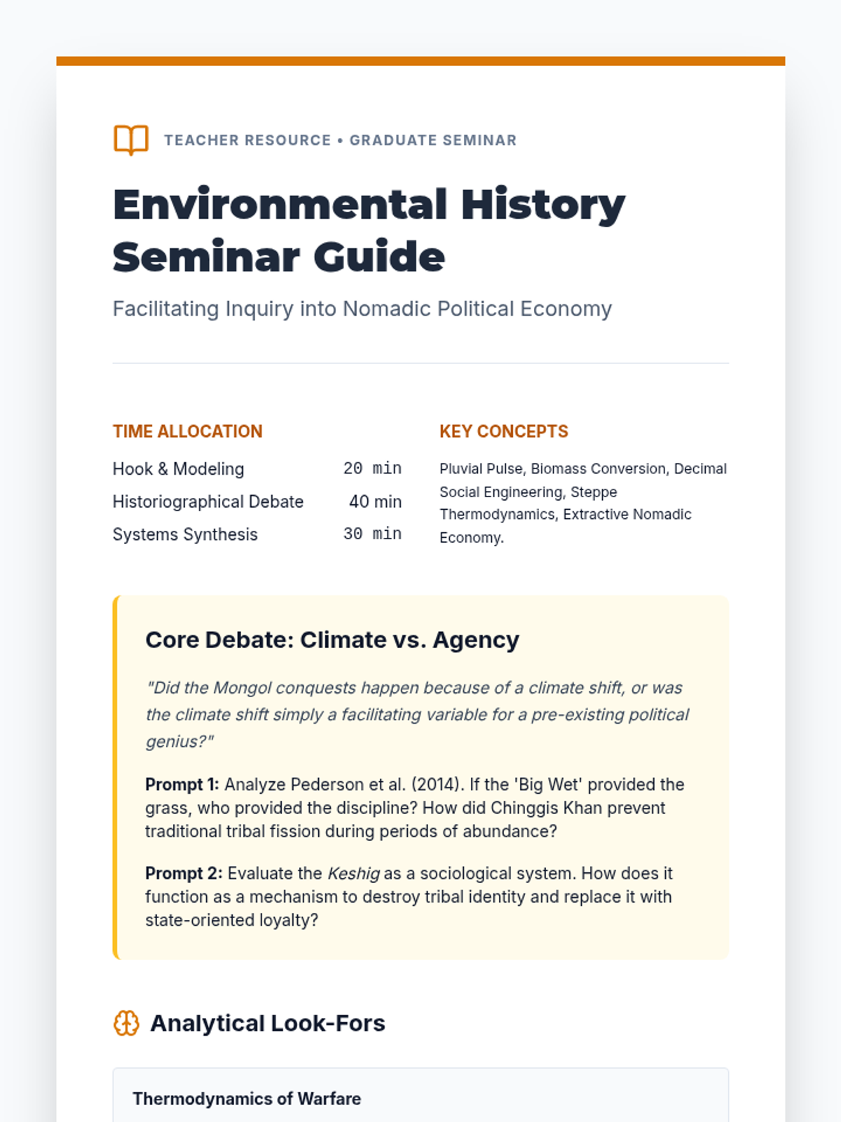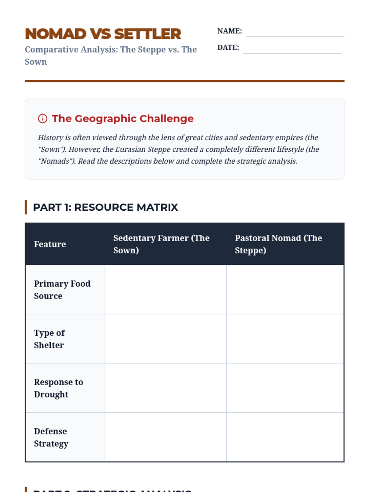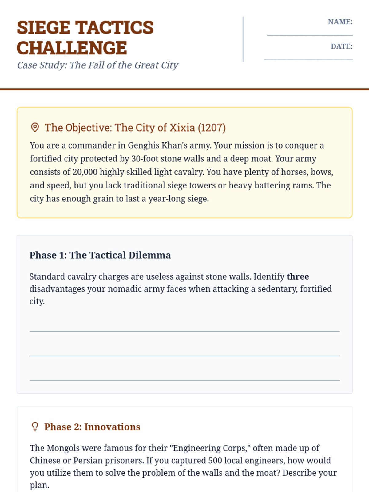 This sequence explores the Mongol Empire's rise from nomadic tribes to a global superpower. Students investigate the environmental factors of the steppe, tactical innovations, the administration of the Yuan Dynasty, and the transformative cultural and economic exchanges of the Pax Mongolica, culminating in a critical evaluation of Genghis Khan's historical legacy.