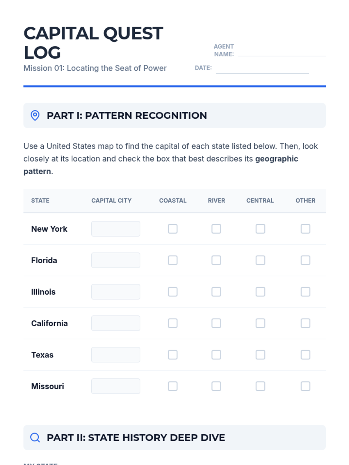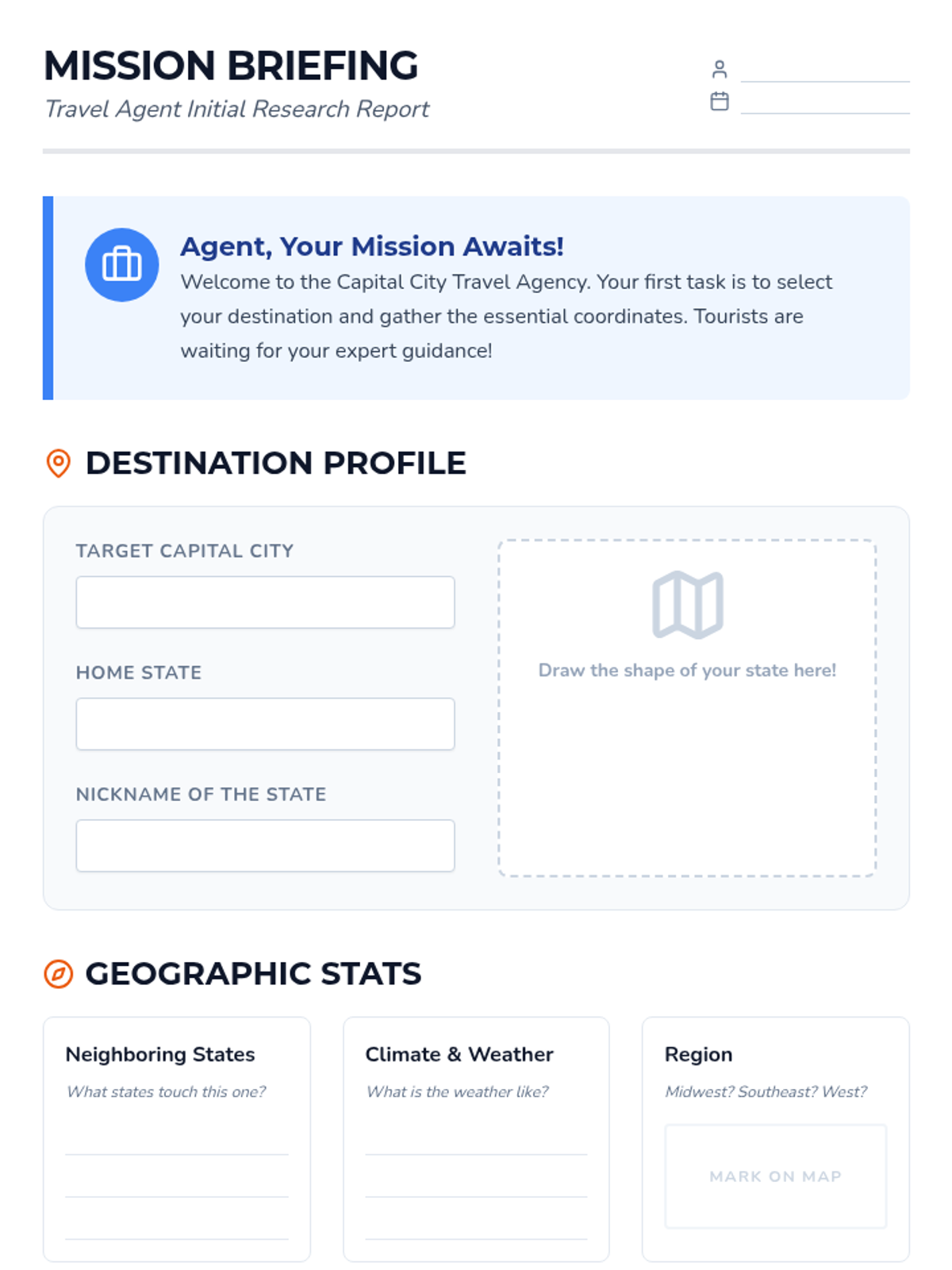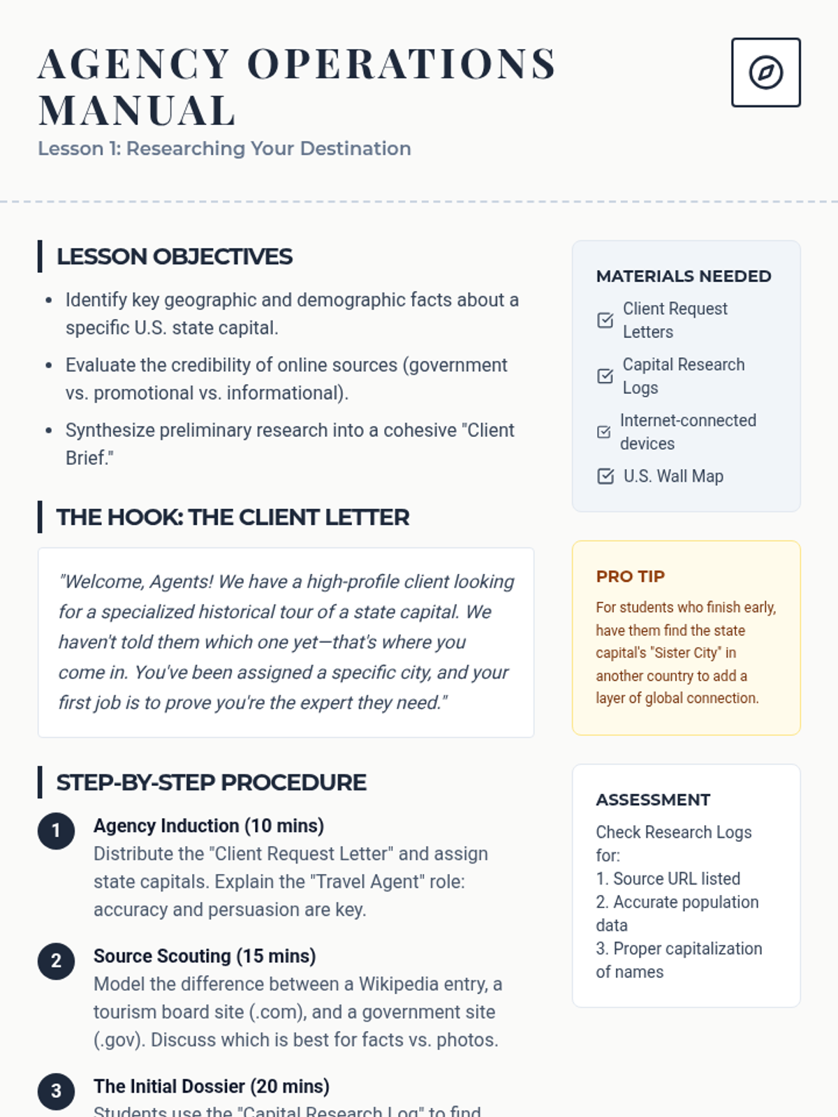 A project-based social studies unit where 3rd-grade students act as travel agents to research, design, and present travel guides for US state capitals. Students explore geography, architecture, and local history to understand what makes these cities unique.