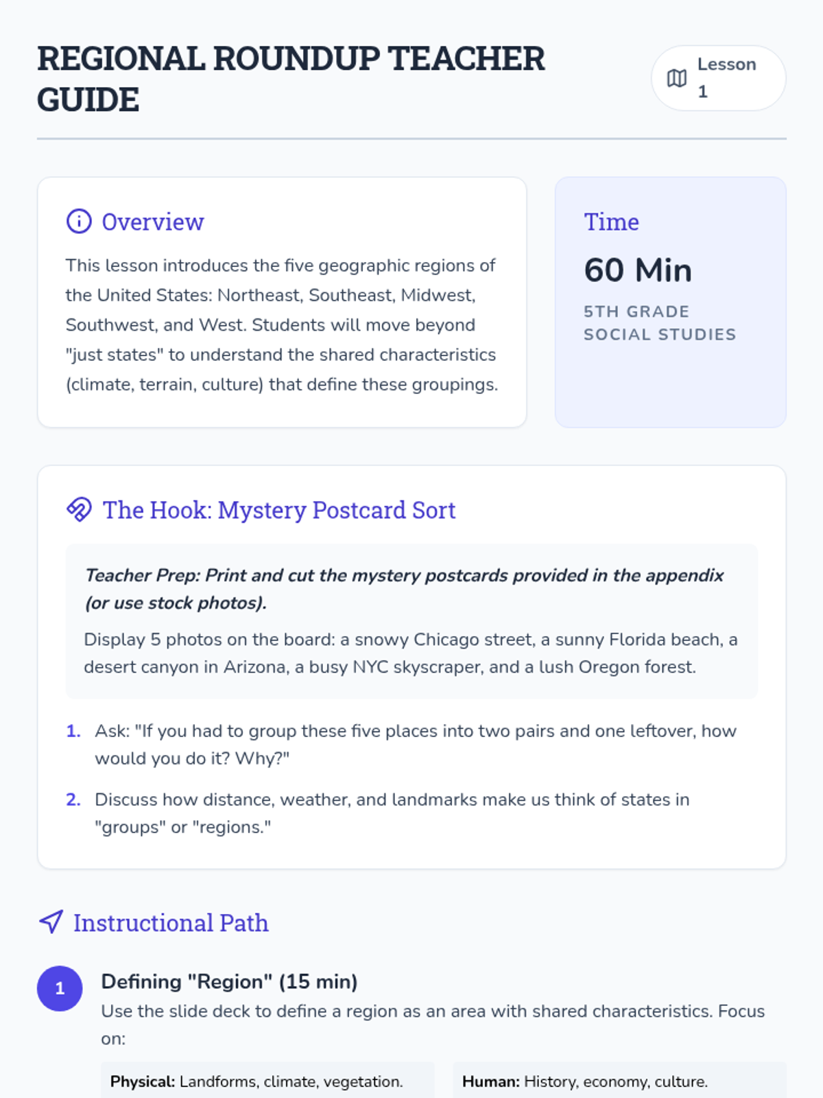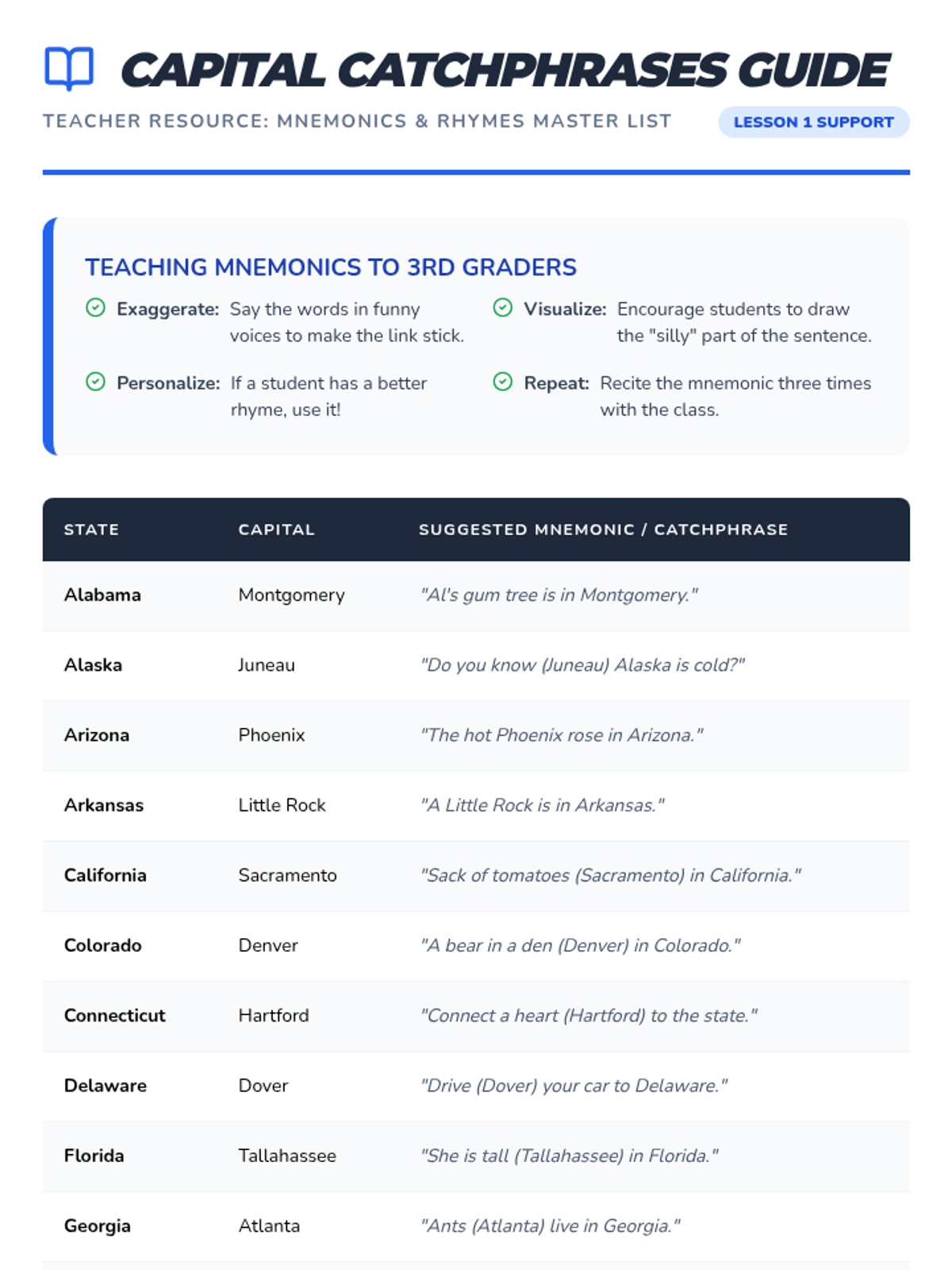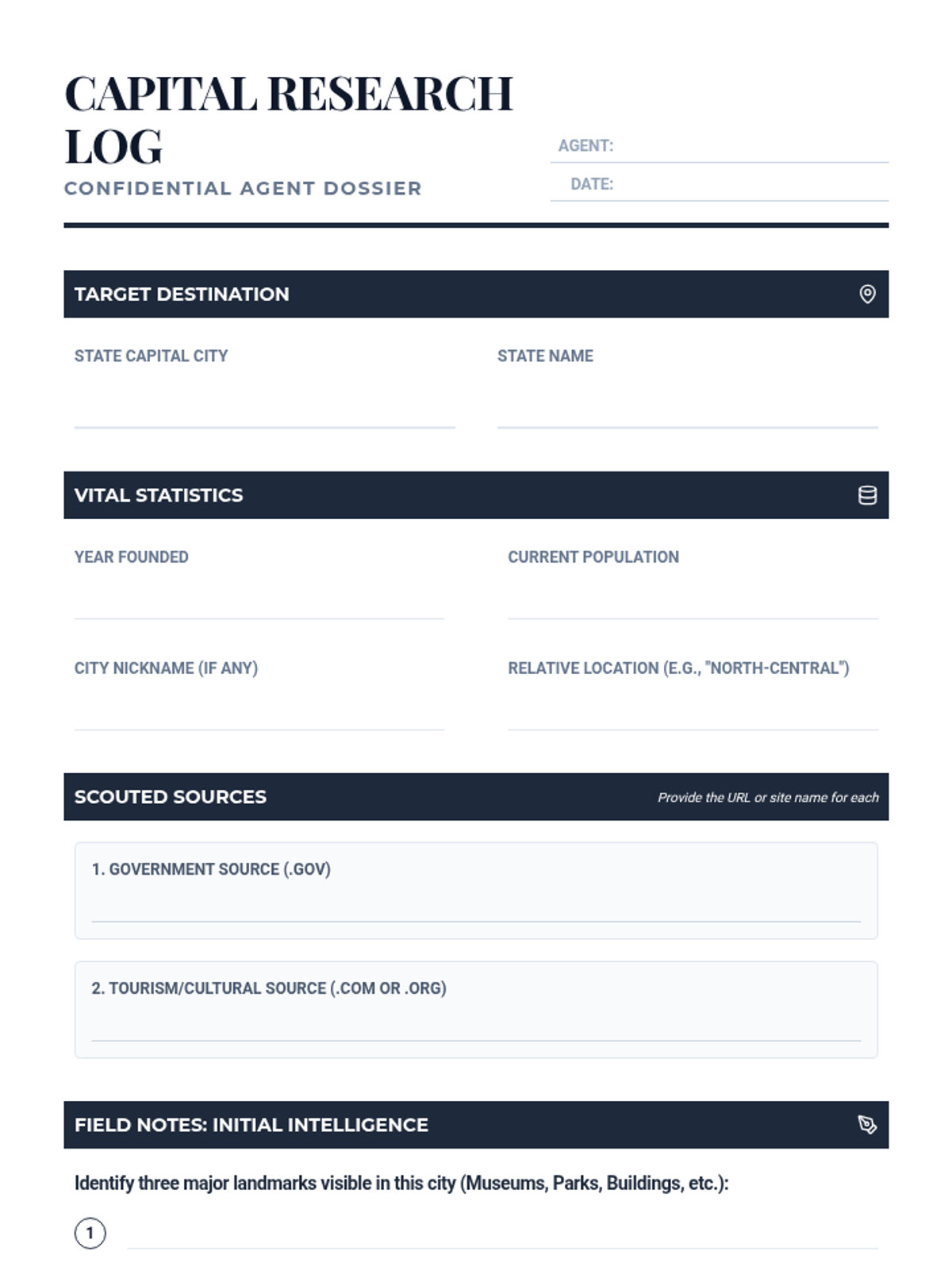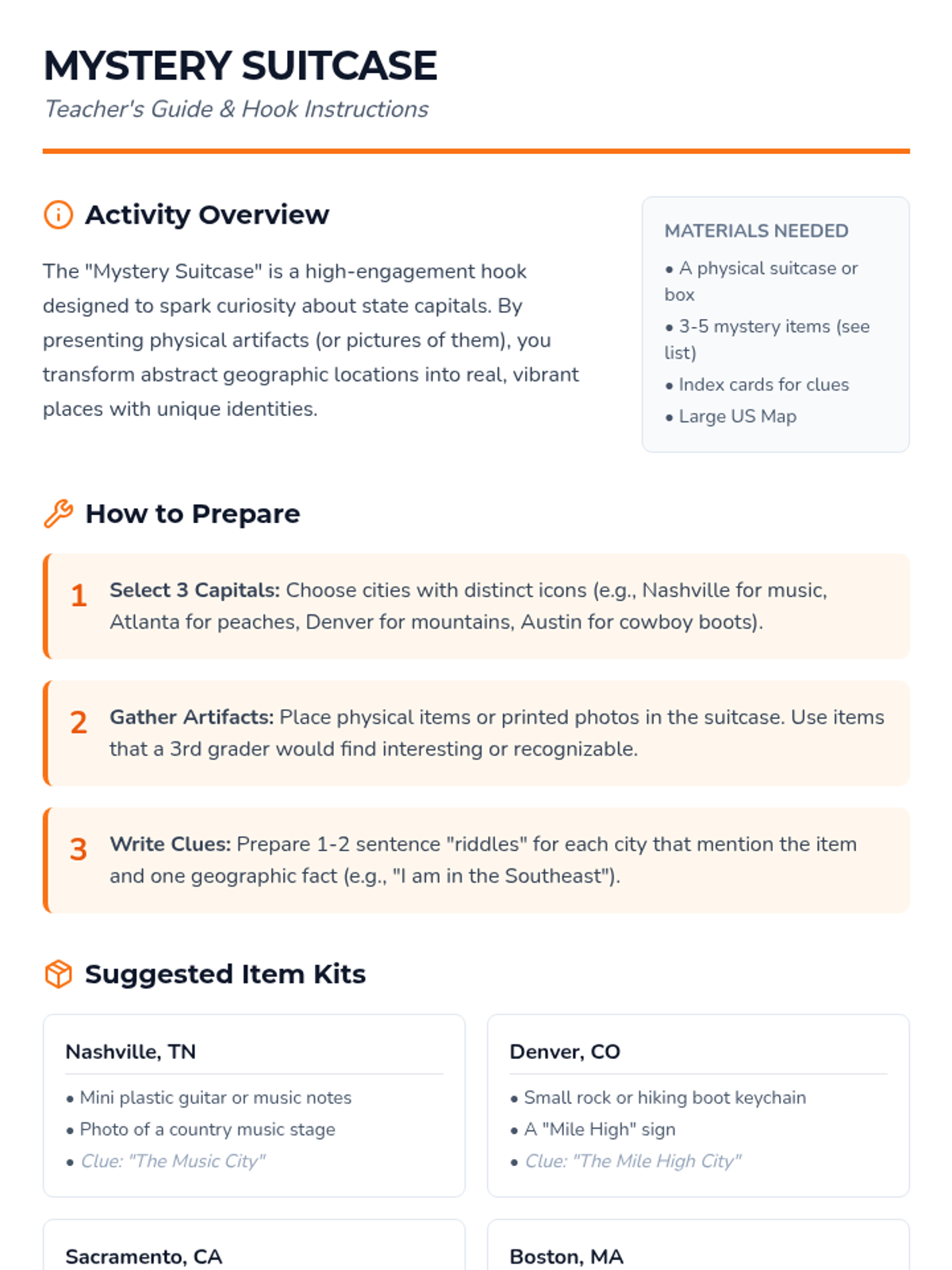 A project-based social studies unit where 3rd-grade students act as travel agents to research, design, and present travel guides for US state capitals. Students explore geography, architecture, and local history to understand what makes these cities unique.