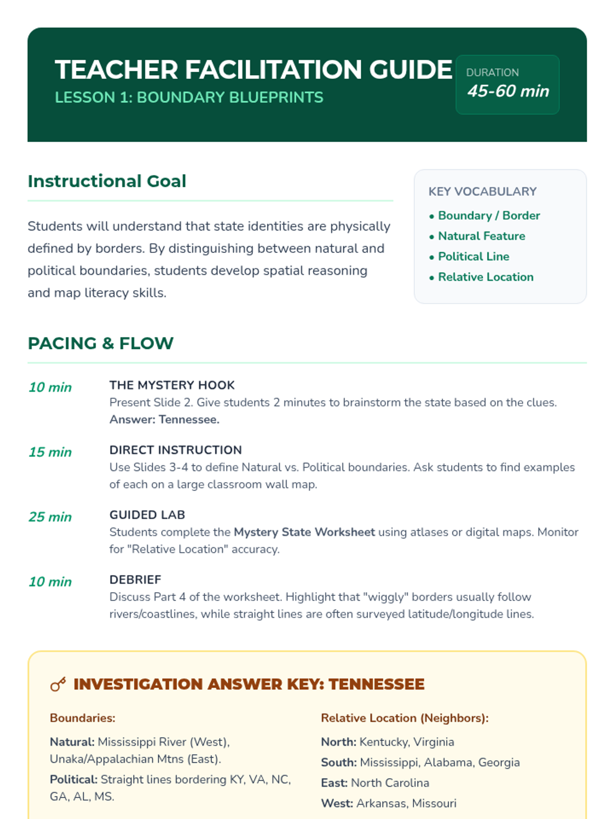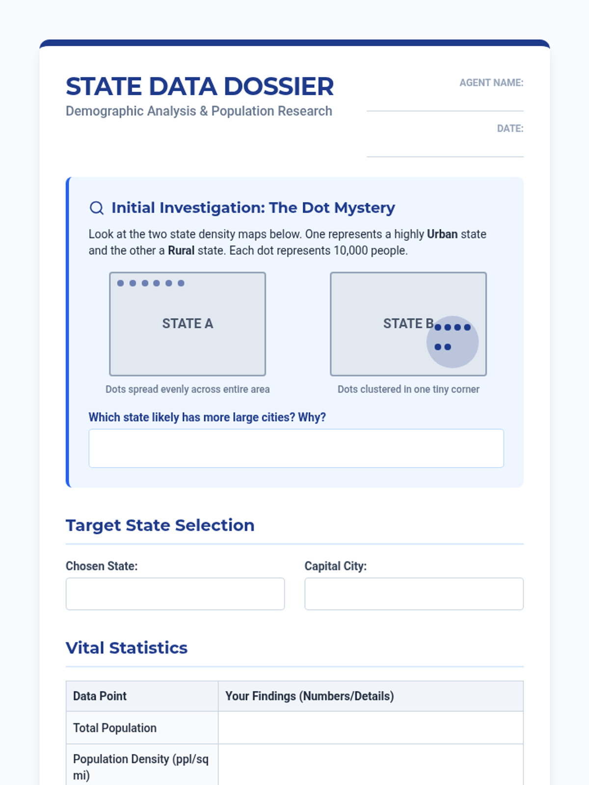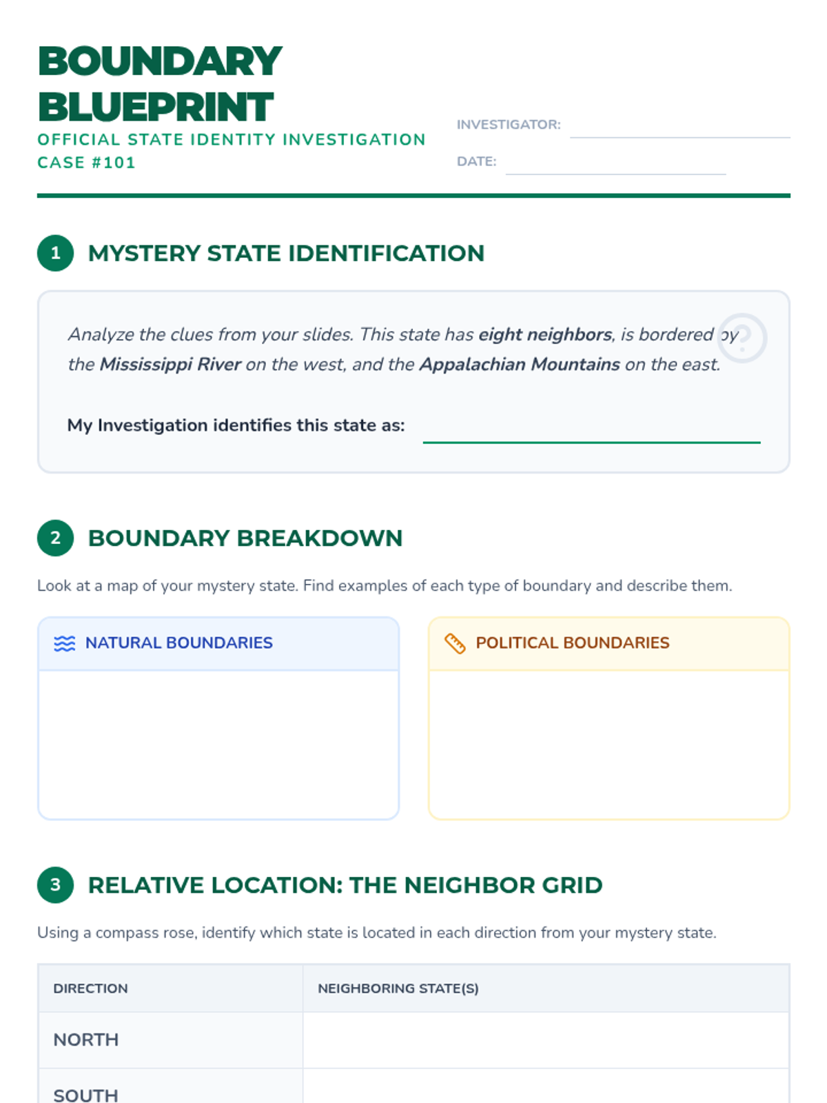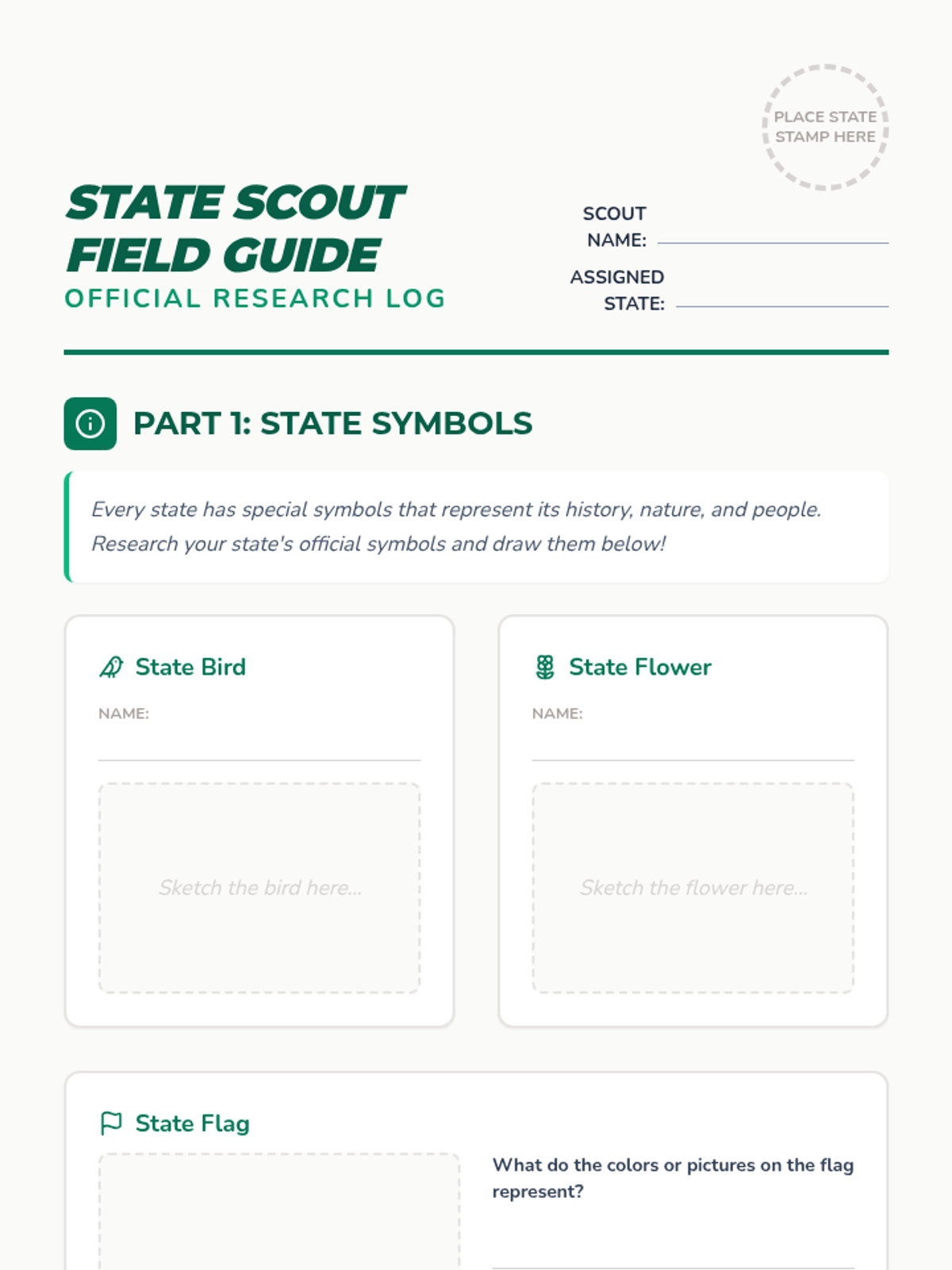 A 5th-grade Social Studies sequence where students act as state analysts, researching demographics, symbols, governance, and environment to understand what gives a state its unique identity.