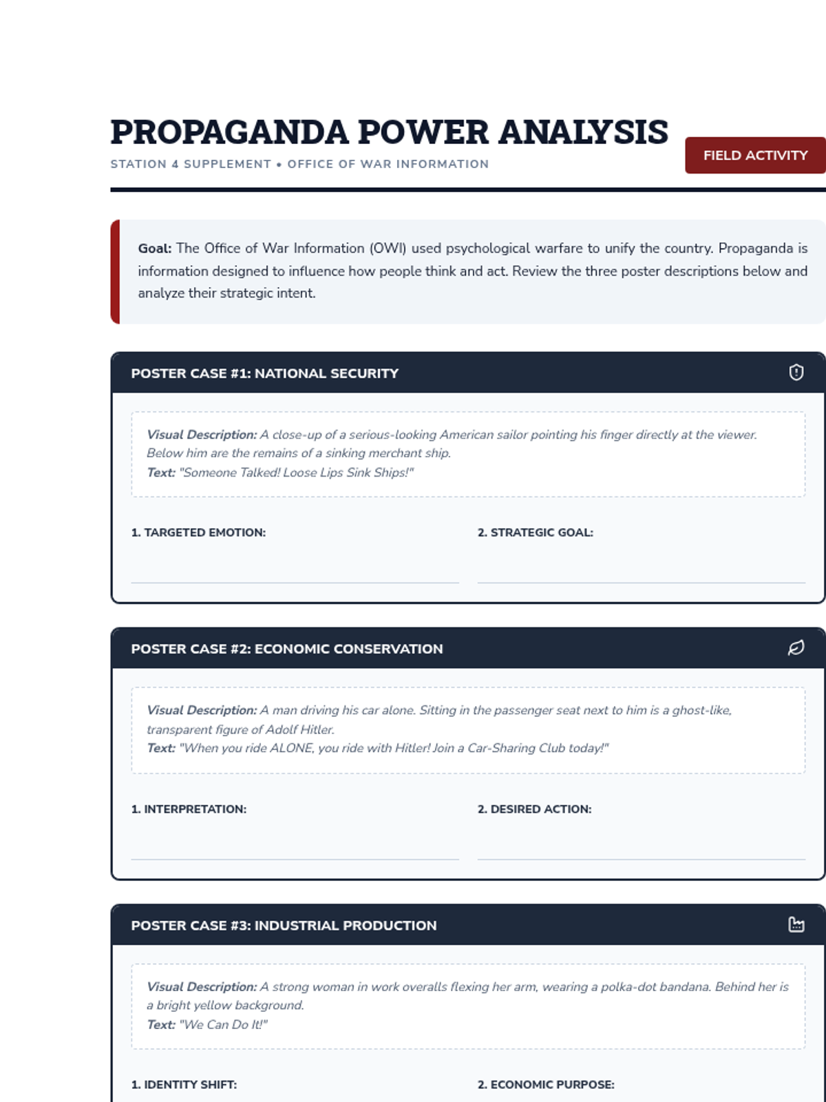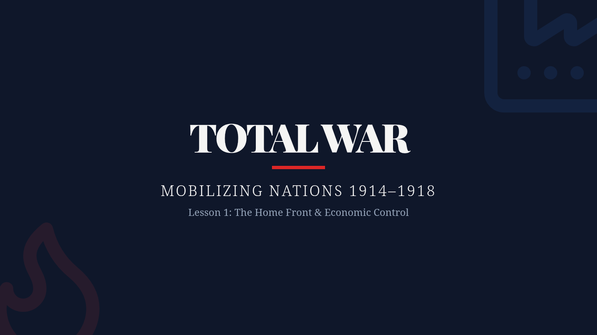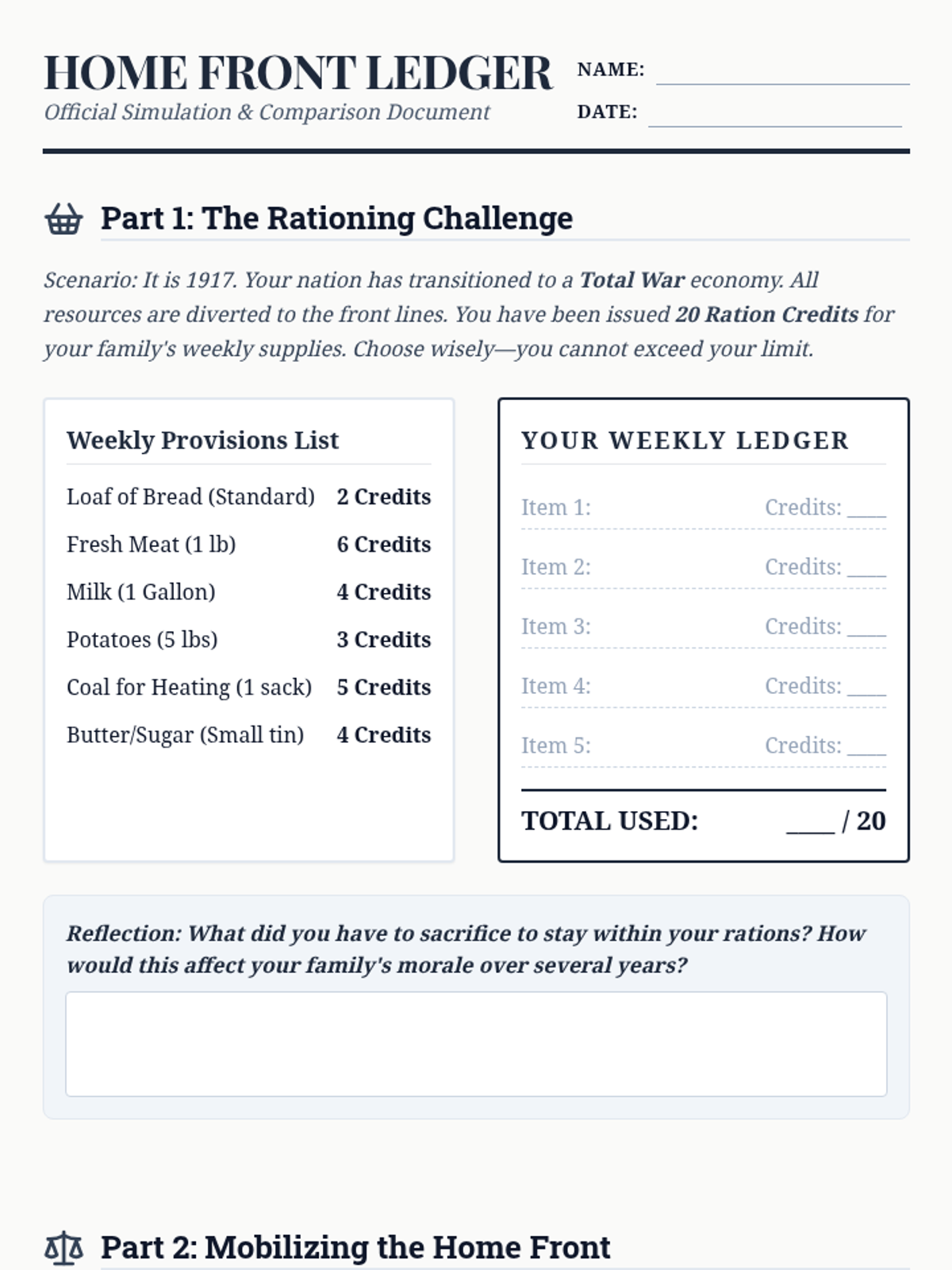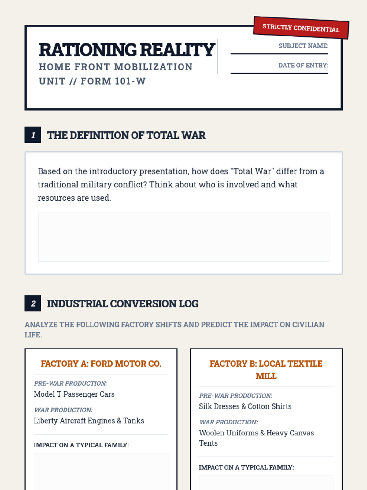 This sequence explores the concept of 'Total War' during WWI, focusing on how nations mobilized entire populations, the role of women, the impact of rationing, and the use of propaganda to shape public opinion. Students will analyze the US entry into the war and the global contributions of colonial troops, culminating in a creative media project.