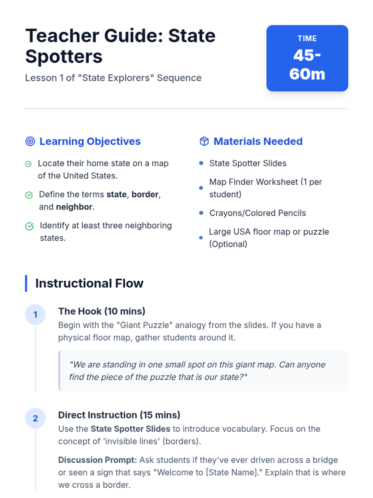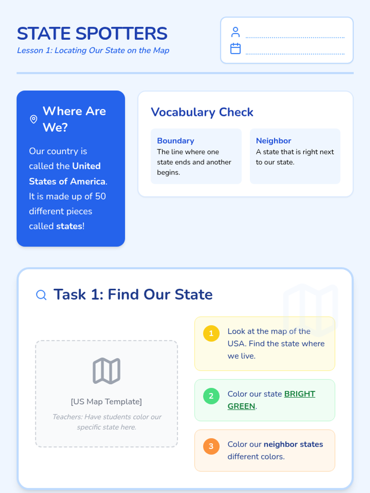 A project-based sequence where 3rd-grade students research a specific state's symbols, climate, resources, and landmarks to understand how environment and history shape state identity, culminating in a 'State Float' presentation.