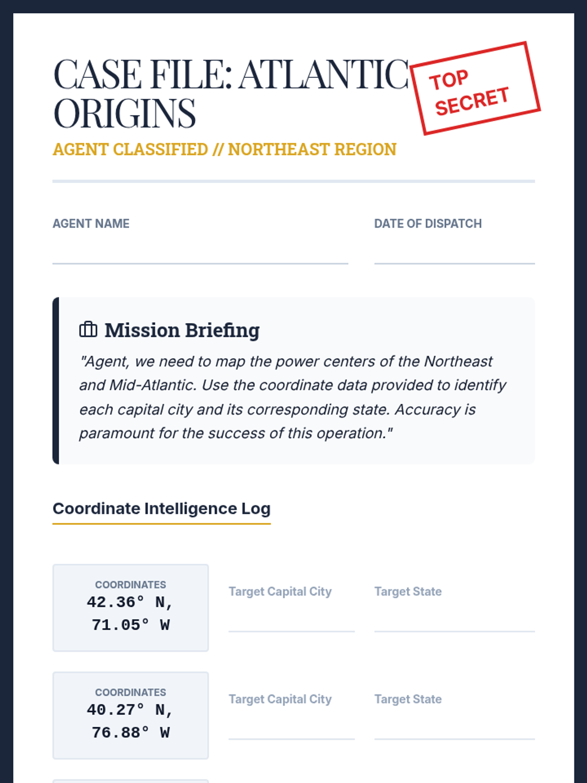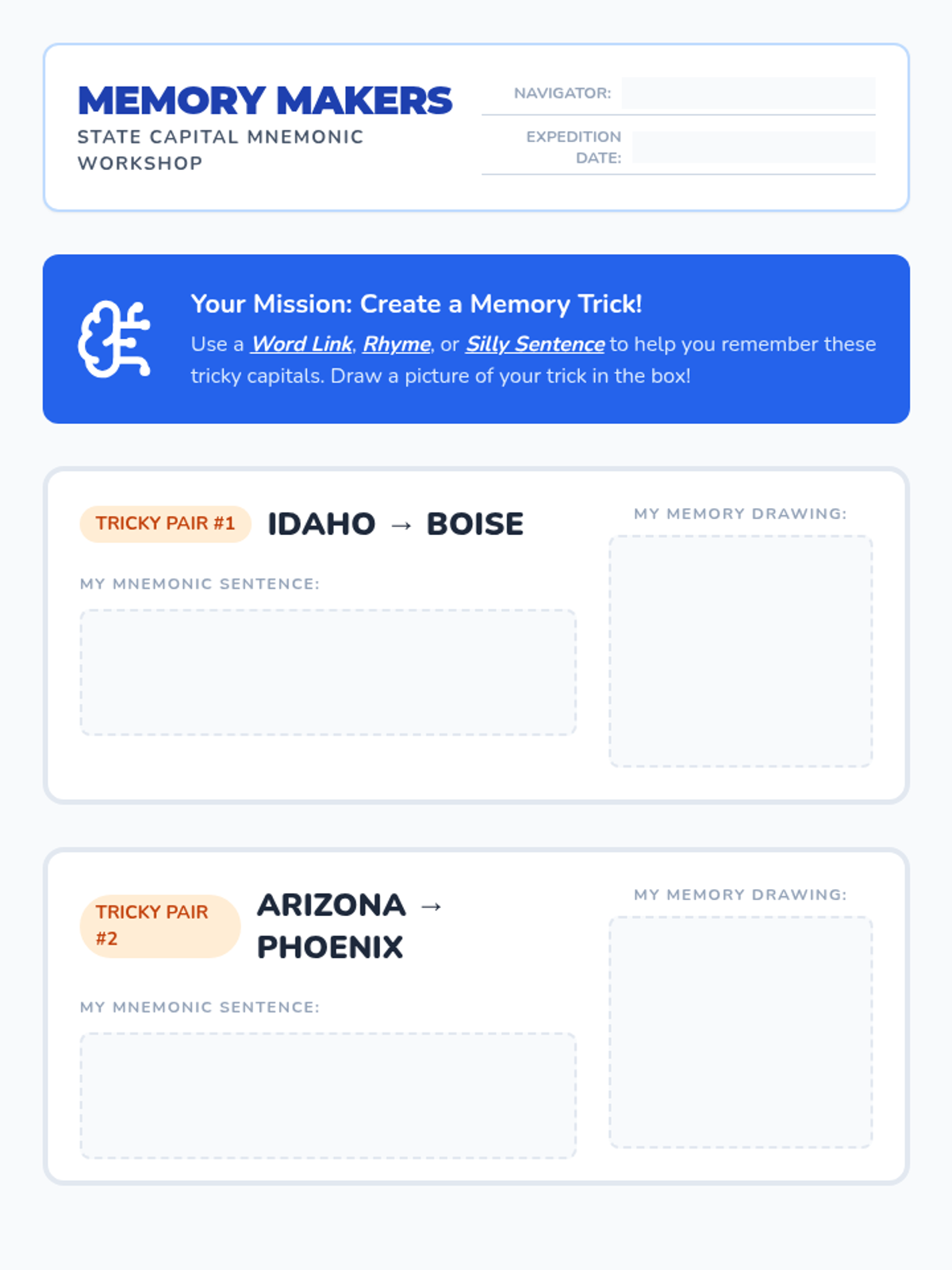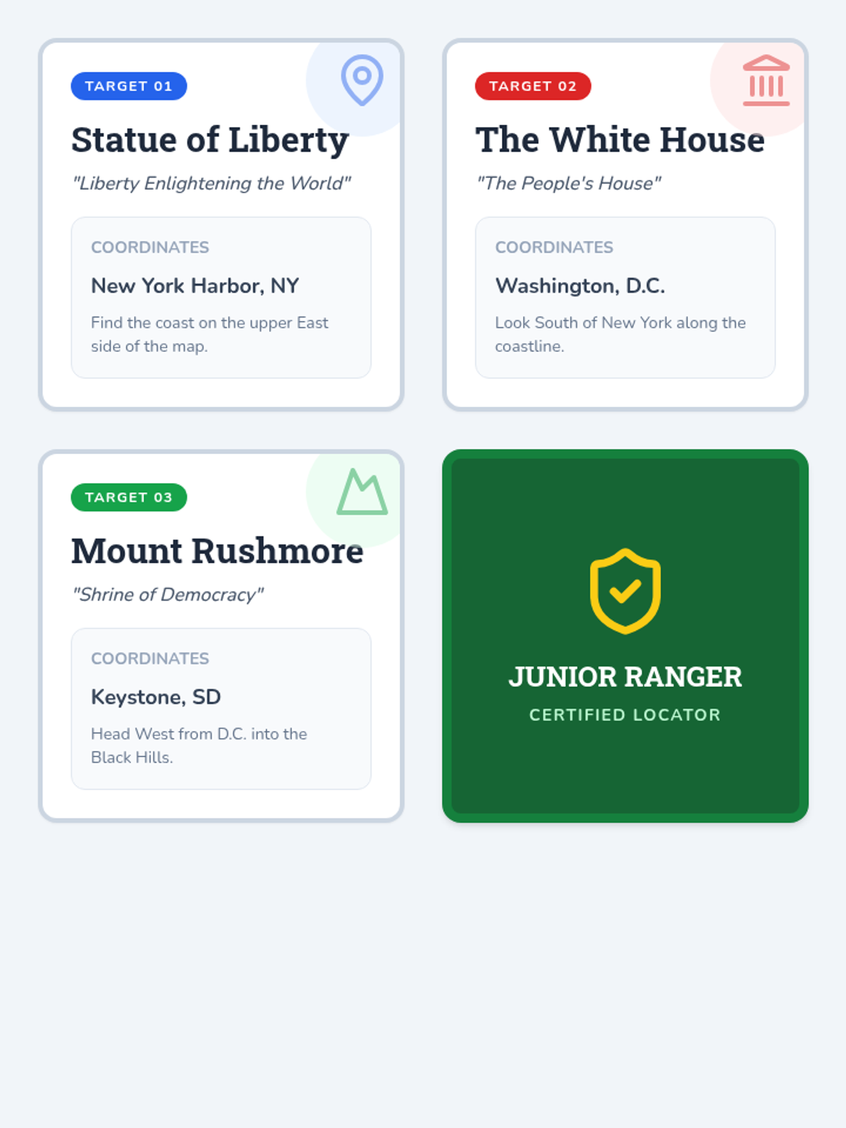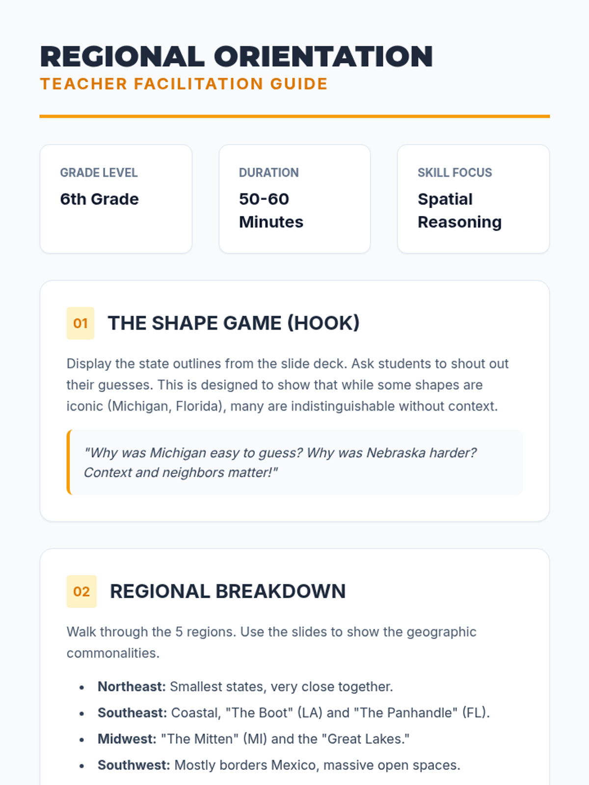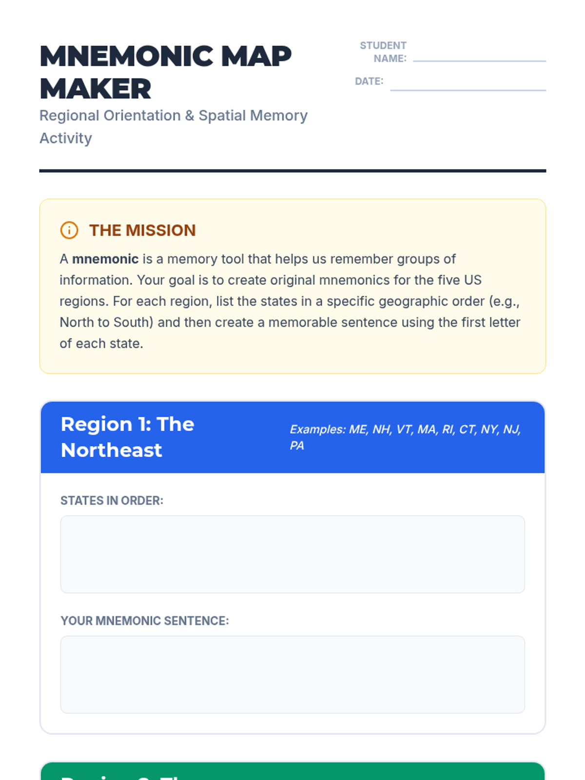 A game-based sequence designed to build mastery of spatial geography through competitive challenges, mnemonics, and gamified practice, progressing from regional identification to national mastery.