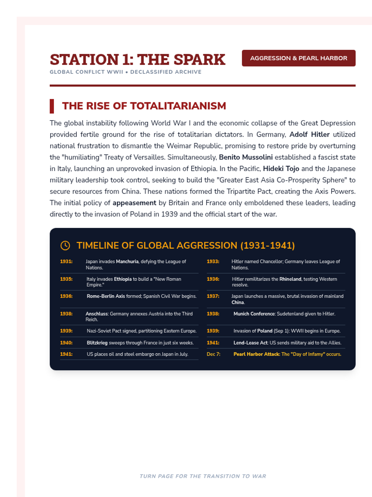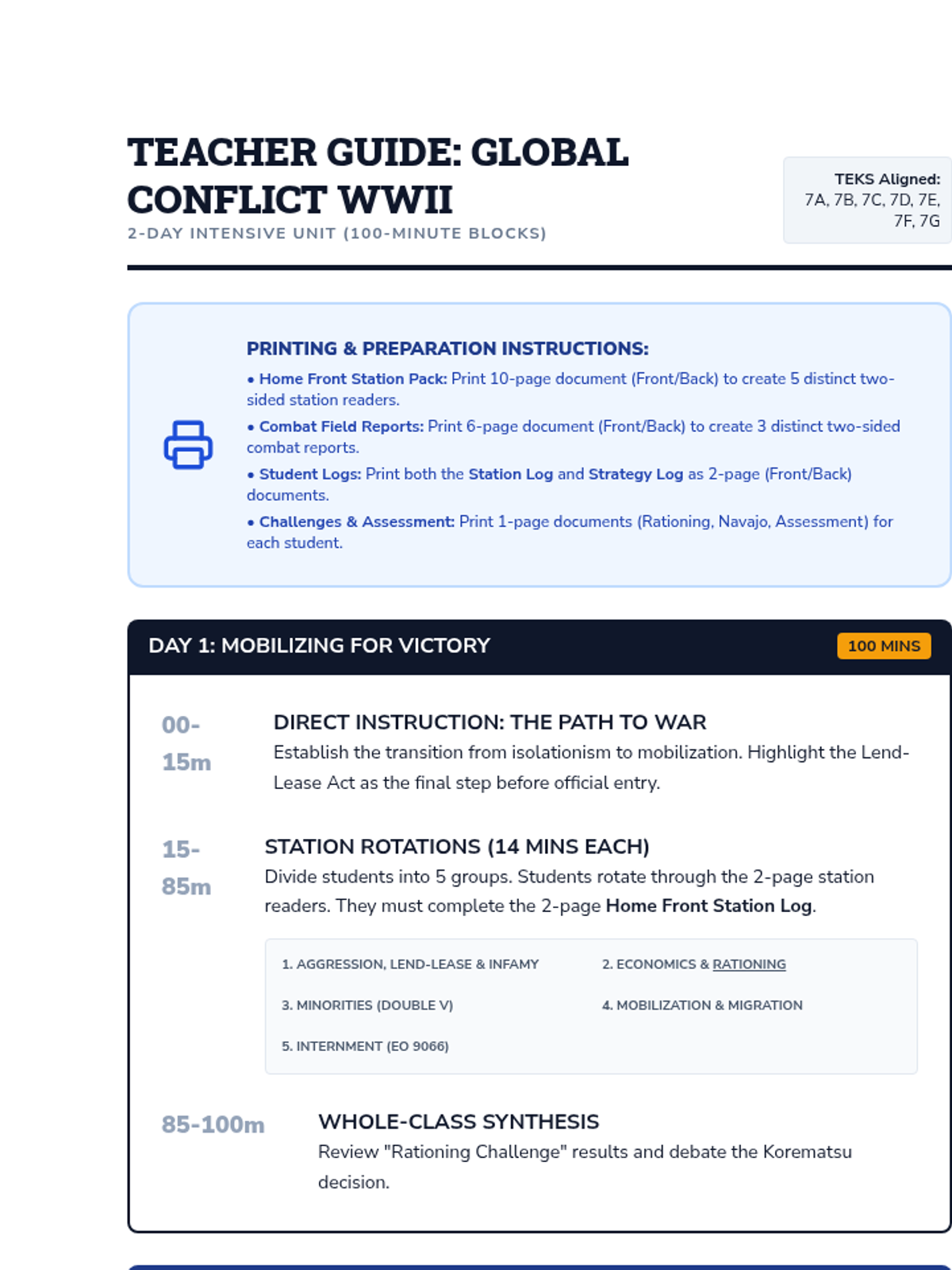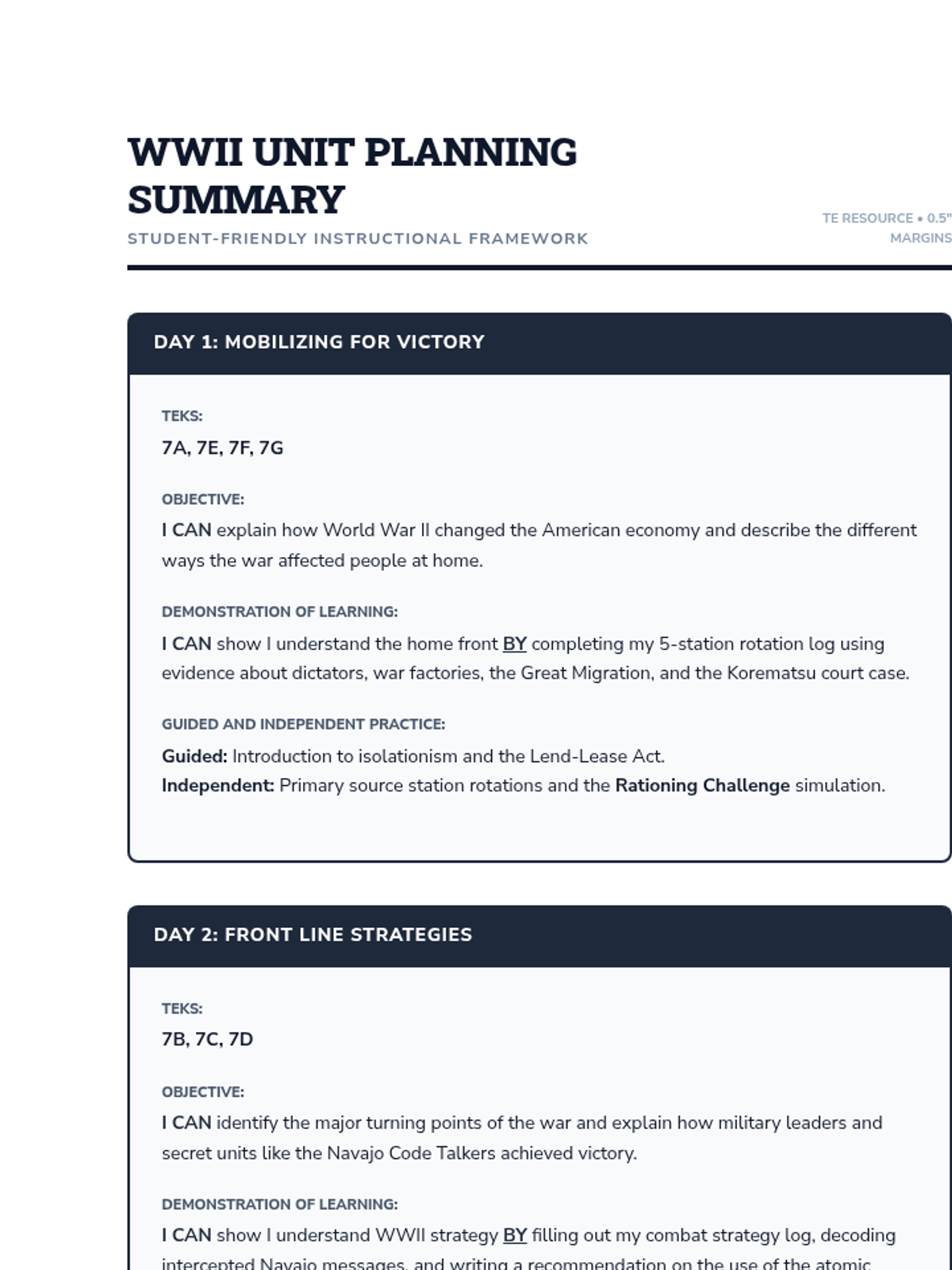 A comprehensive 7th-grade history sequence exploring the military geography and strategic shifts of WWII. Students analyze 'Blitzkrieg', the technology of Radar, the environmental challenges of Stalingrad and D-Day, the logistics of the Pacific 'Island Hopping' campaign, and the vital role of Navajo Code Talkers.