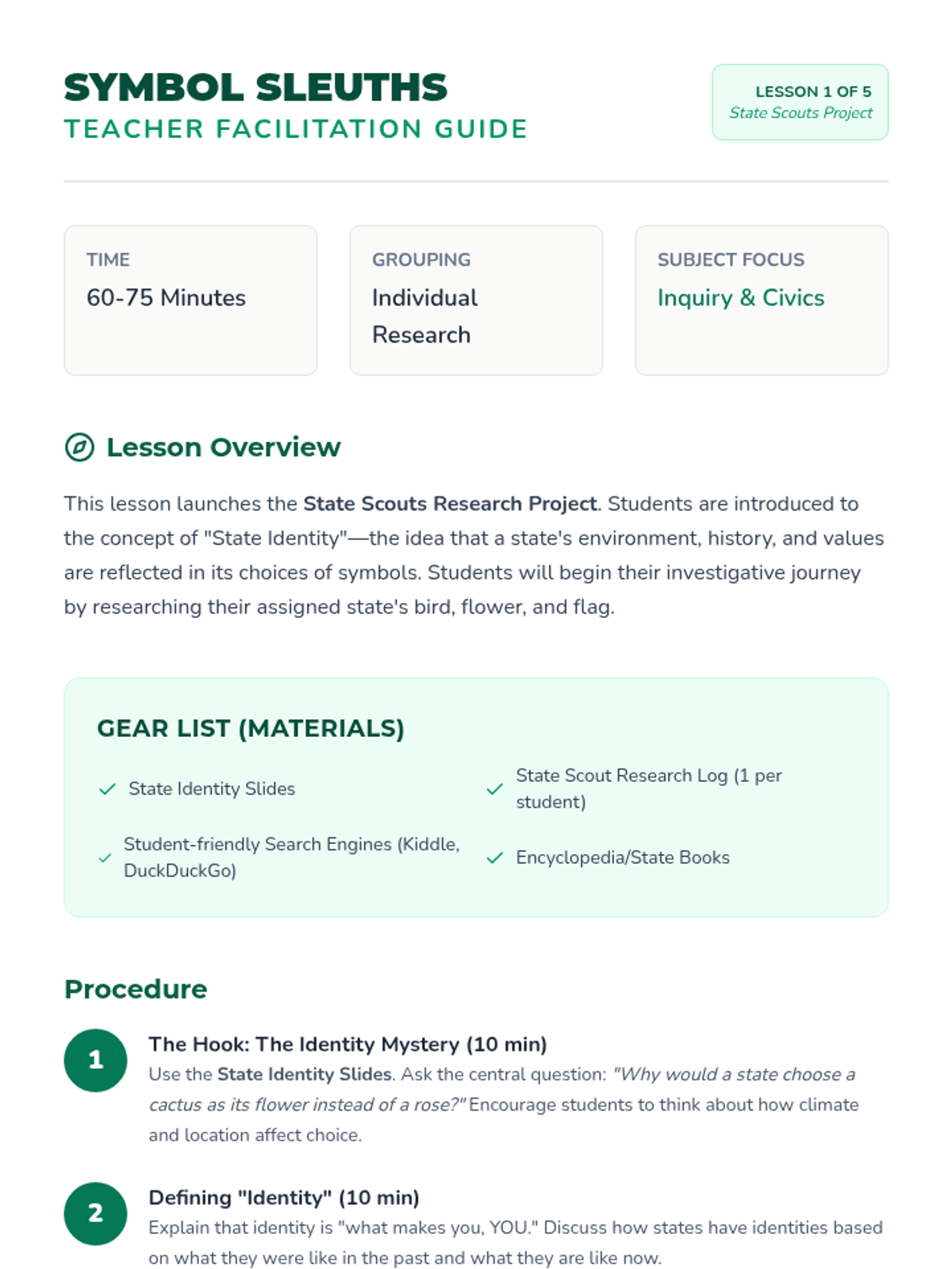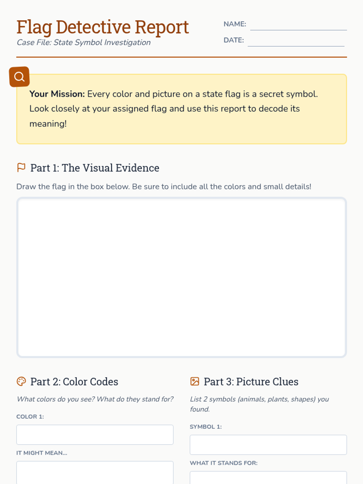 An inquiry-based exploration of state symbols, mottos, and cultural identity for 2nd-grade students. Learners investigate why specific symbols are chosen to represent a state's geography and history, culminating in a creative design project.