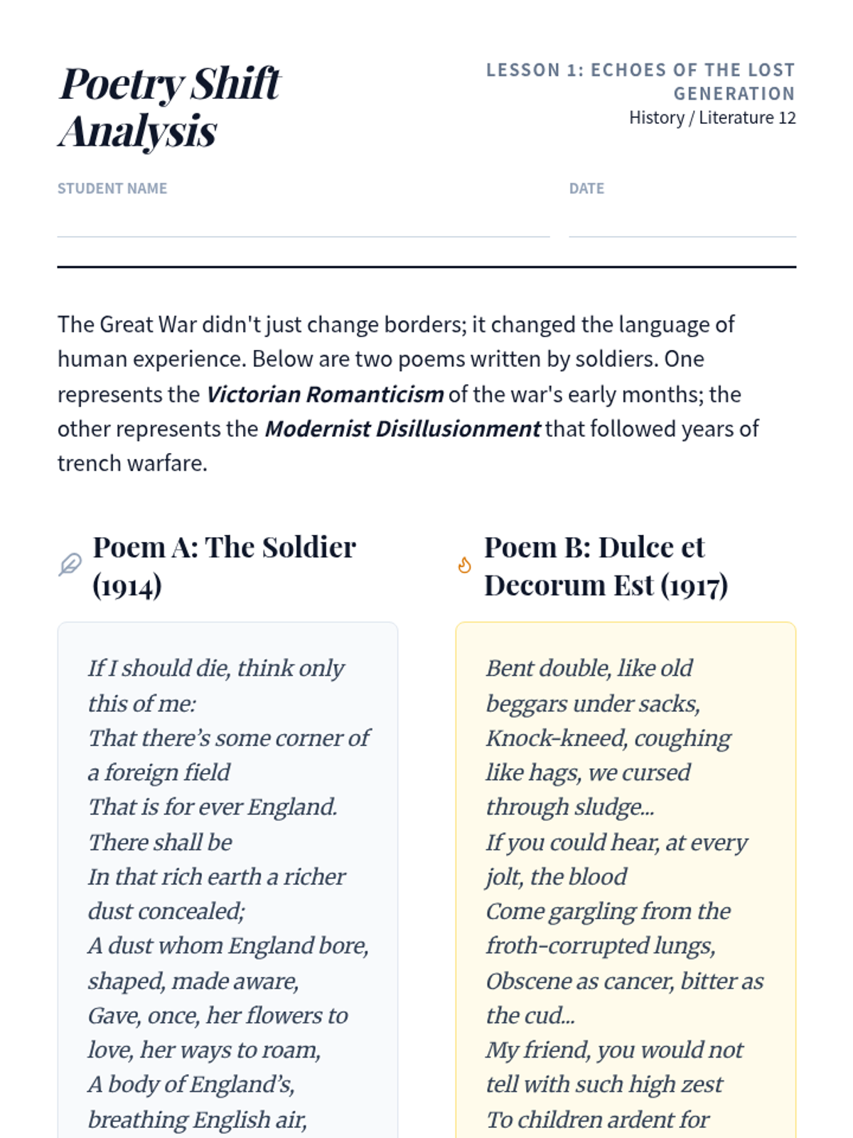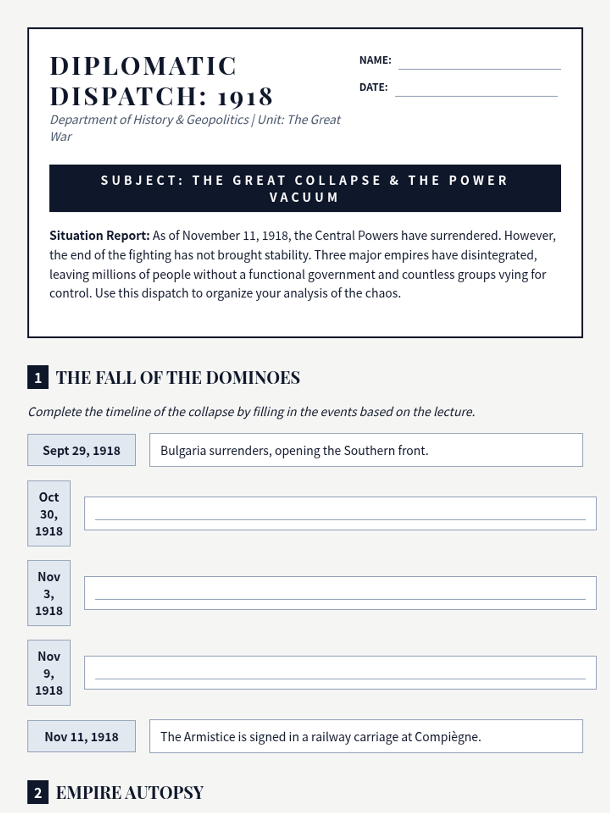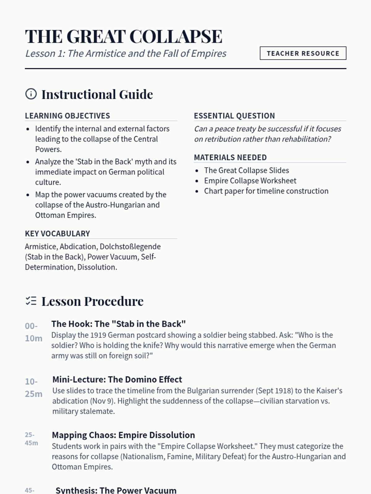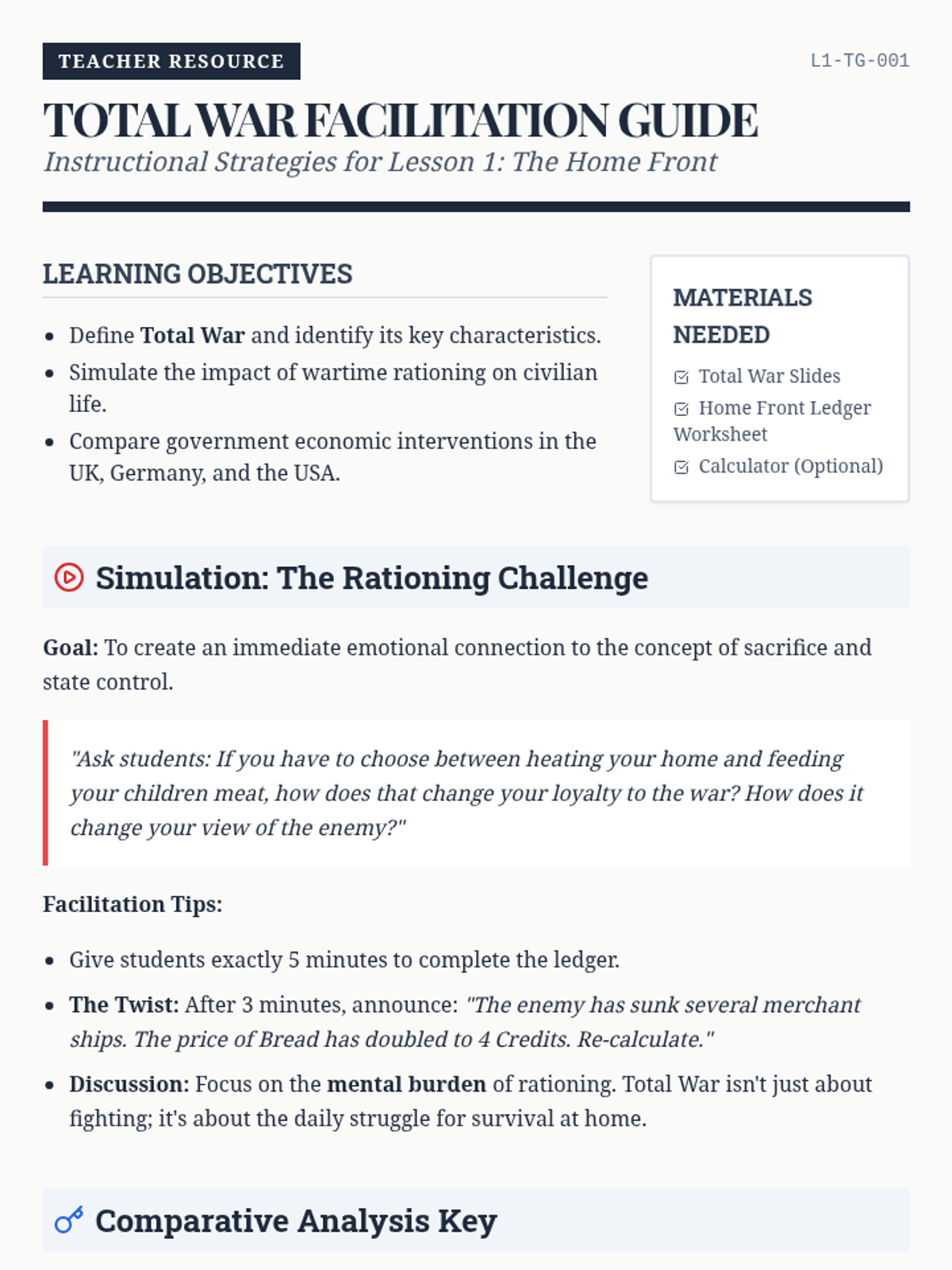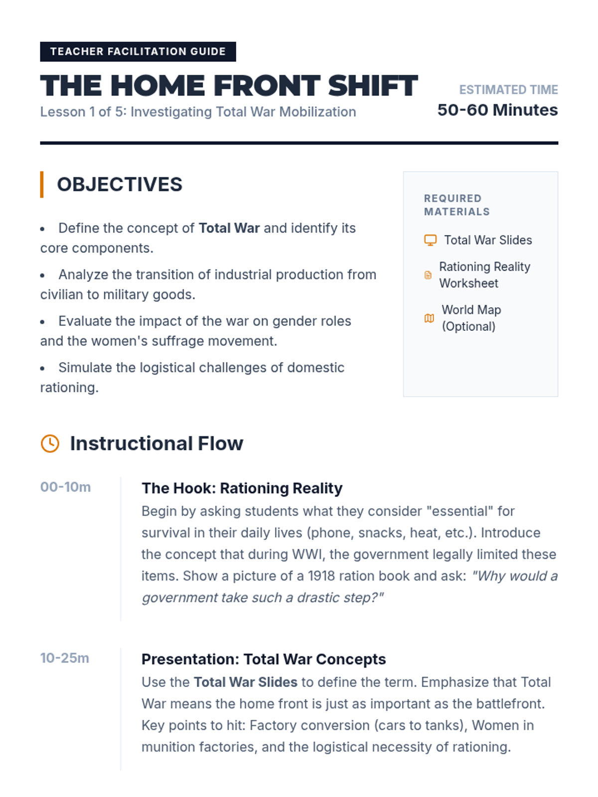 A comprehensive 5-lesson unit for 9th-grade students exploring the concept of Total War during WWI, focusing on the home front, propaganda, women's roles, colonial involvement, and the Armenian Genocide.