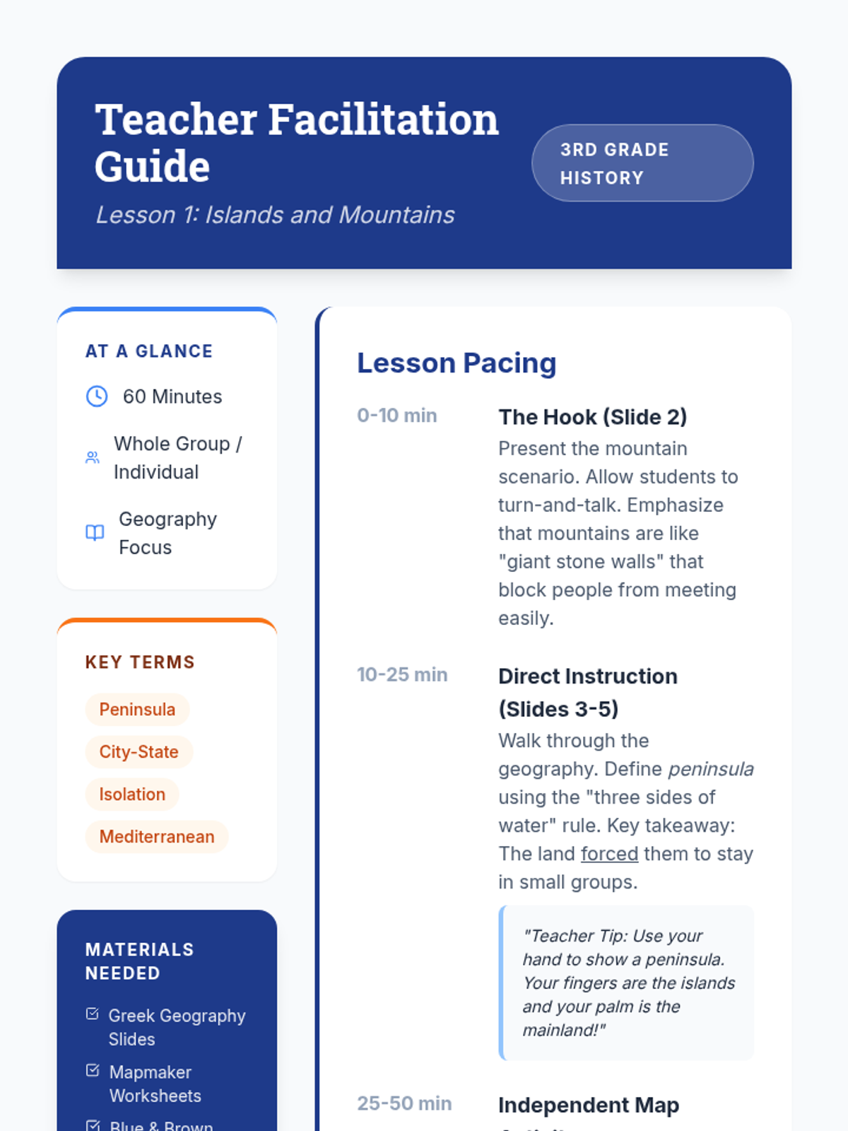 A comprehensive 5-lesson sequence for 3rd graders focused on the physical geography of Australia, New Zealand, and the Pacific Islands. Students develop cartography skills, spatial awareness, and an understanding of diverse Oceanic landforms through hands-on mapping projects and comparative analysis.