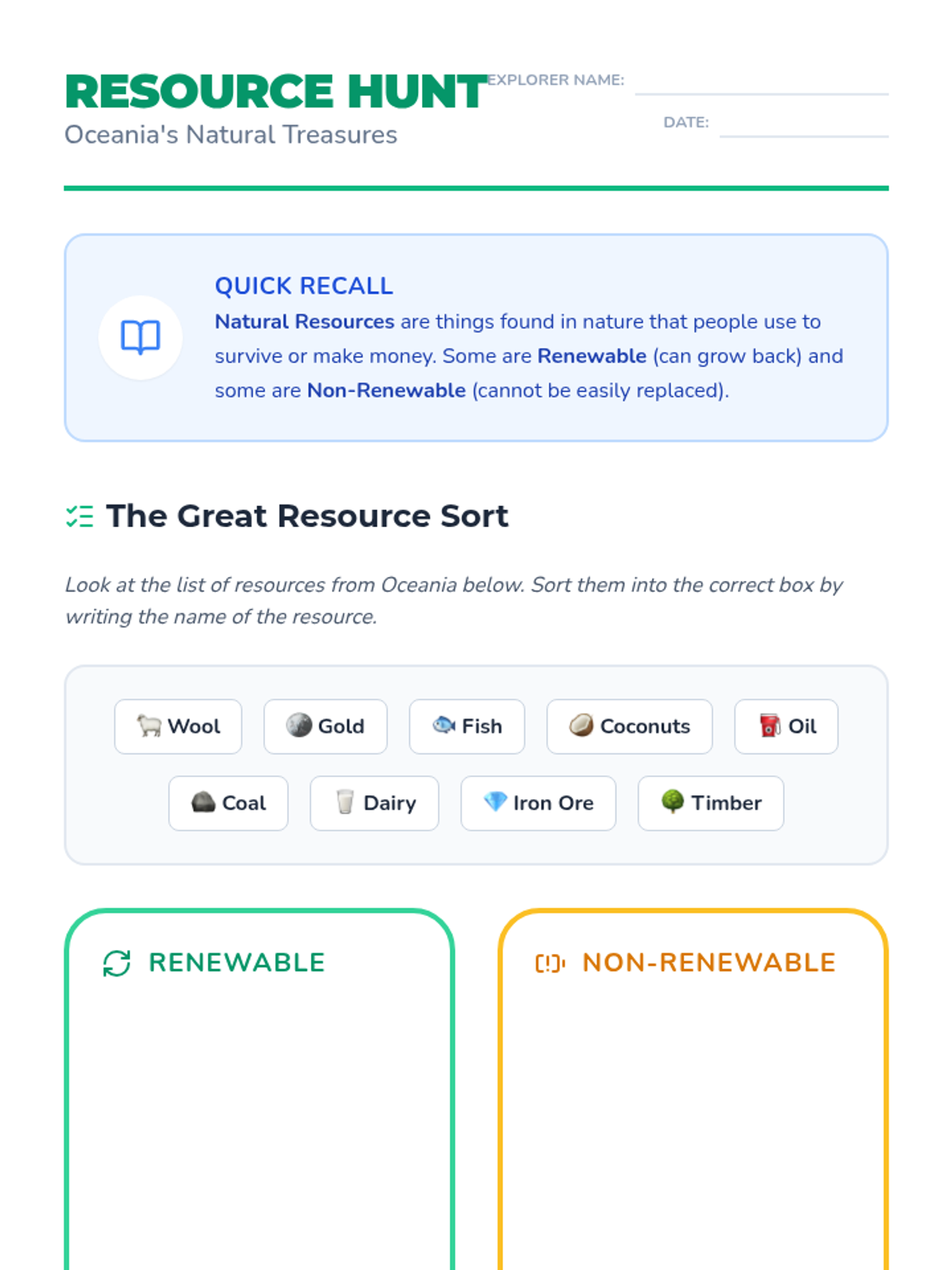 A 5-lesson unit for 3rd-grade students exploring the natural resources and economies of Oceania, from Australia's sheep farms to the versatile coconut palms of the Pacific Islands, culminating in a trade simulation.