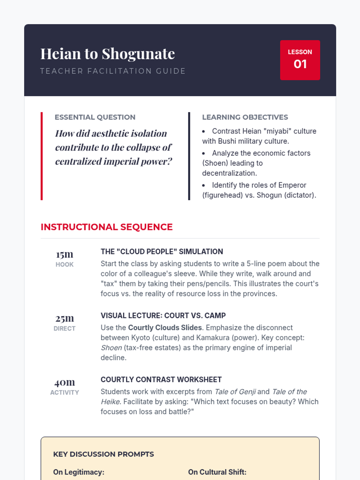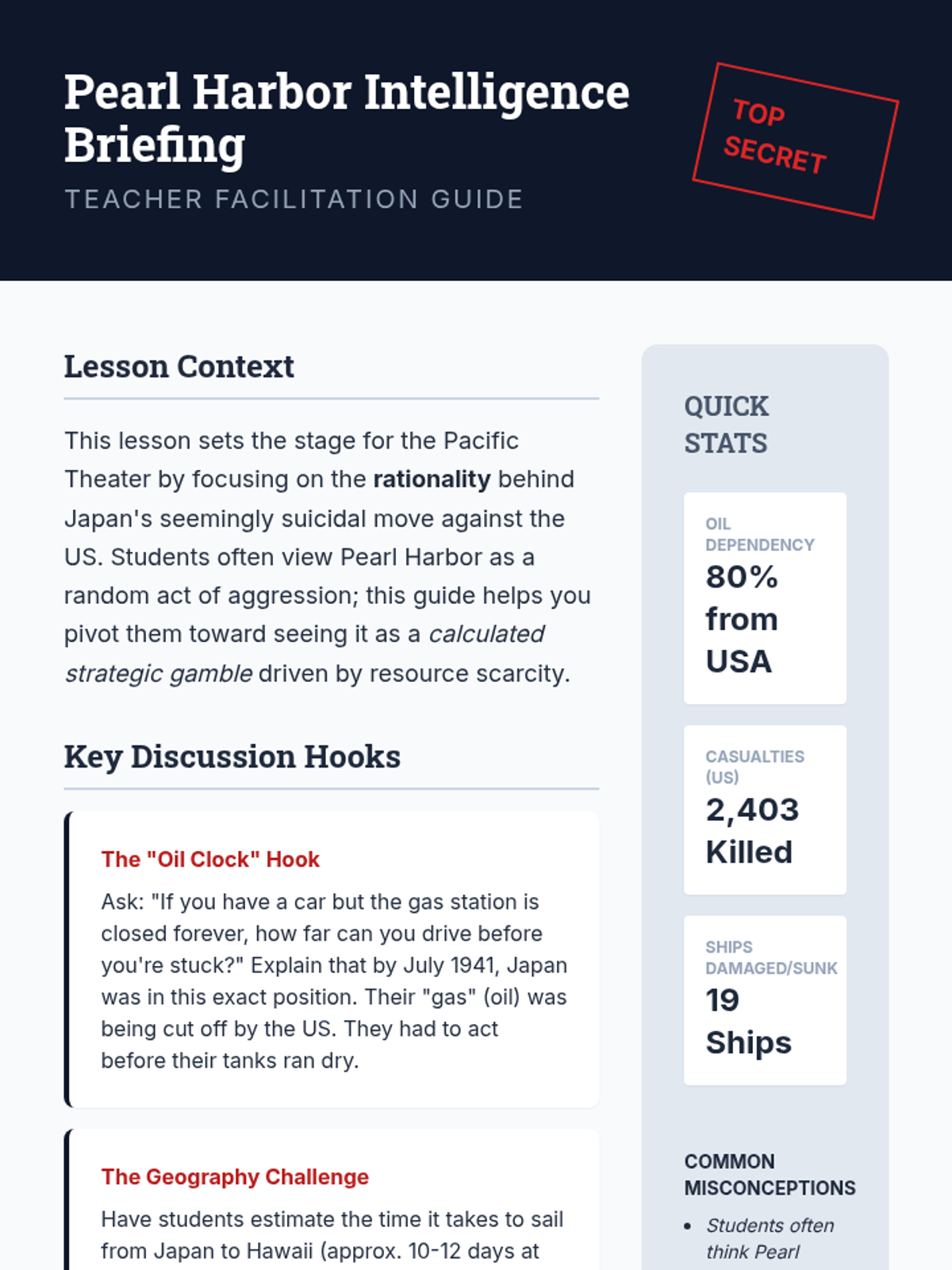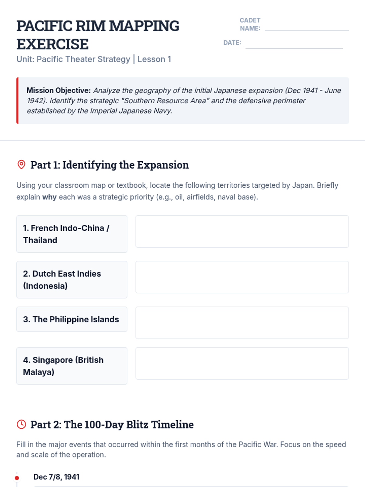 A comprehensive sequence for 10th Grade World History focusing on the strategic, geographical, and cultural dimensions of the Pacific Theater during World War II. Students analyze the shift from Japanese expansion to Allied 'island hopping' and evaluate the turning points that led to the war's conclusion.