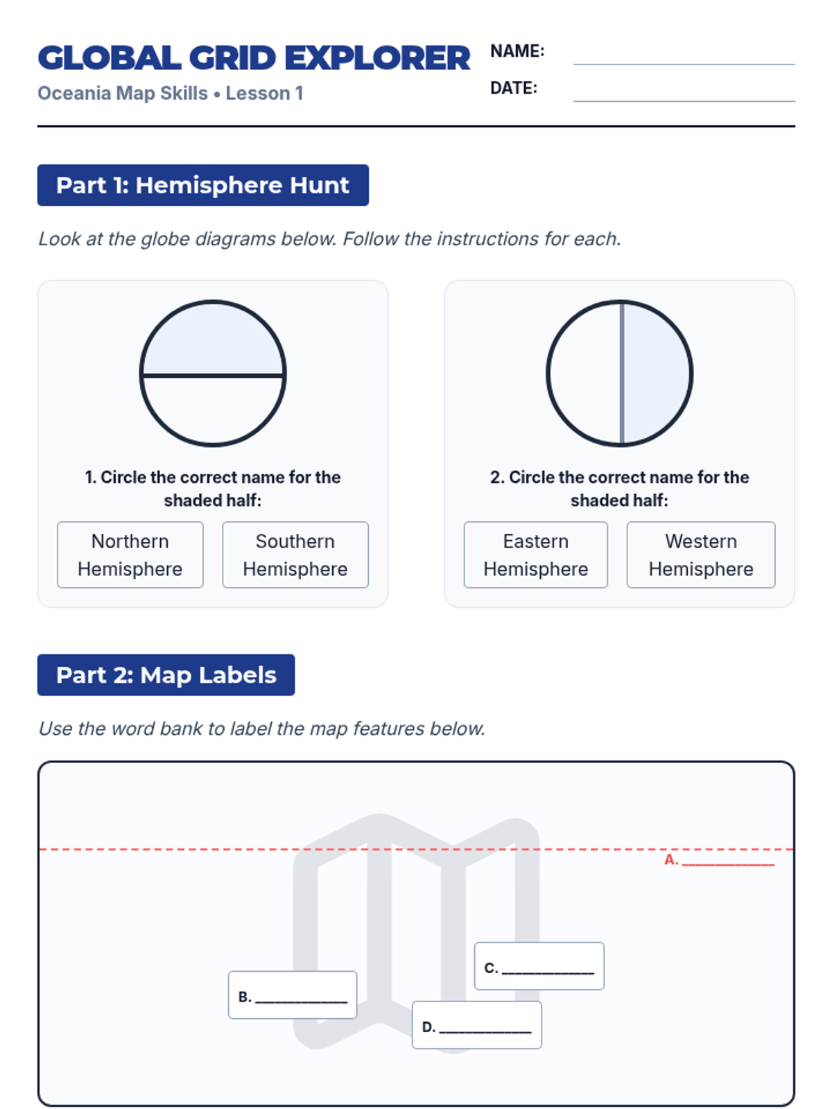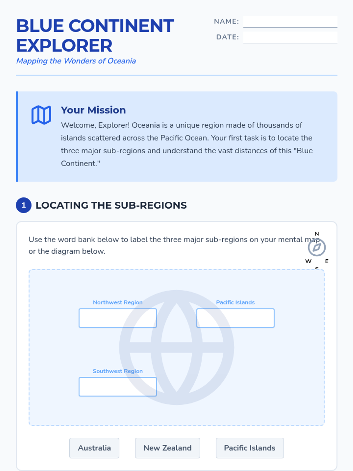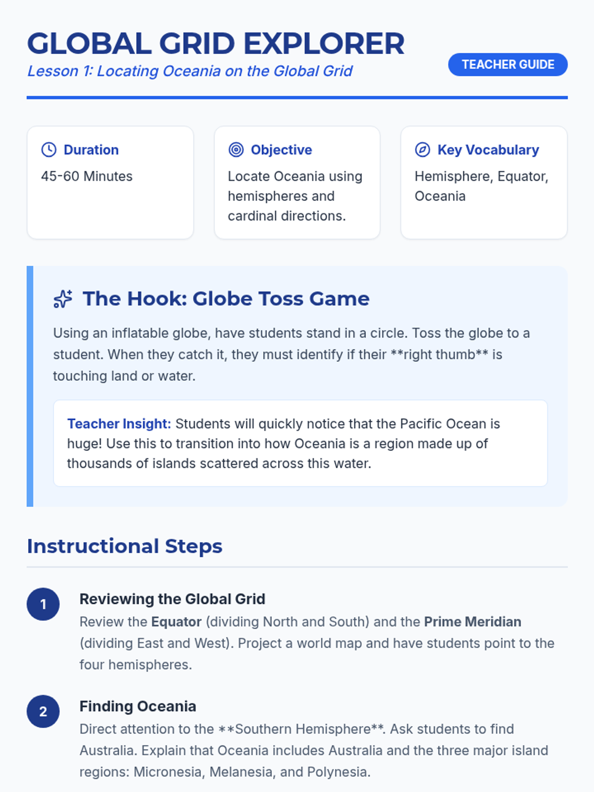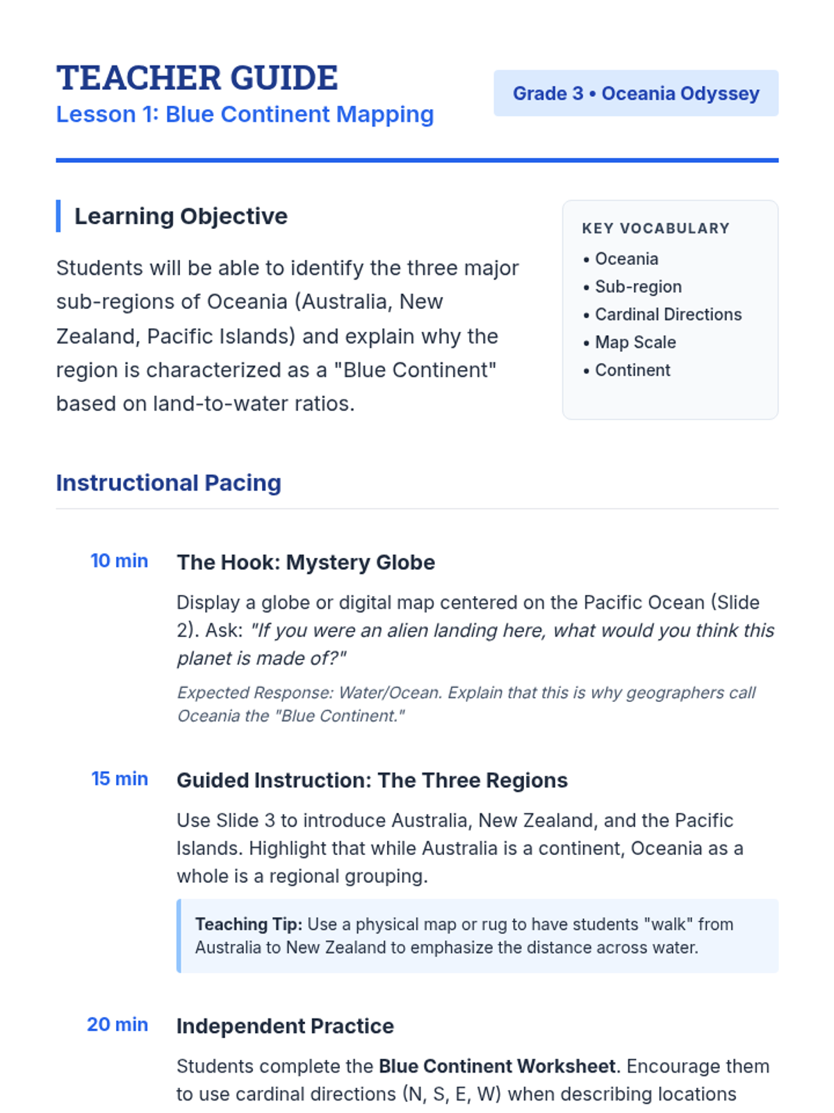 A geography sequence where 3rd-grade students explore the diverse physical landscapes of Oceania, from the vast Pacific Ocean to the Australian Outback and the volcanic peaks of New Zealand, culminating in an environmental design challenge.