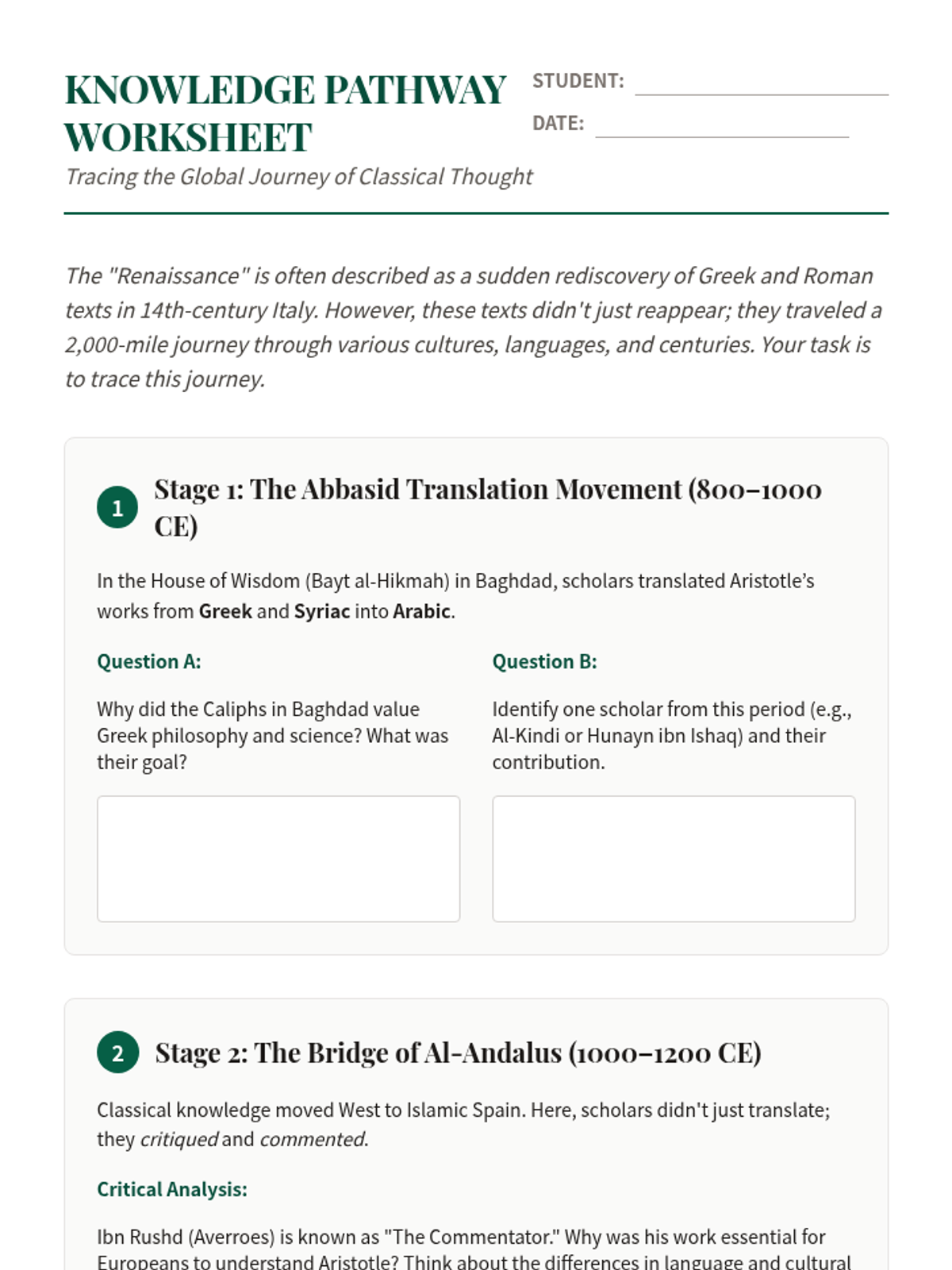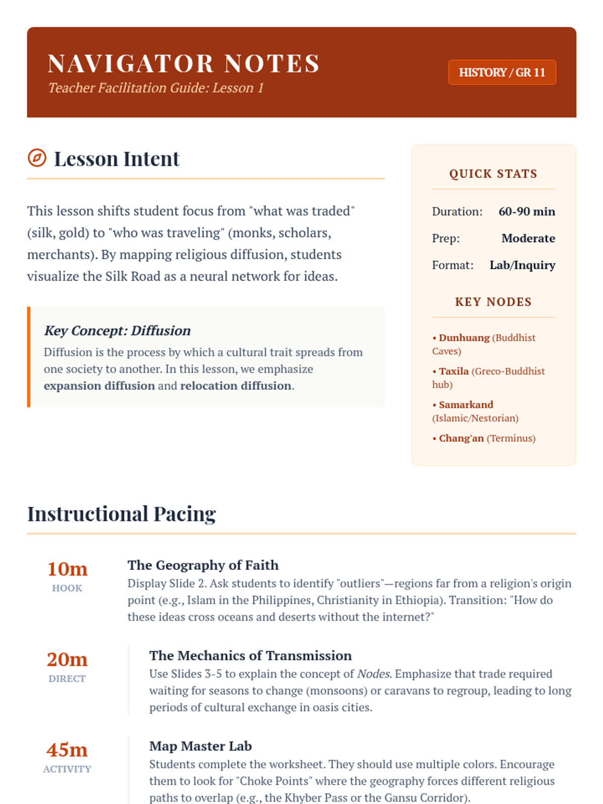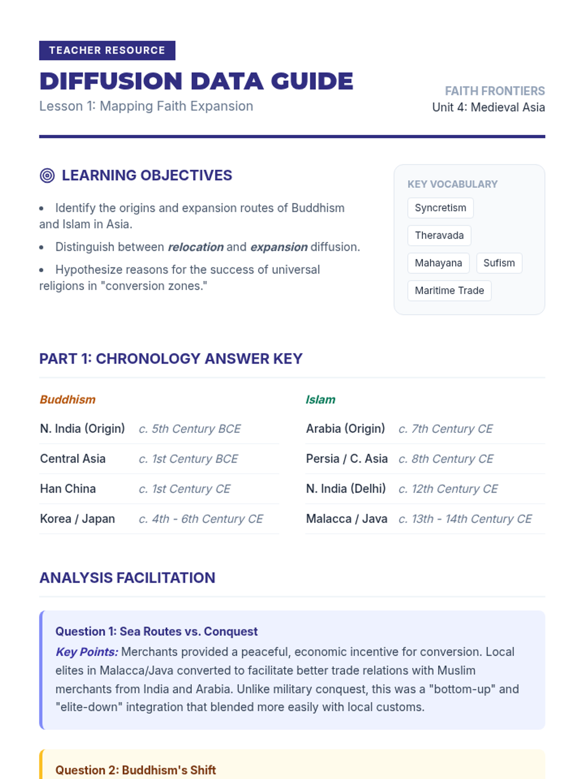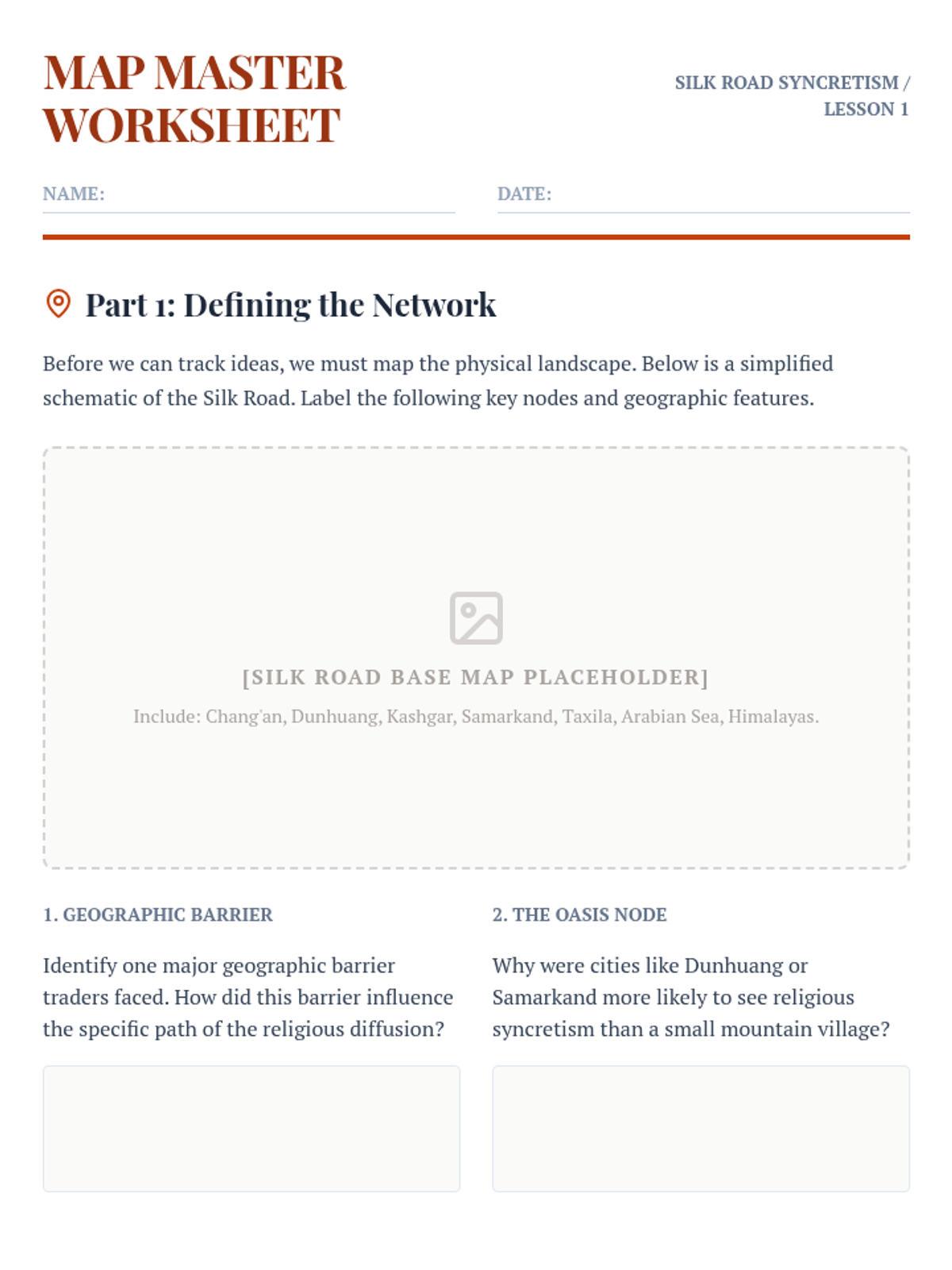 Explore the Silk Road as a vehicle for religious and cultural syncretism. Students track the spread and adaptation of Buddhism, Islam, and Nestorian Christianity across Asia, culminating in a curated digital museum exhibit.