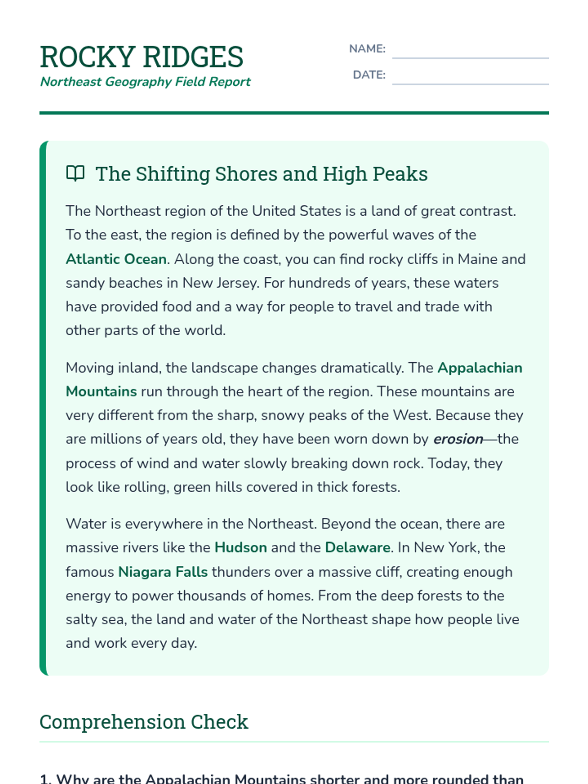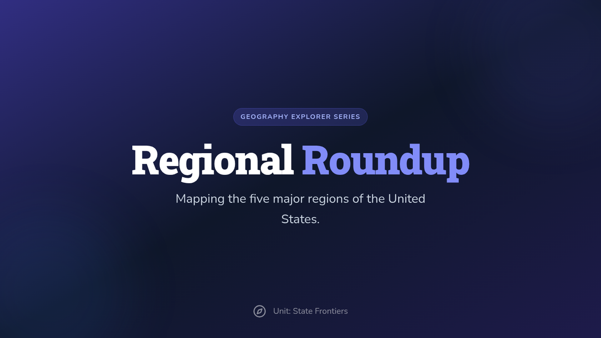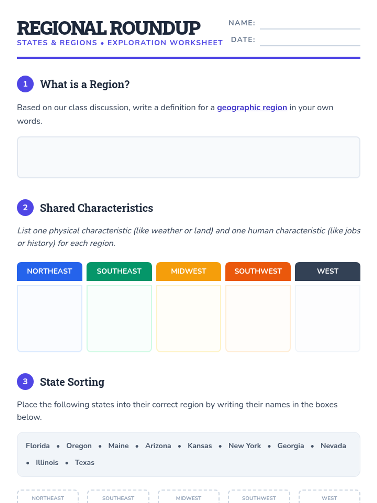 Regions of the United StatesDistinct physical features, climates, and natural resources across the Northeast, Southeast, Midwest, Southwest, and West. Examines how geographic characteristics shape regional economies, cultures, and human-environment interactions.
