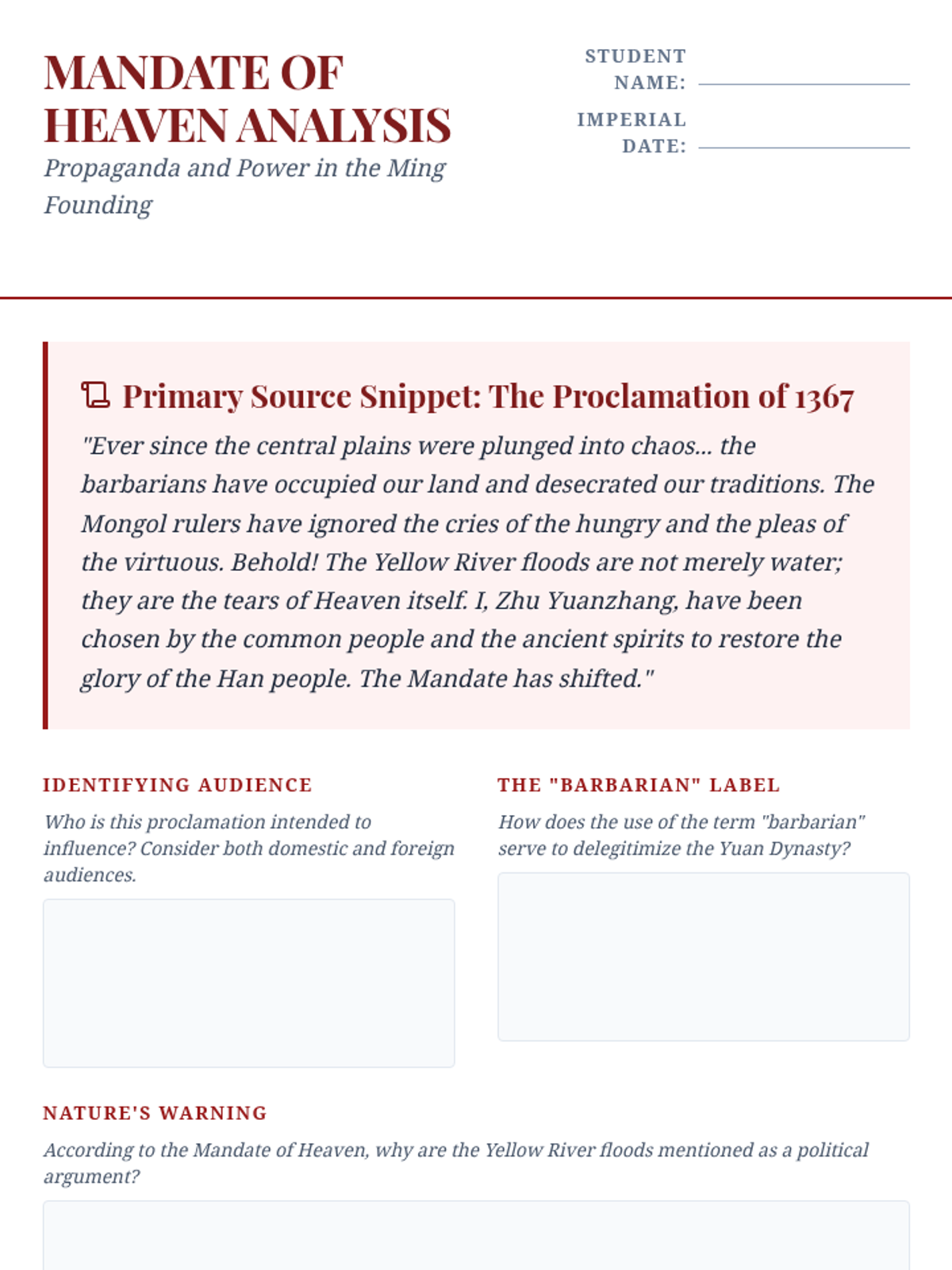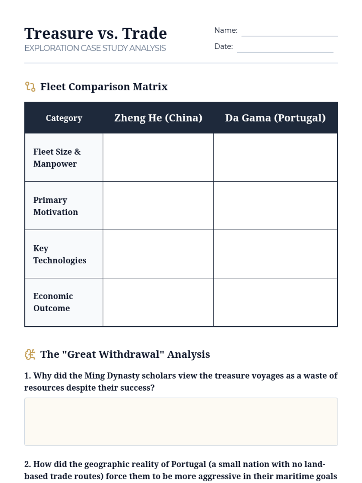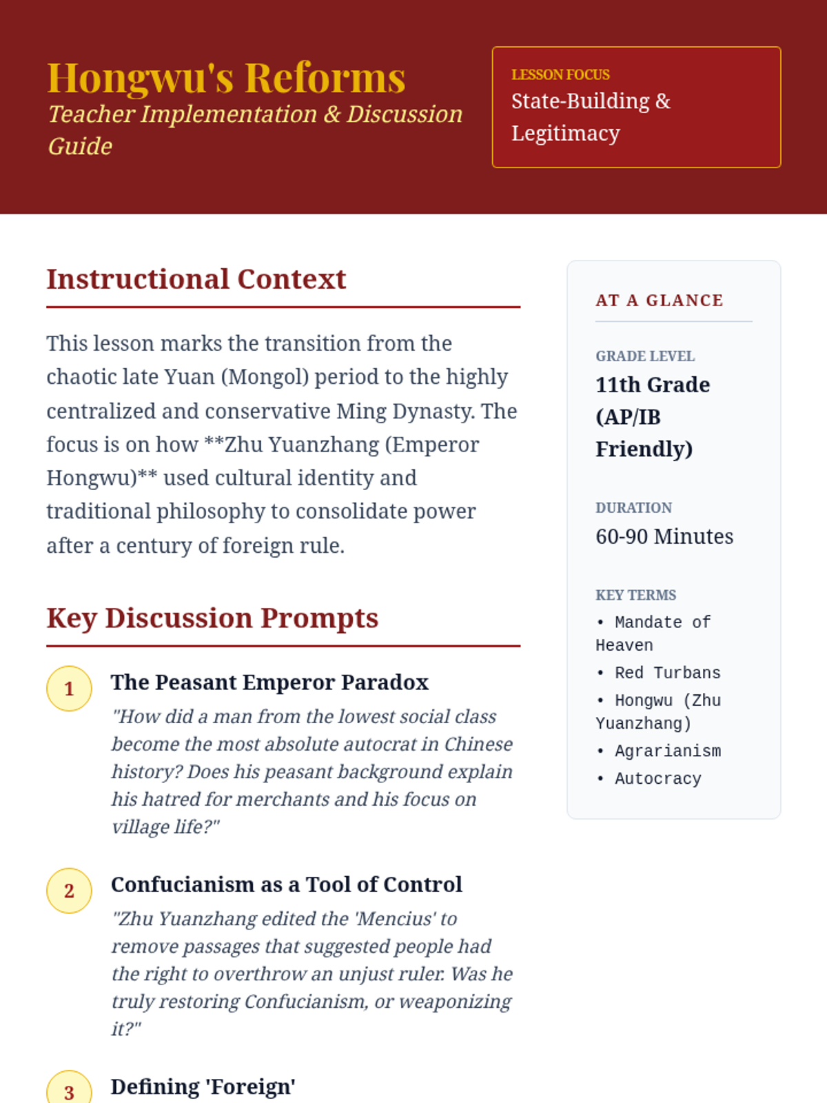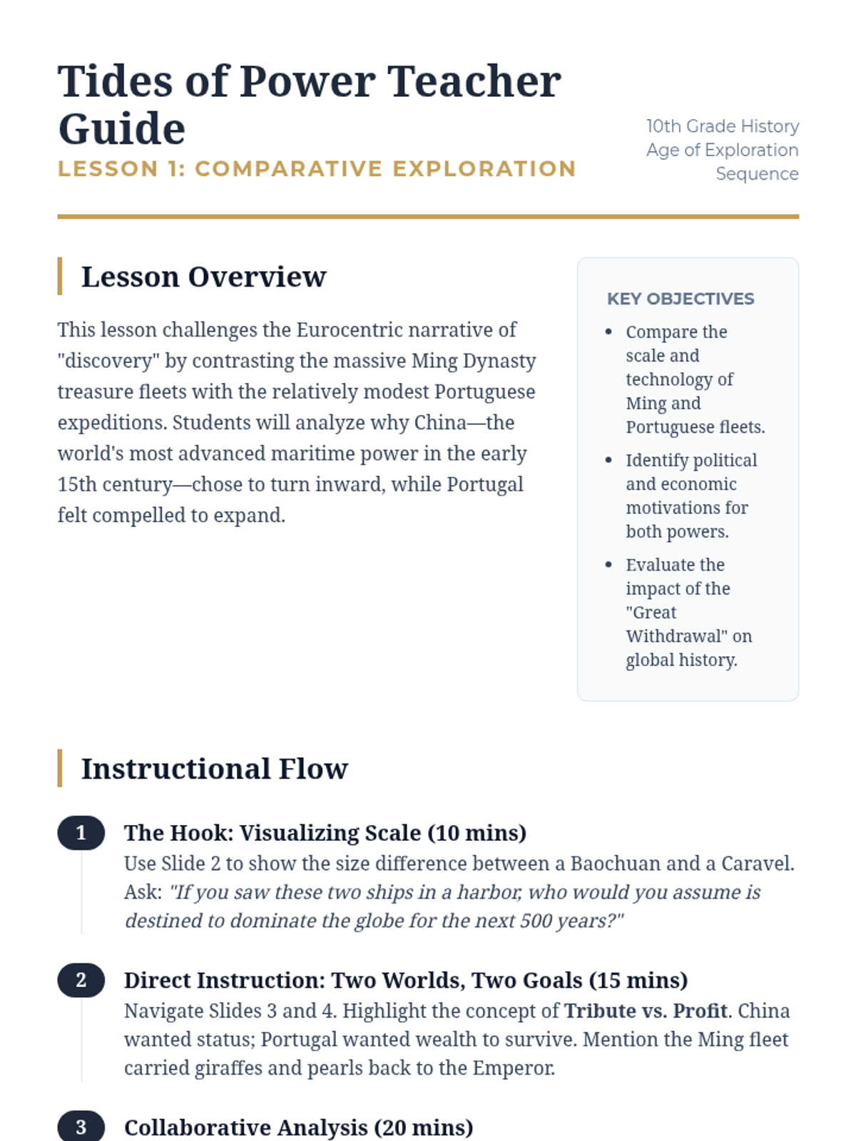 This sequence explores the early Ming Dynasty's shift from unprecedented maritime exploration to strict isolationism. Students analyze the reign of Hongwu, the massive Treasure Fleets of Zheng He, and the internal court conflicts between Eunuchs and Scholar-Officials that ultimately changed the course of global history.