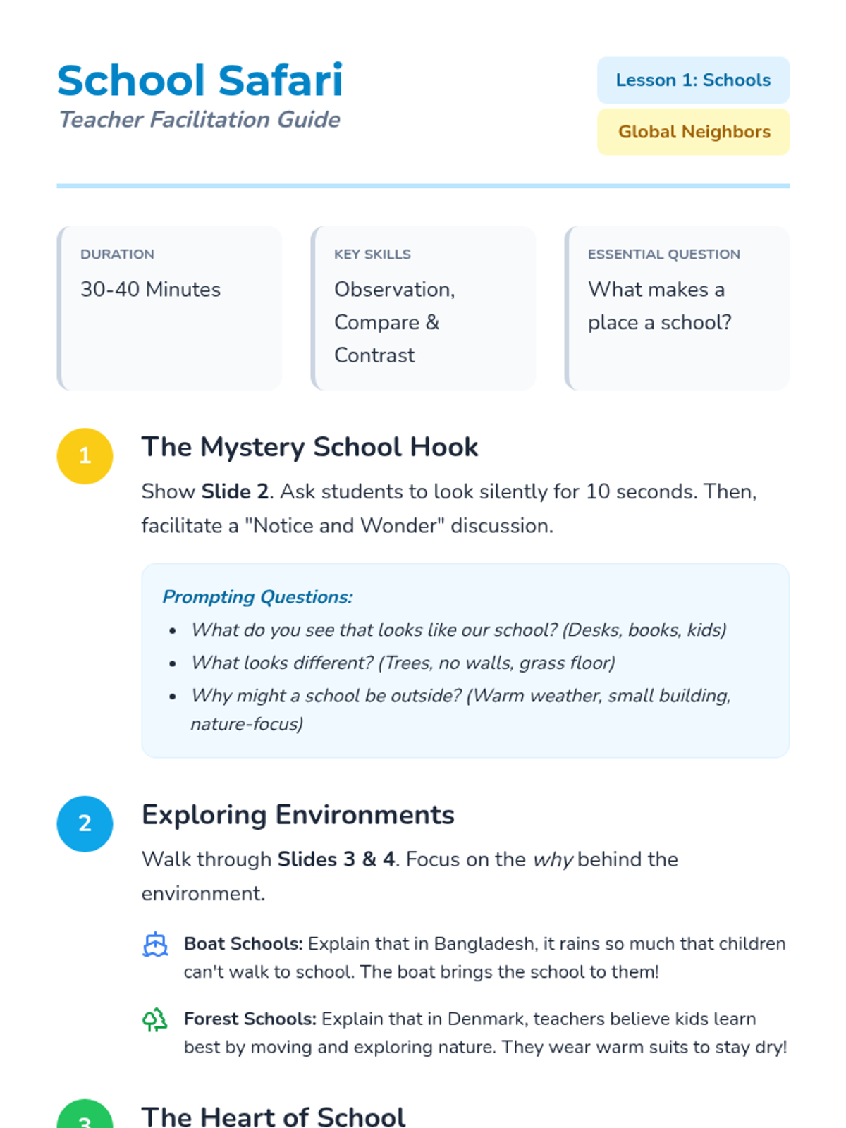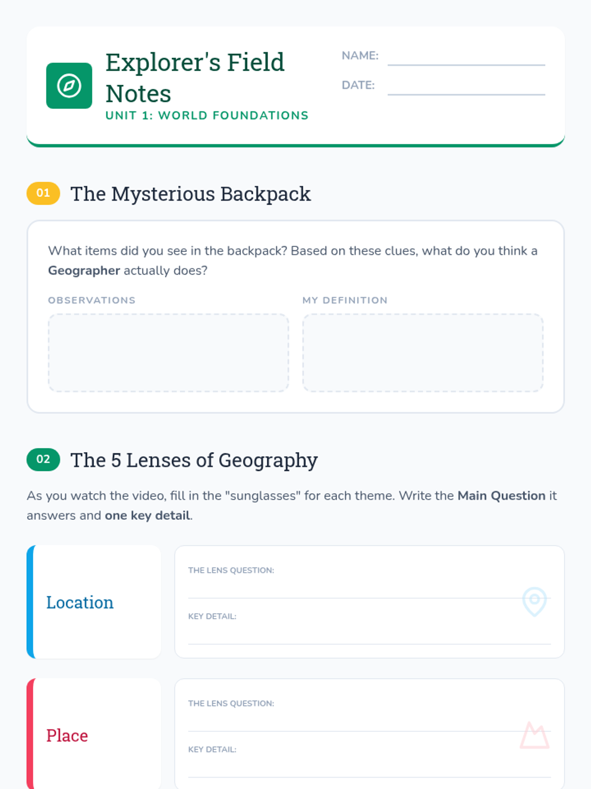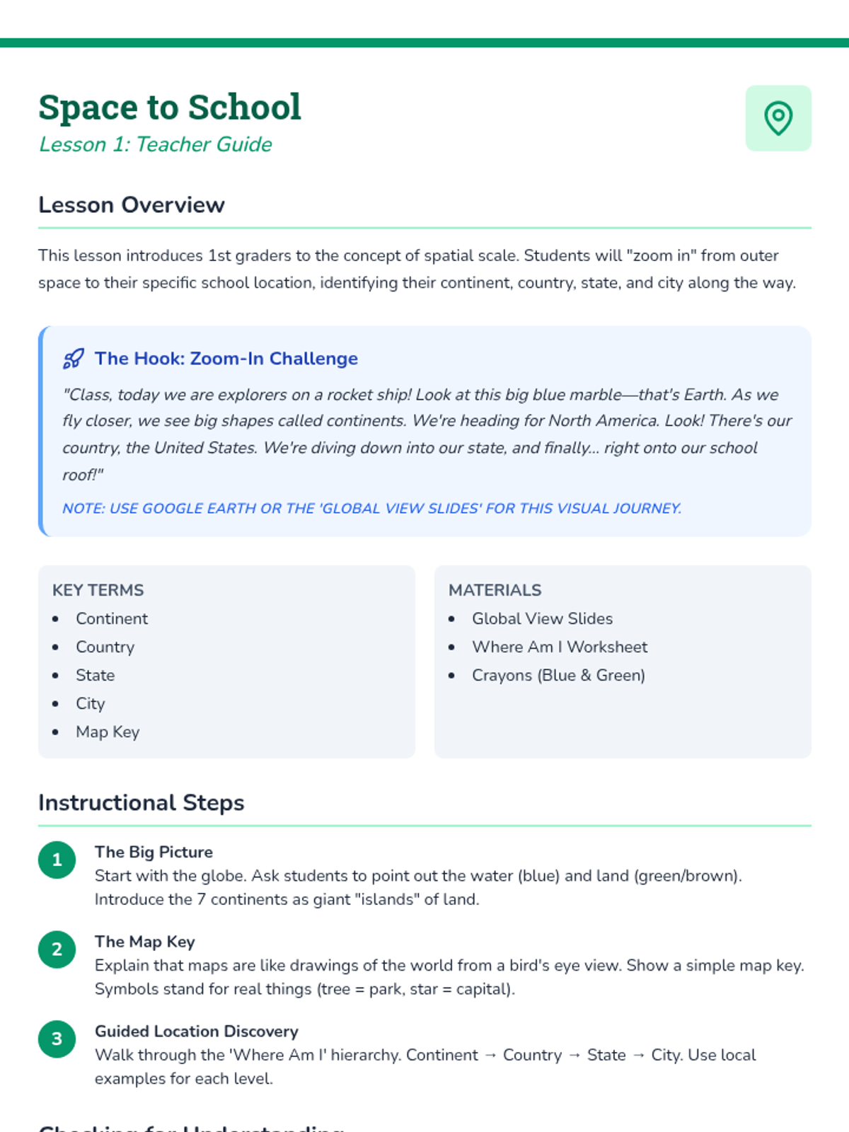 A project-based sequence for 1st Grade students to explore regional geography through the lens of human characteristics, communities, and culture. Students progress from local mapping to comparing urban and rural environments, global housing styles, and man-made landmarks, culminating in the creation of a community model.