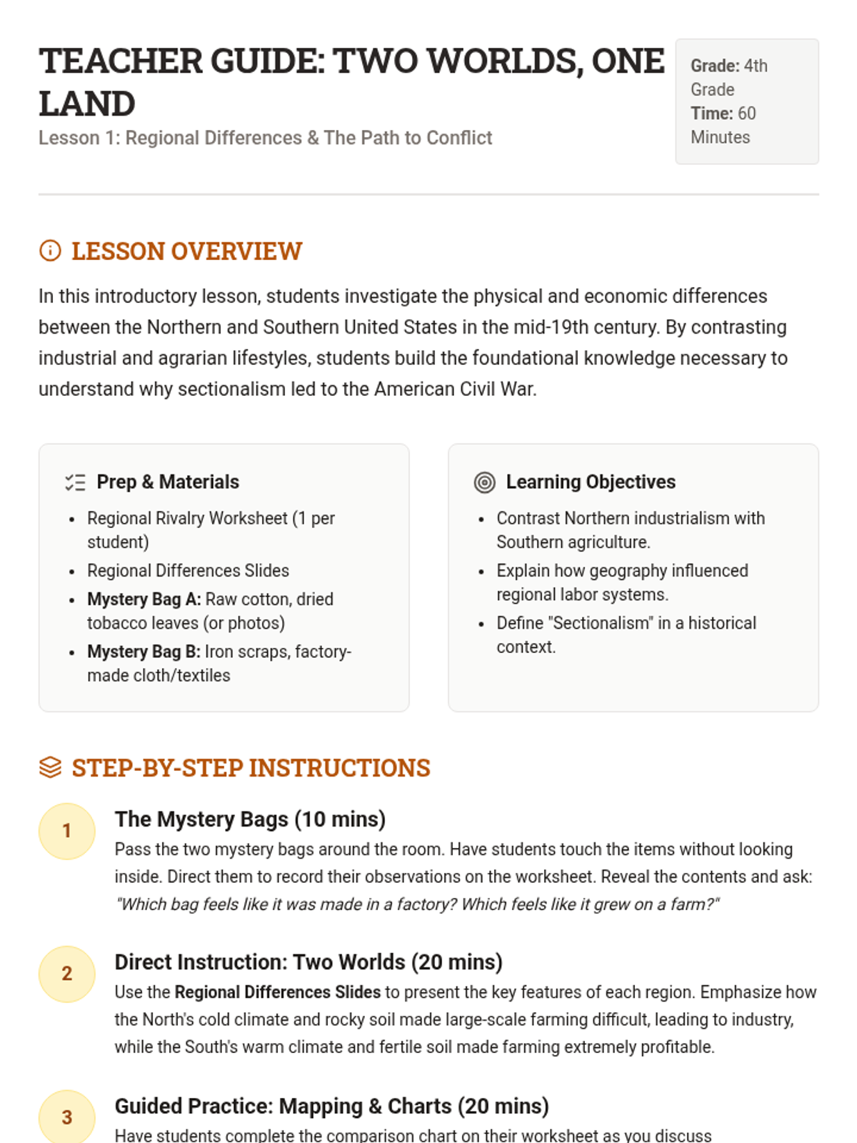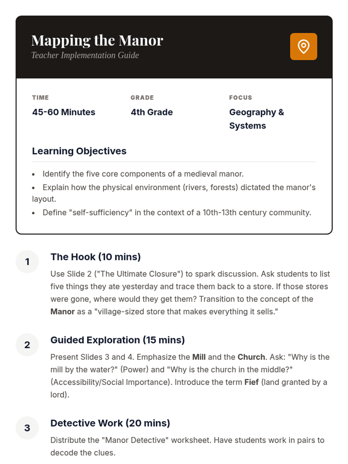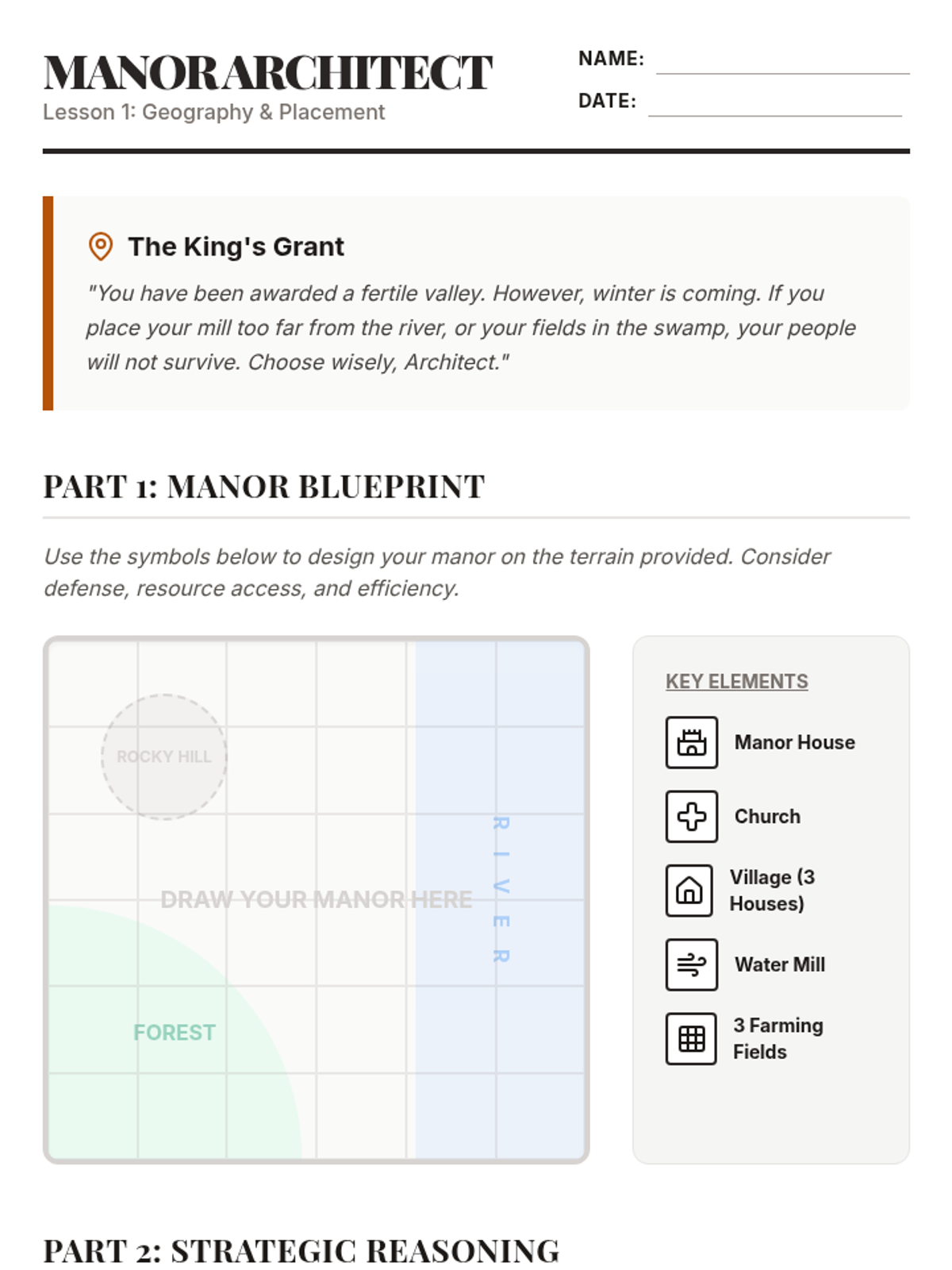 A project-based sequence for 1st Grade students to explore regional geography through the lens of human characteristics, communities, and culture. Students progress from local mapping to comparing urban and rural environments, global housing styles, and man-made landmarks, culminating in the creation of a community model.