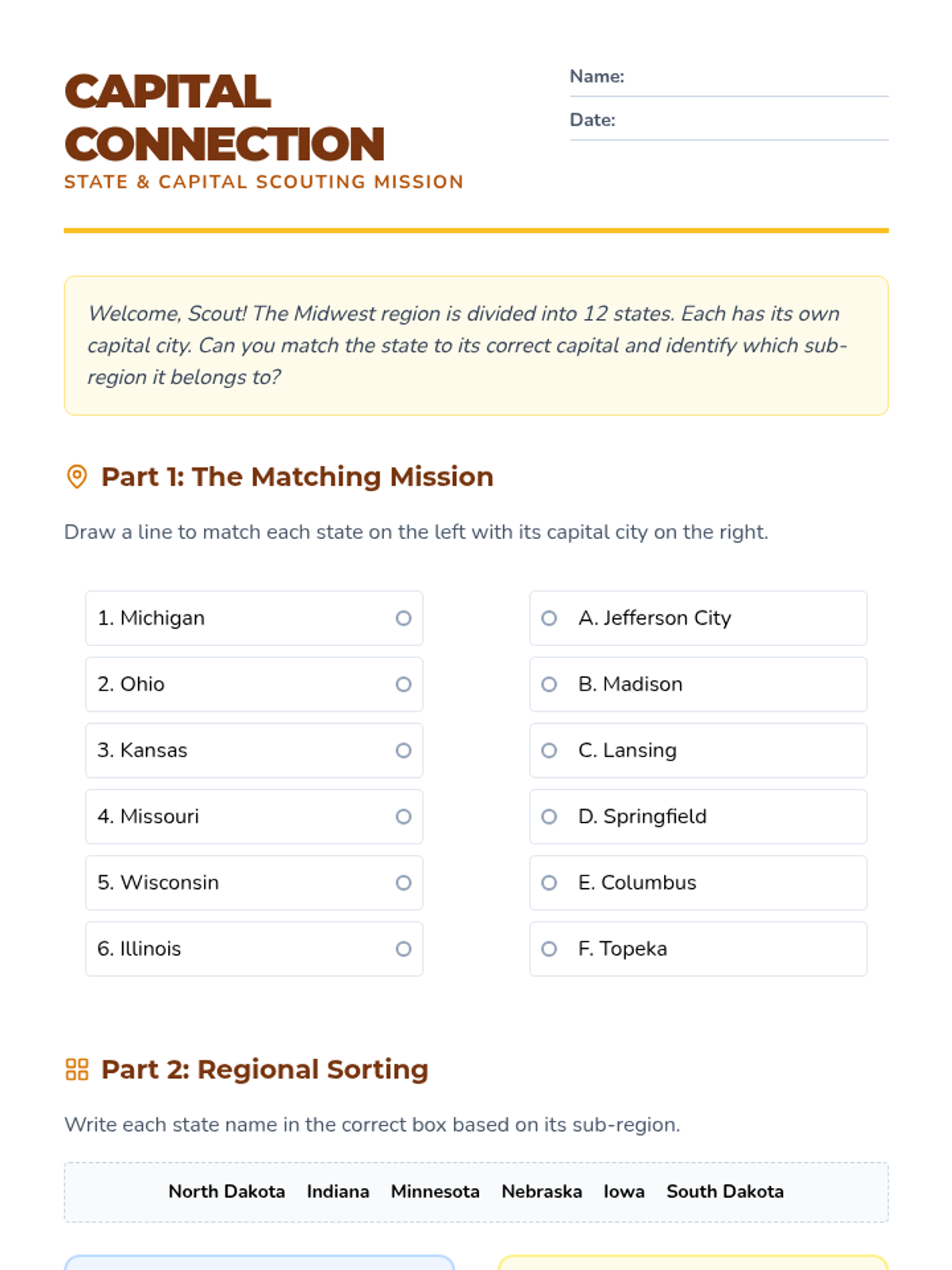 State CapitalsIdentification and location of the fifty U.S. state capitals within their respective regions. Connects administrative centers to geographic landmarks and historical development.