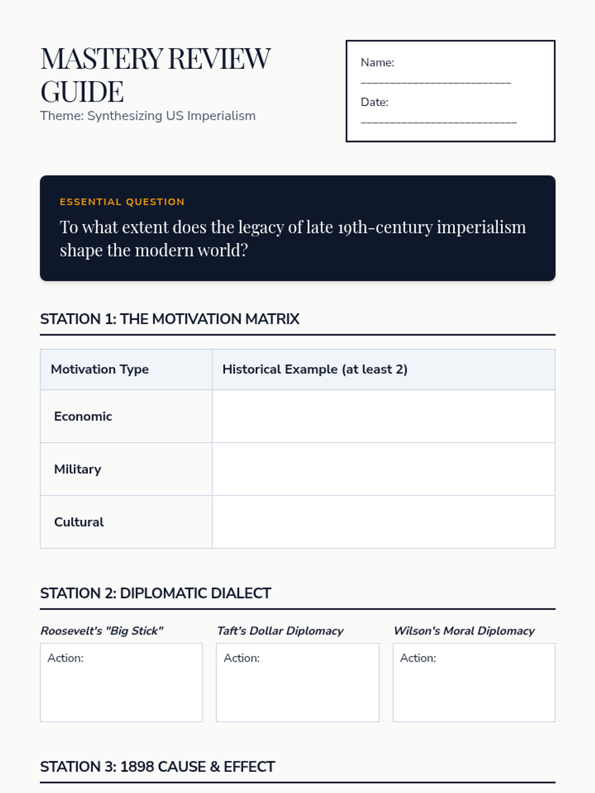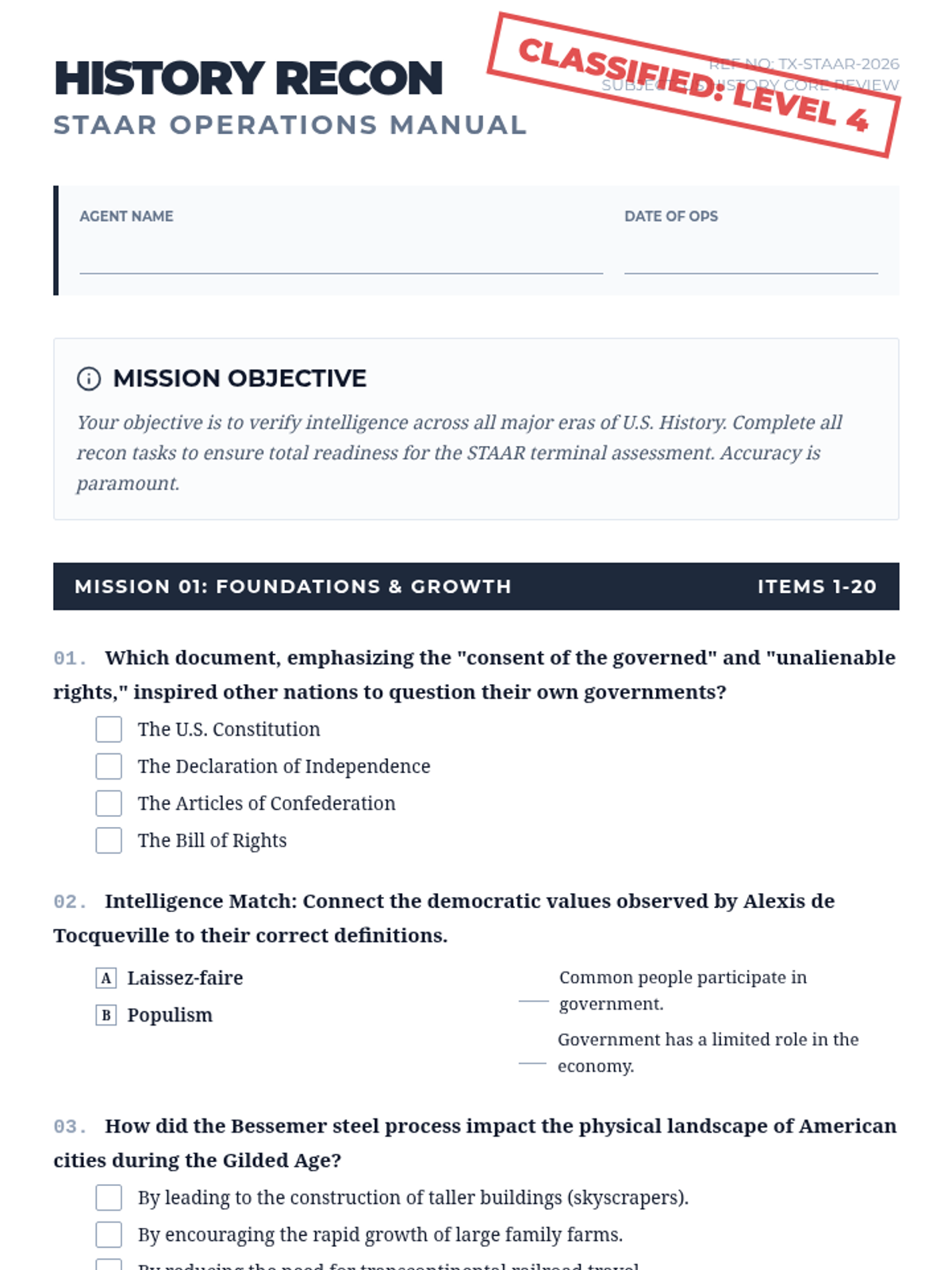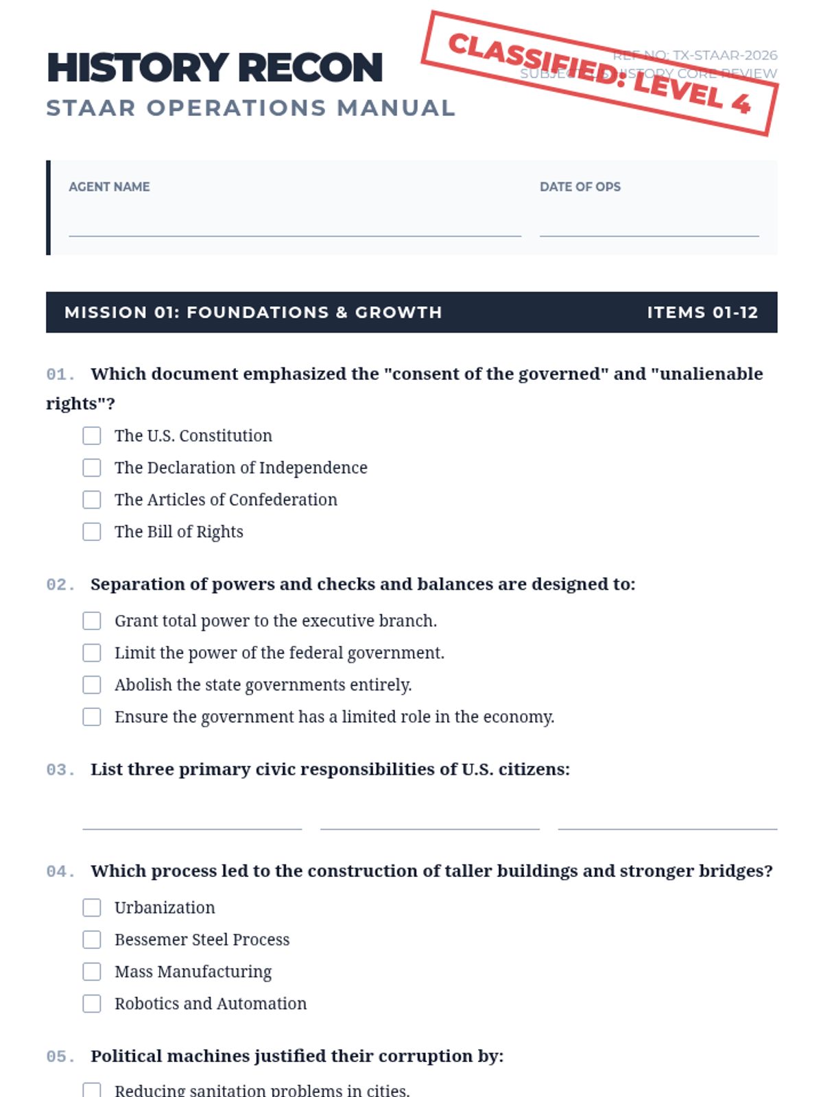 A high-stakes review series for the U.S. History STAAR exam, focusing on major eras, turning points, and key figures using a 'Mission-Based' archival theme.