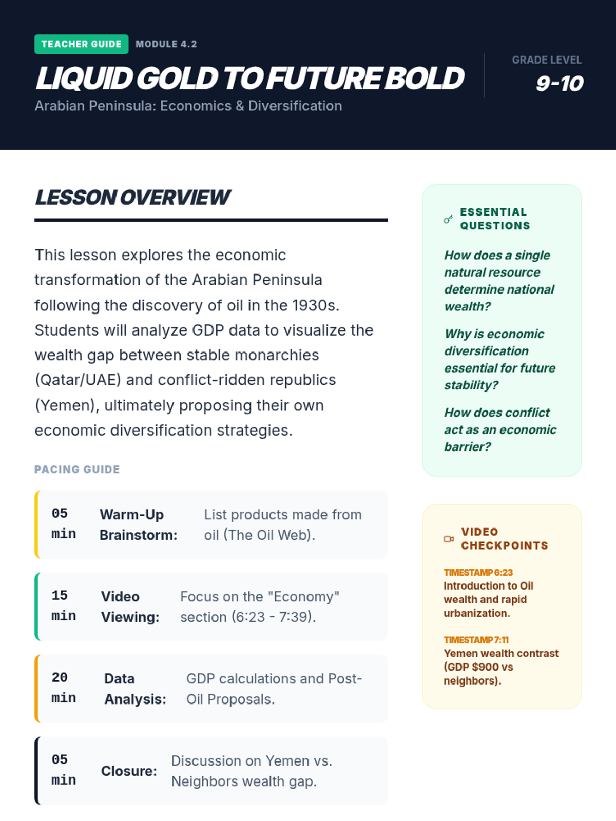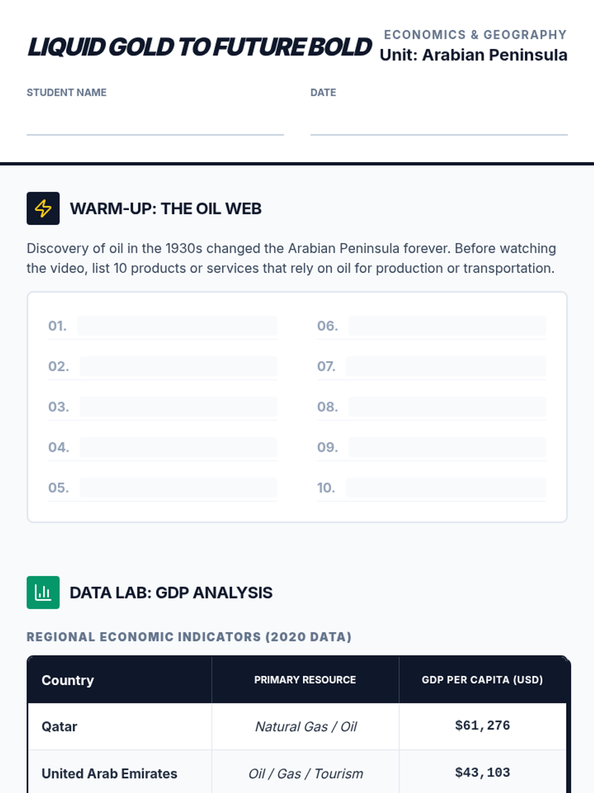 Society and Environment of the Middle EastInteraction between arid climates, water scarcity, and urbanization across Southwest Asia and North Africa. Examines how natural resources like petroleum shape regional economies and geopolitical relations.