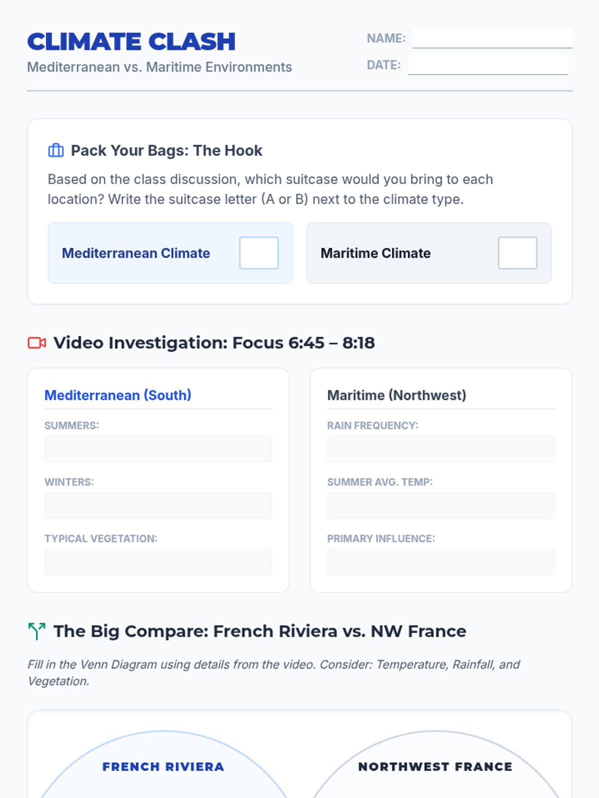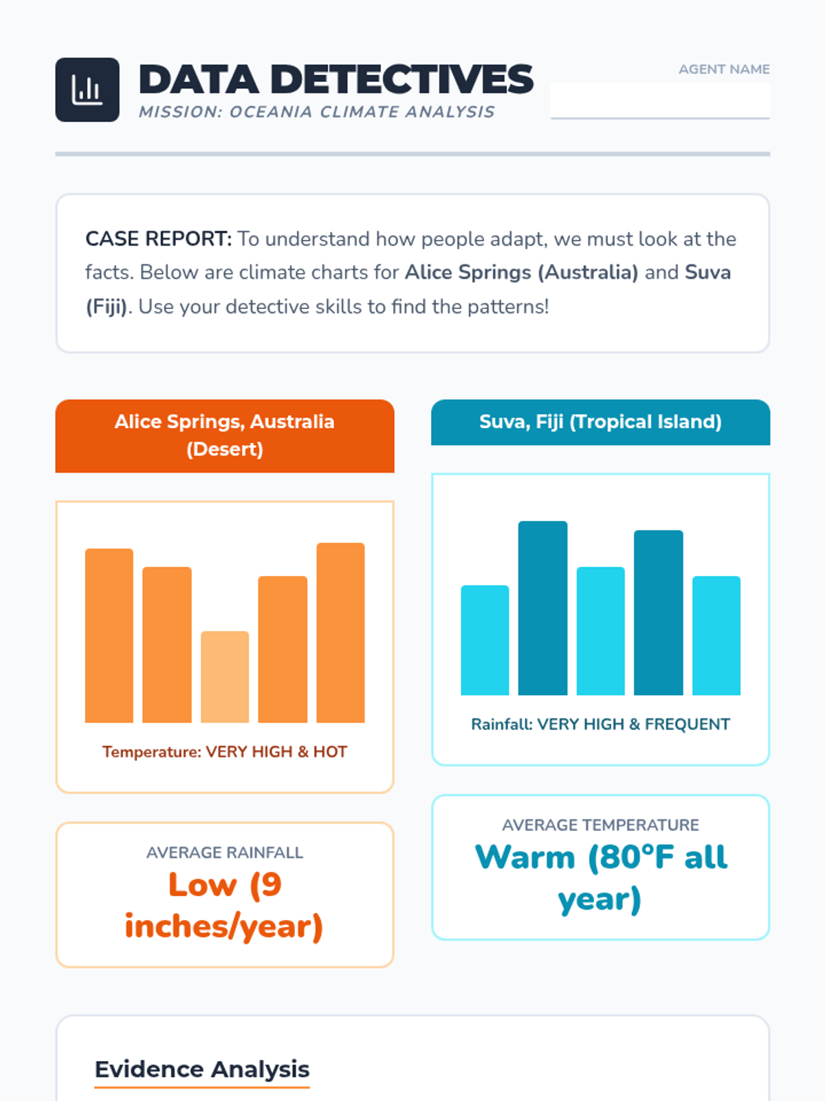 This project-based sequence explores how physical geography dictates human lifestyle, specifically comparing the arid Australian Outback to tropical Pacific Islands. Students analyze how environment influences shelter, clothing, and daily activities, concluding with a climate-smart shelter design project.