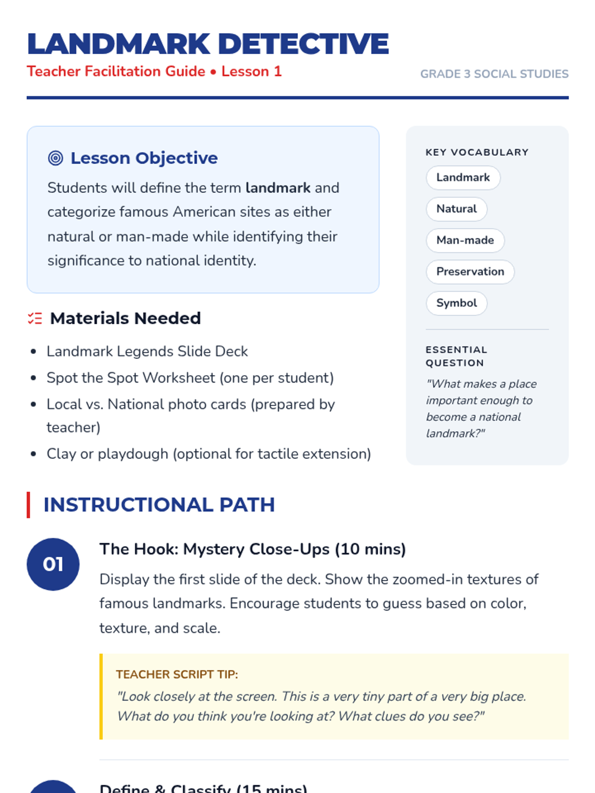 A 5-lesson unit for 1st grade exploring iconic American landmarks including the Statue of Liberty, the White House, and Mount Rushmore, focusing on their significance as national symbols.