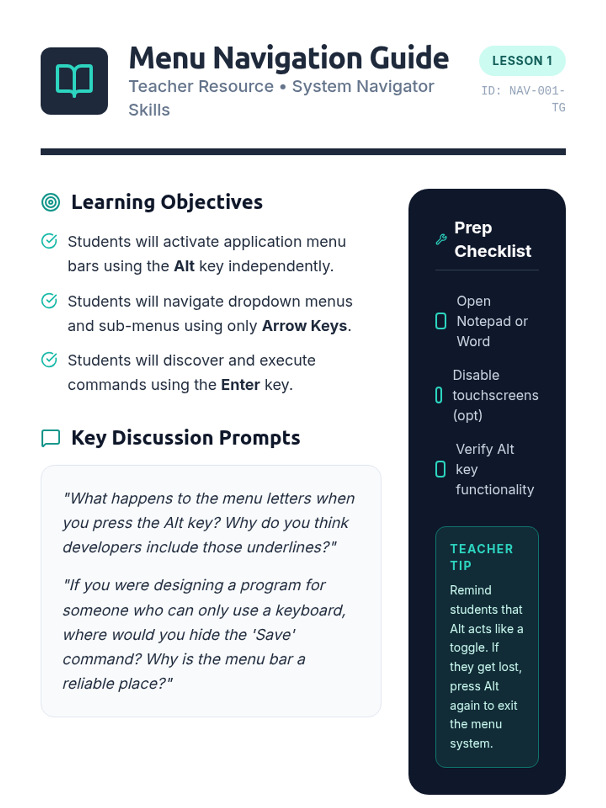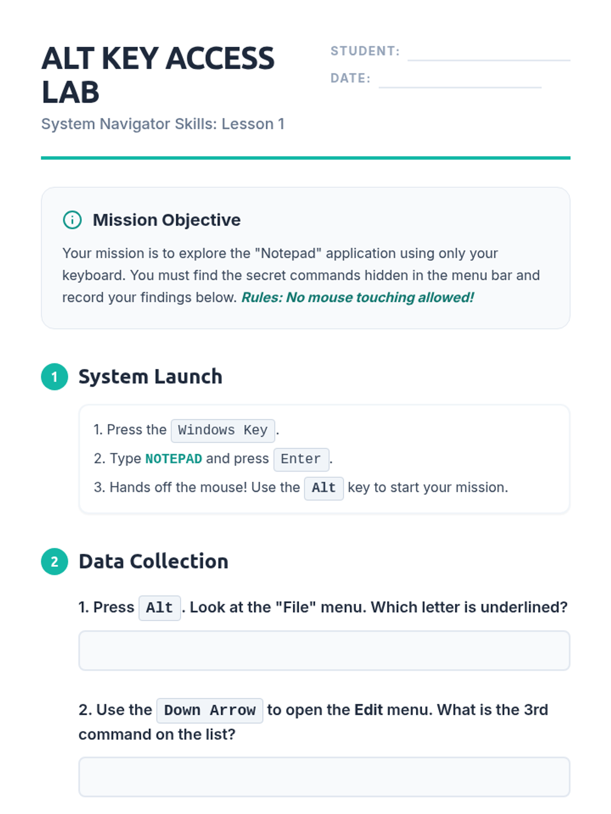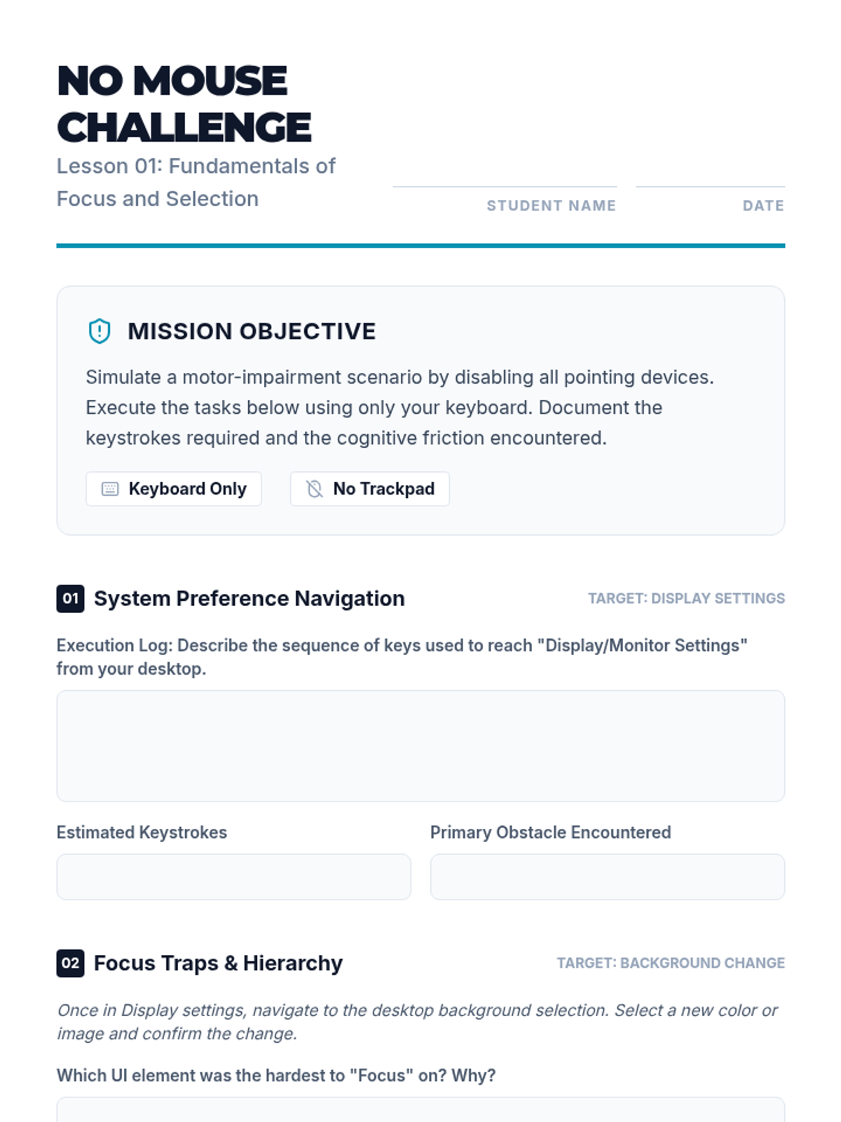 A comprehensive sequence for 10th-grade students with motor or visual impairments to master operating system navigation using only keyboard shortcuts. It covers focus indicators, menu navigation, file management, and system settings.