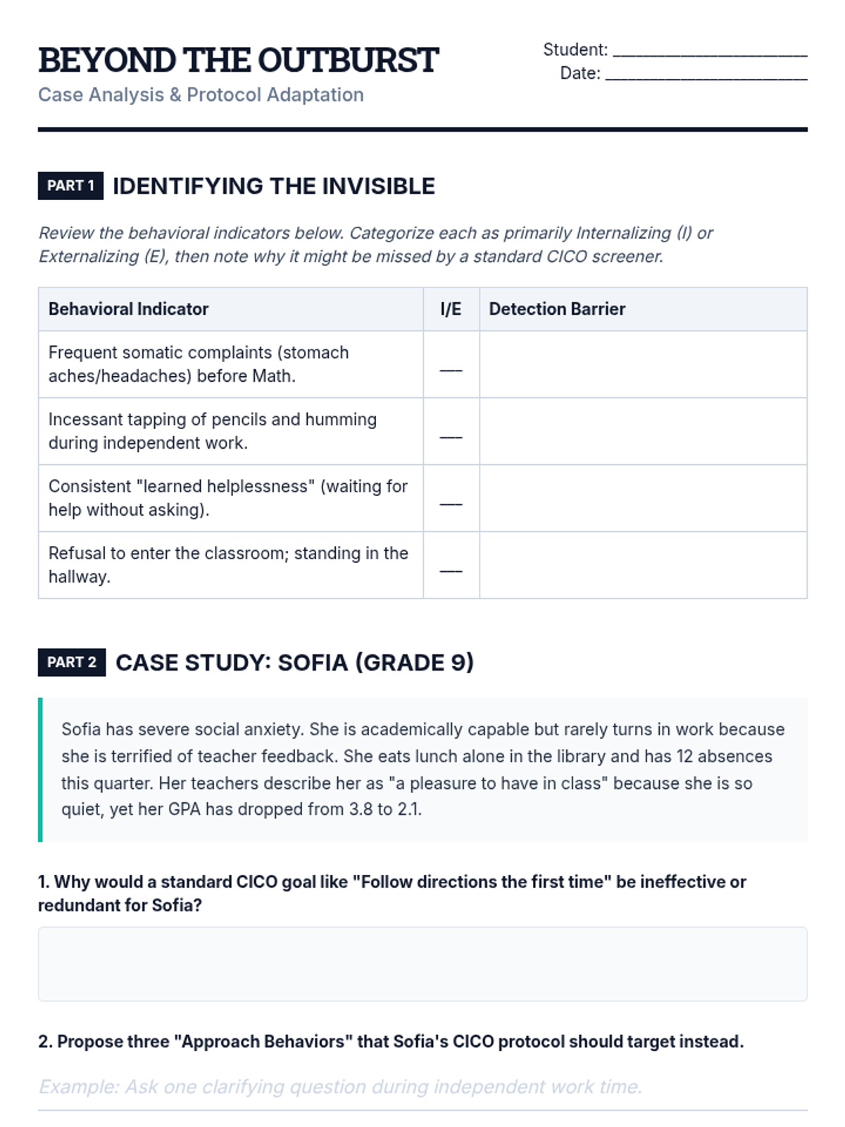 This sequence challenges undergraduate students to adapt standard behavioral check-in protocols for diverse student populations, focusing on developmental, cultural, and neurological differences. Students move beyond a one-size-fits-all approach to design equitable and effective behavioral supports.