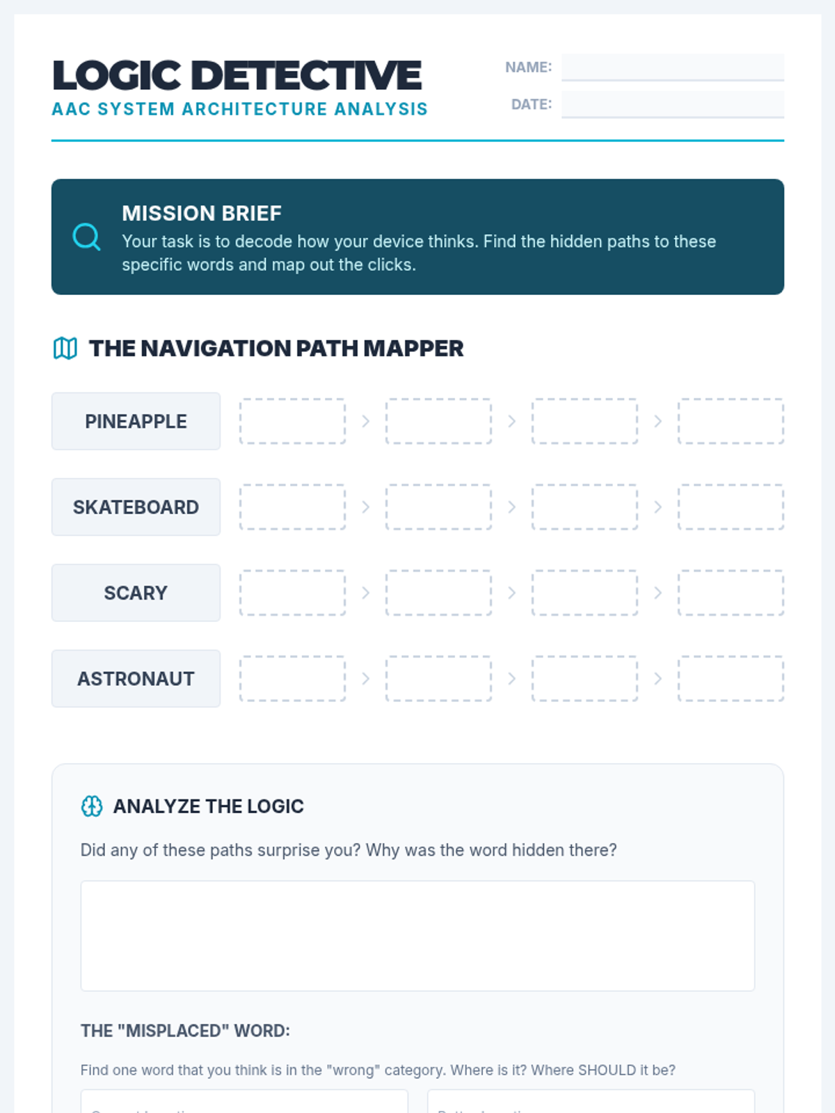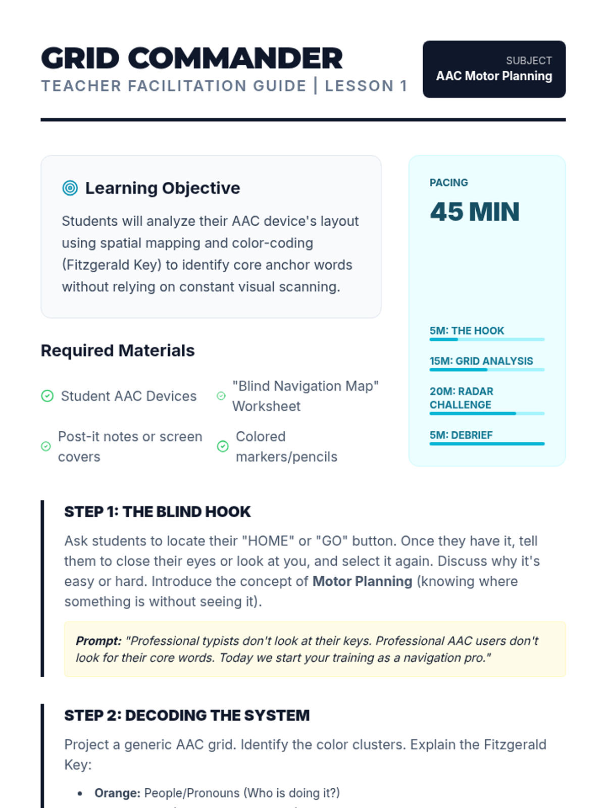 A specialized sequence for 3rd-grade students to build motor automaticity and muscle memory when navigating AAC devices. The unit progresses from single-word location to complex multi-step phrase construction, culminating in a blind navigation challenge to prove mastery.