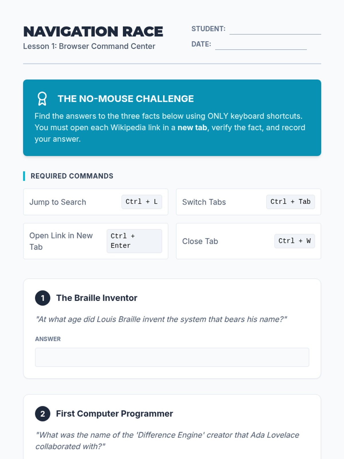 A 5-lesson sequence designed for 6th-grade students, focusing on assistive technology through browser-based keyboard shortcuts. Students progress from basic interface navigation to complex, mouse-free research workflows.
