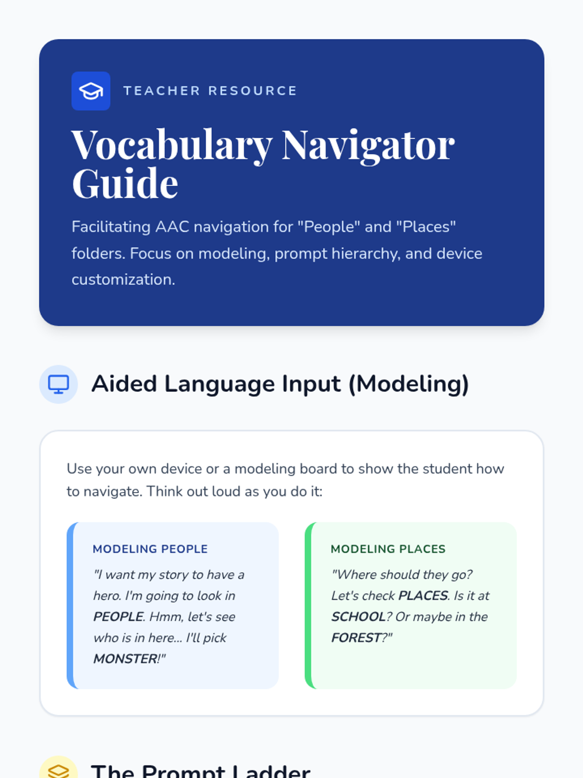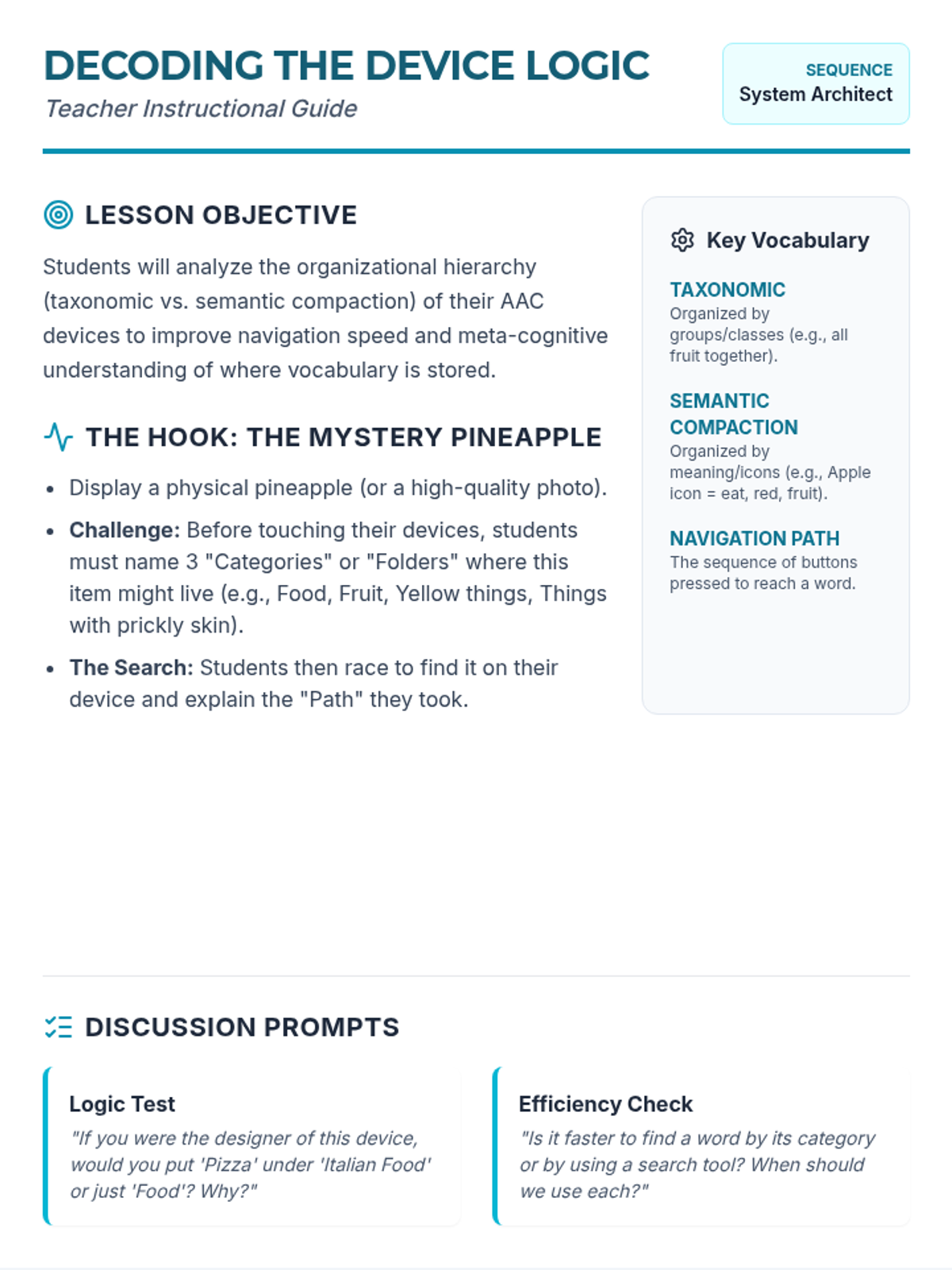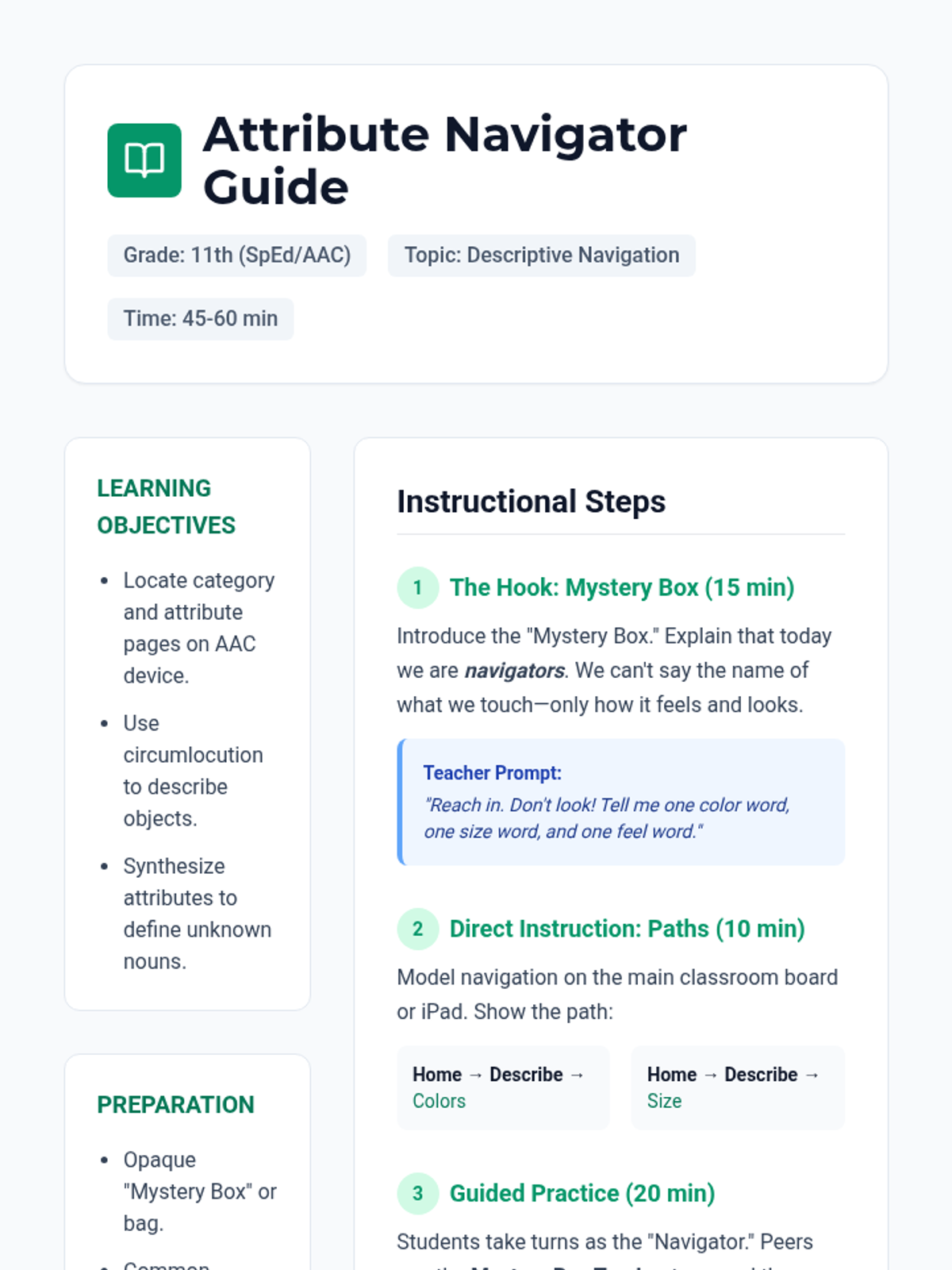 This 11th-grade sequence focuses on 'Descriptive Teaching' for AAC users. Students learn to navigate their devices strategically, using core vocabulary (adjectives, verbs, negation) to describe concepts and repair communication breakdowns rather than relying on specific fringe nouns.