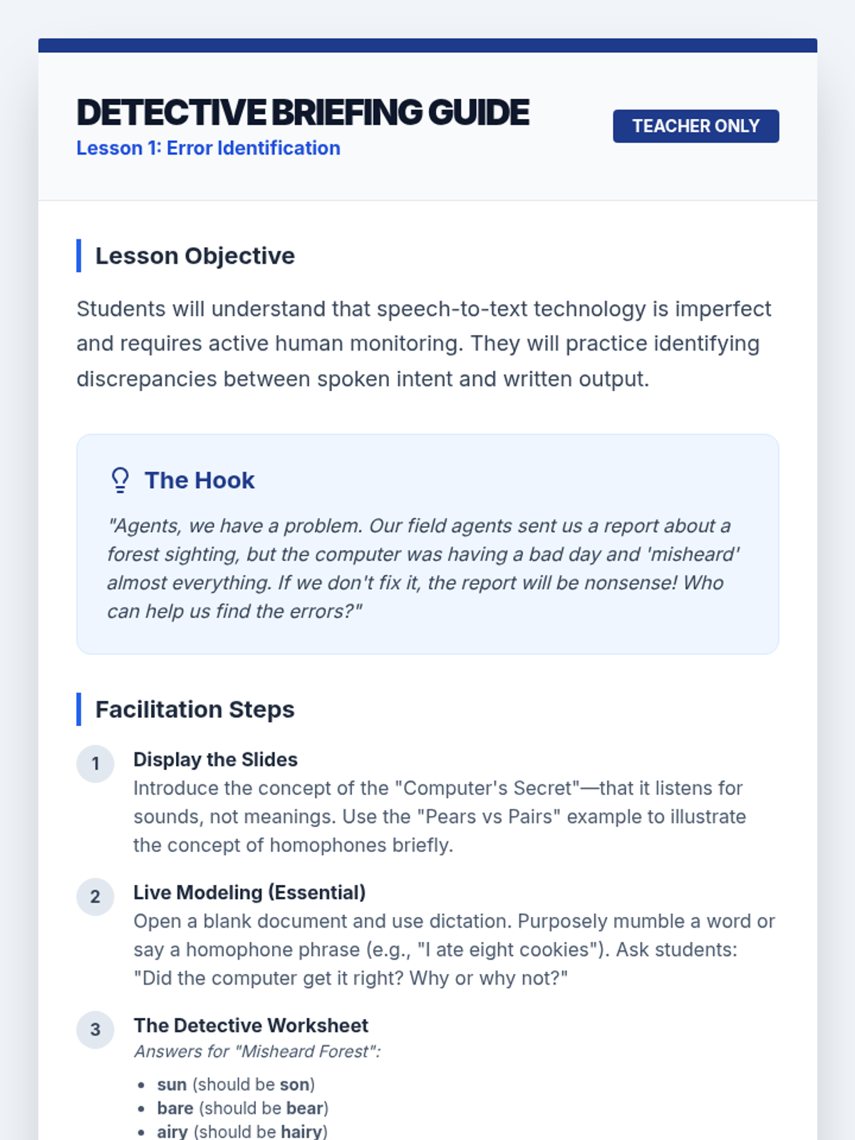 This sequence teaches 2nd grade students how to identify and correct errors made by speech recognition software, transforming raw dictation into polished writing. Students act as 'Text Detectives' to master error detection, homophone correction, and hybrid editing strategies.