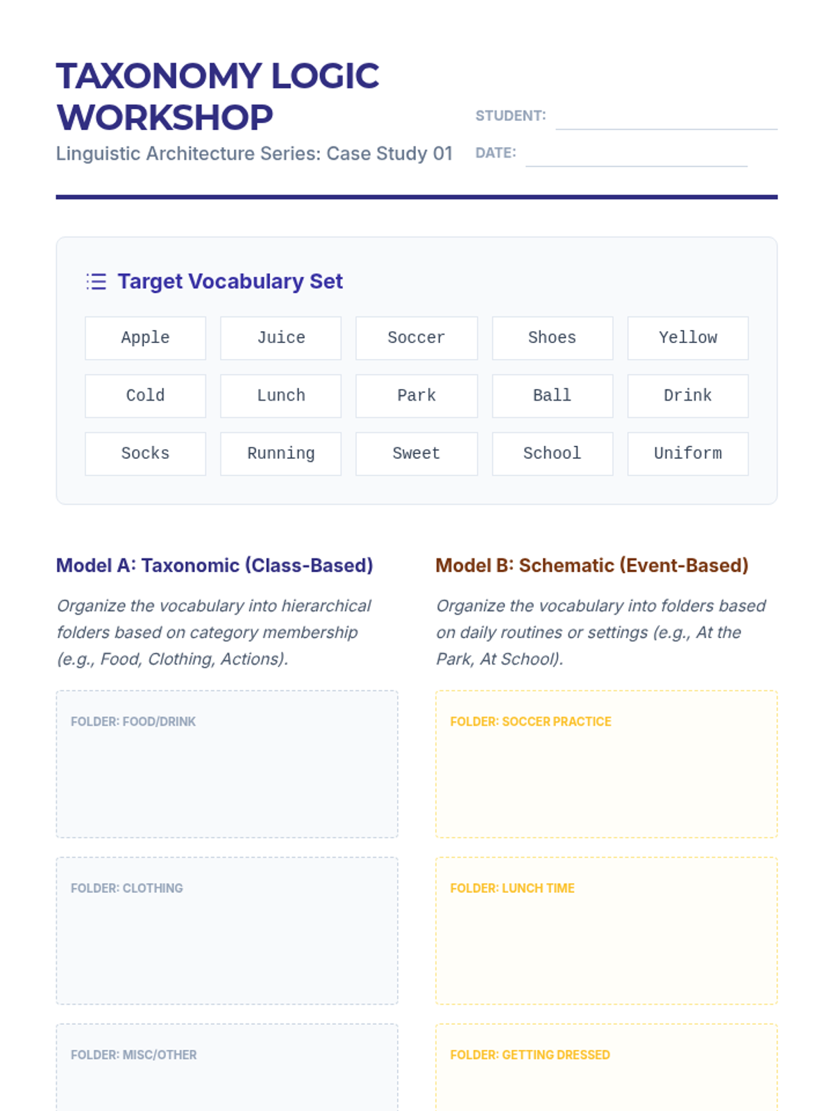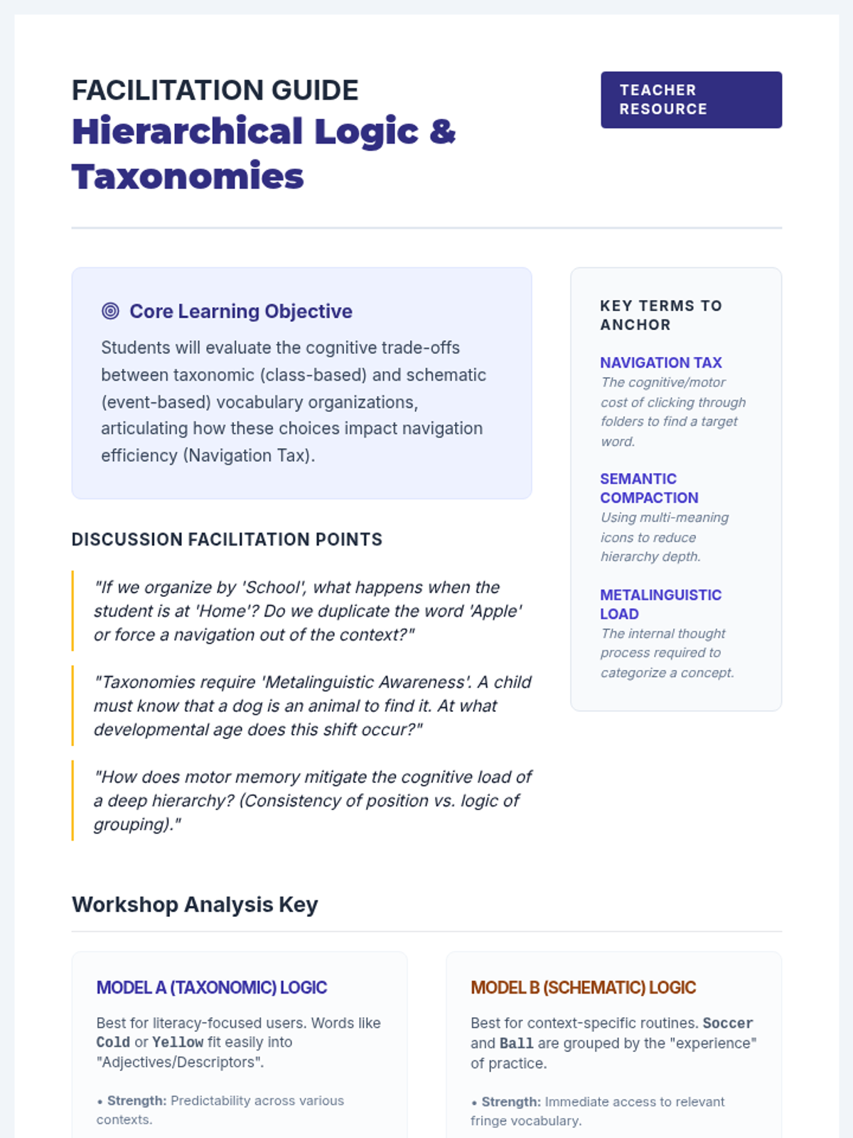 A graduate-level exploration of the linguistic and cognitive logic underlying AAC navigation systems. Students analyze semantic, syntactic, and taxonomic organizations to match communication architectures with diverse learner needs.