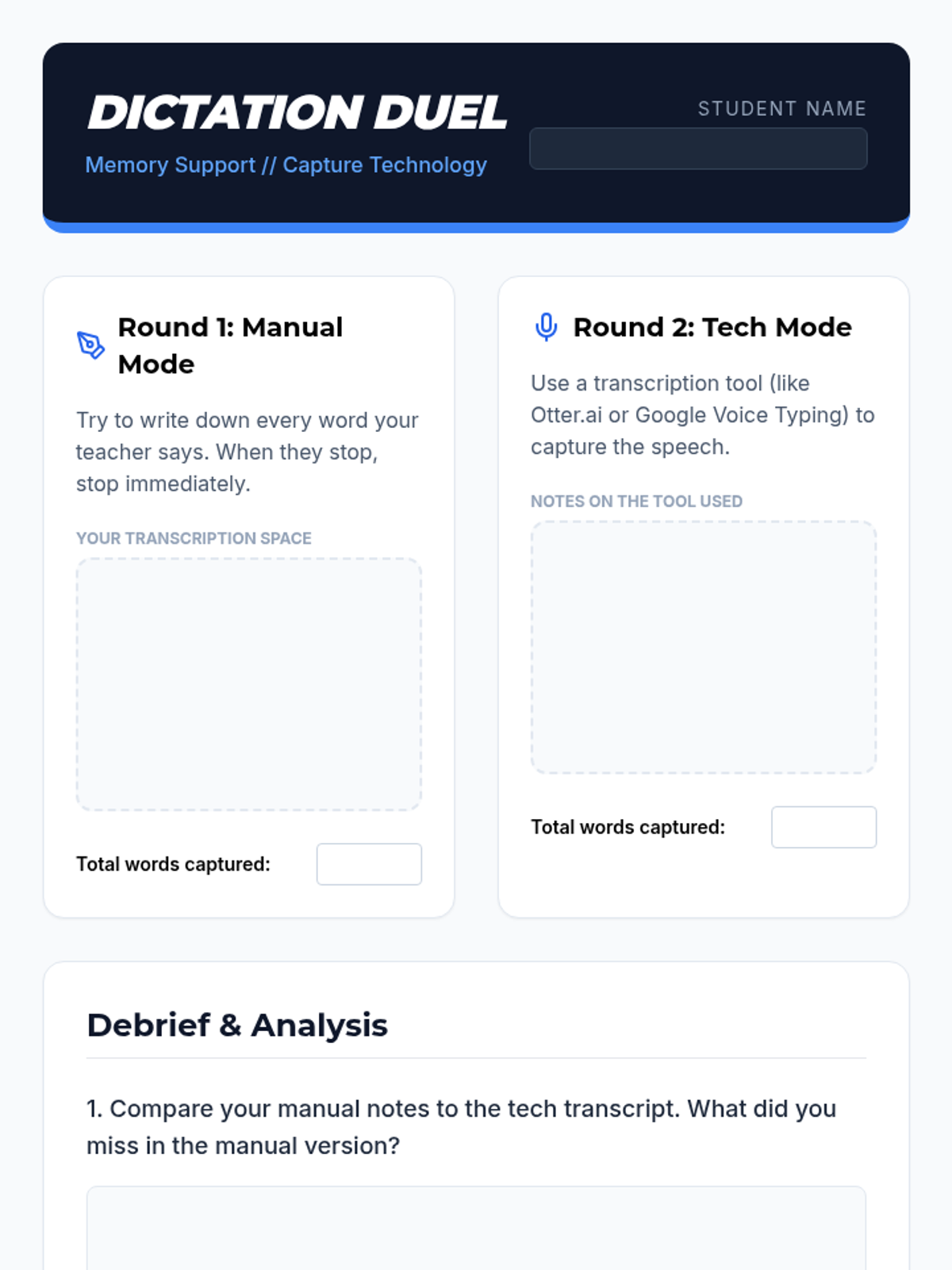 This sequence teaches 11th-grade students with working memory challenges how to use digital tools as external memory aids. Students learn to capture, process, and execute instructions using voice-to-text, micro-tasking, auditory alarms, and visual freezing techniques.
