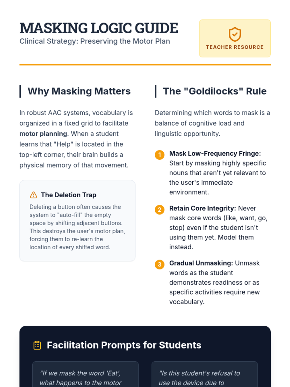 This project-based sequence for graduate students focuses on the advanced technical and clinical skills required to customize AAC devices. Students learn to manage vocabulary systems by prioritizing motor planning, hierarchical logic, and visual accessibility, culminating in a comprehensive case study customization project.