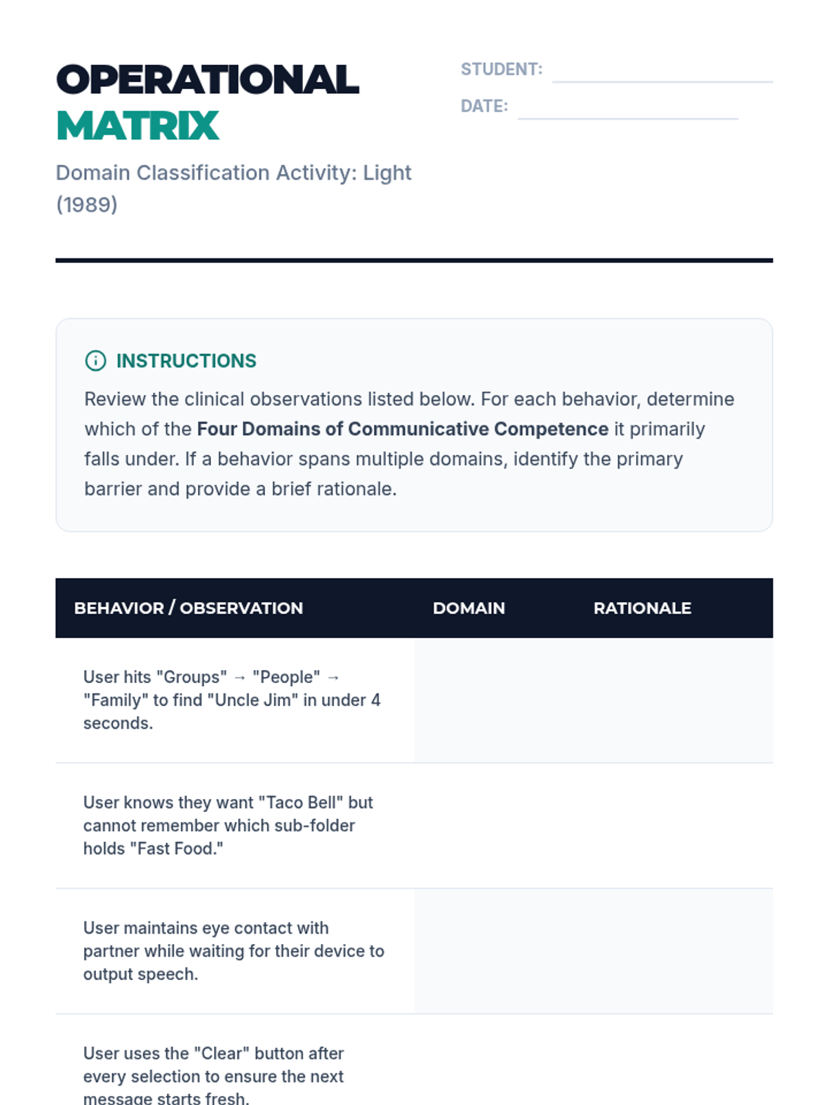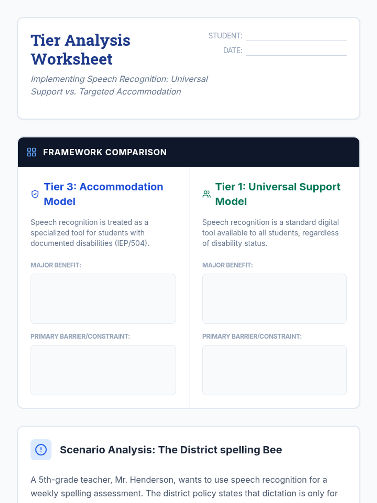 This workshop-style sequence for pre-service teachers bridges the gap between identifying student needs and designing instructional supports, focusing on the critical distinctions between accommodations, modifications, and Specially Designed Instruction (SDI). Students will move from theoretical definitions to practical application, culminating in the creation of a service delivery matrix.