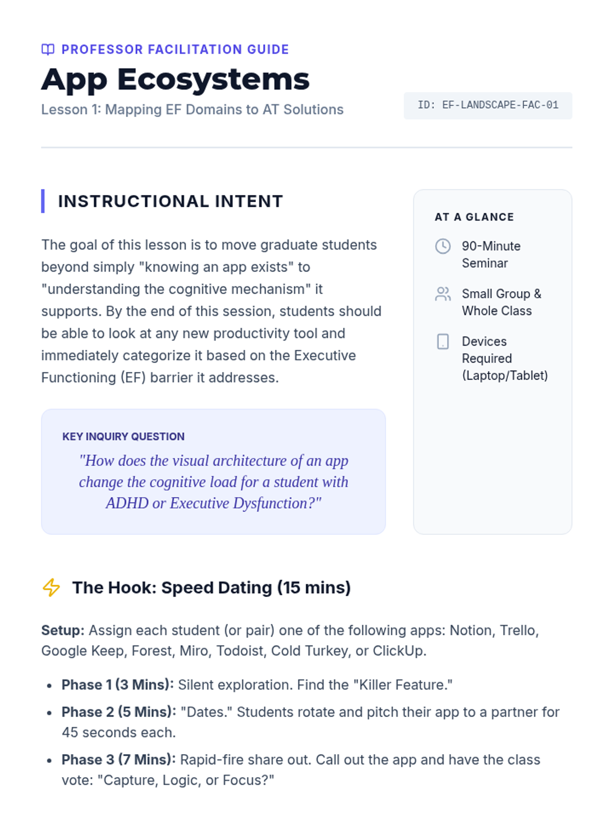 A graduate-level sequence exploring how assistive technology (AT) supports executive functioning and multi-day project management in special education. Students will evaluate tools, configure reminders, explore AI integration, and design implementation plans for diverse learners.
