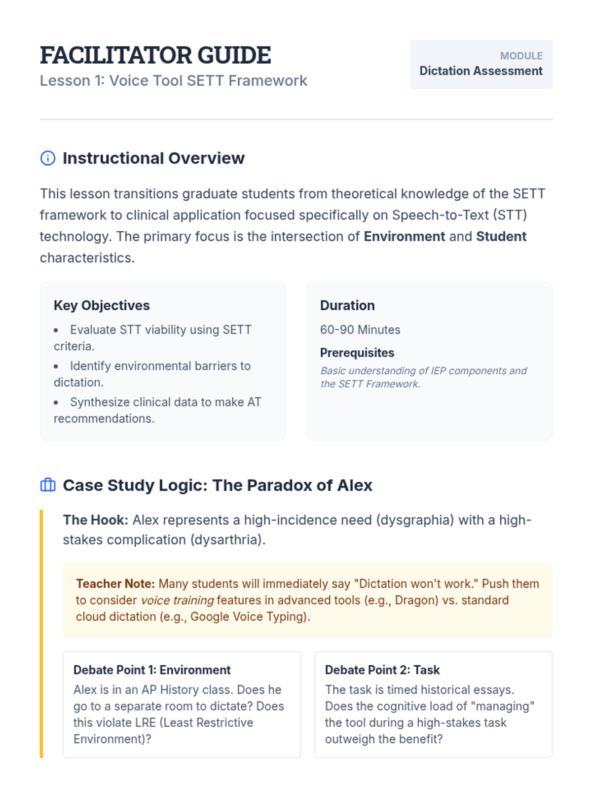 A graduate-level sequence focused on the clinical assessment and IEP documentation processes for speech recognition technology in Special Education. Students apply the SETT framework, conduct feature-matching, analyze fluency data, and draft legally defensible IEP goals.