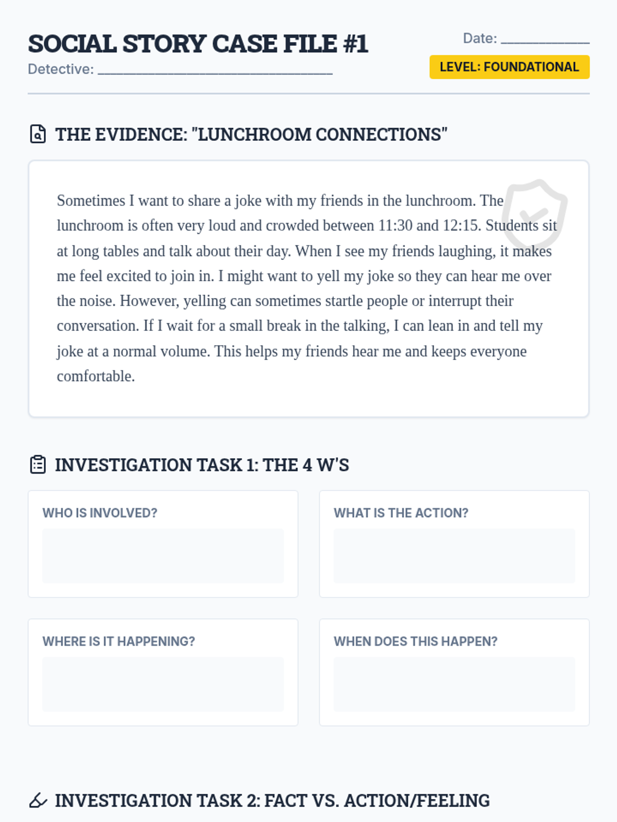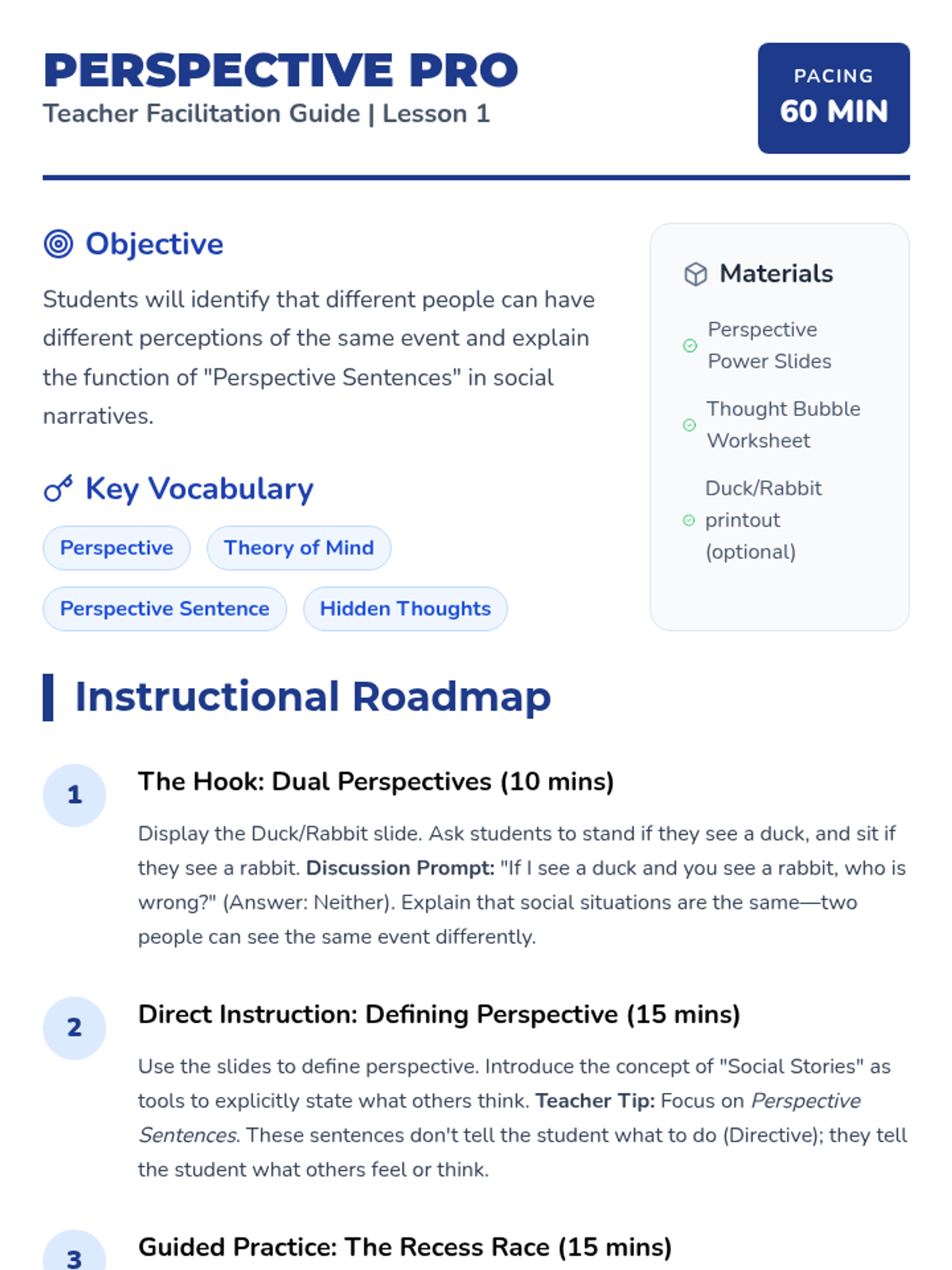 This inquiry-based sequence addresses the 'hidden curriculum'—the unwritten rules of social interaction—through the lens of perspective-taking. Students analyze case studies to understand how different people might perceive the same event differently and how social stories bridge these gaps.