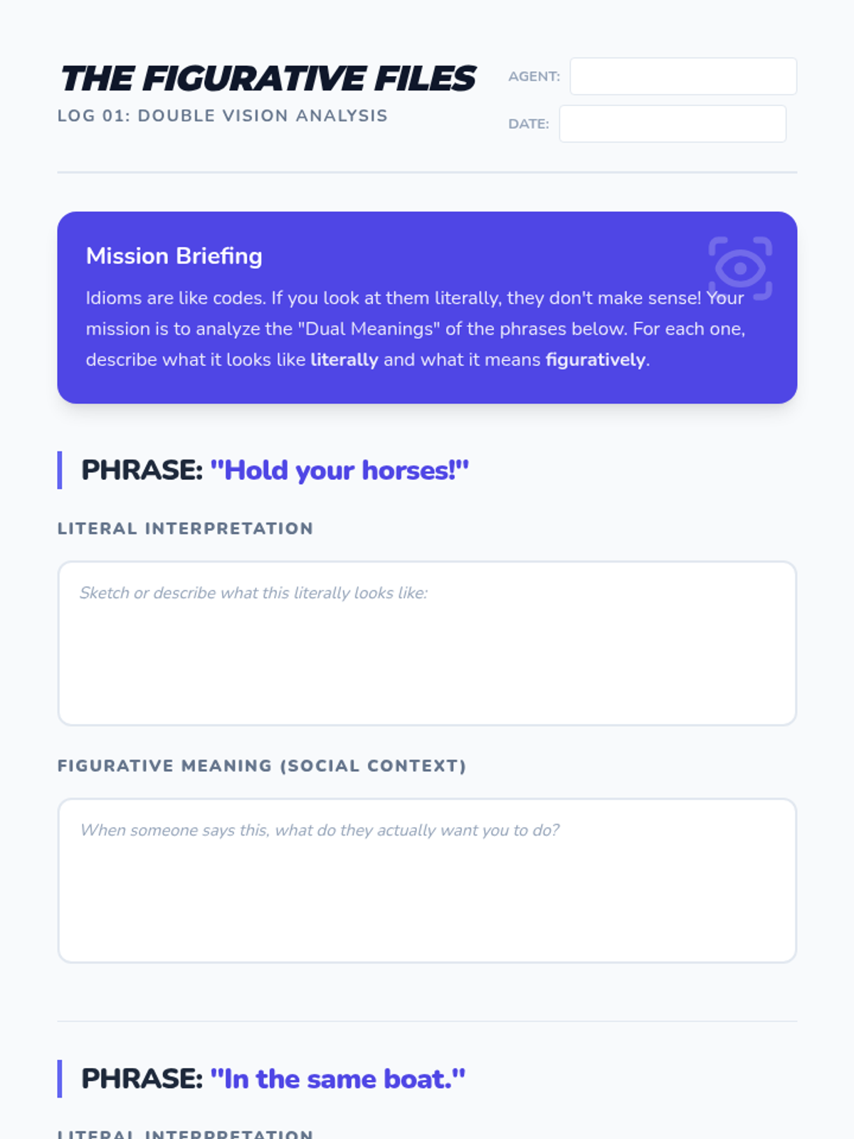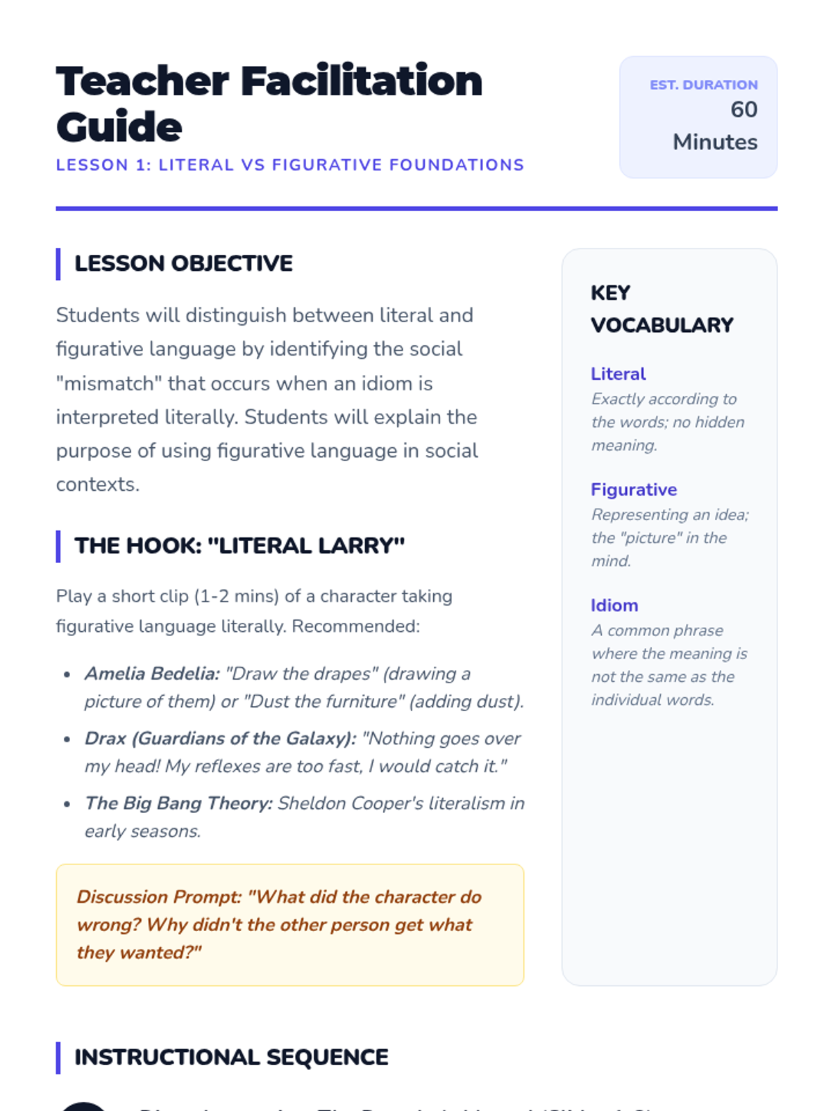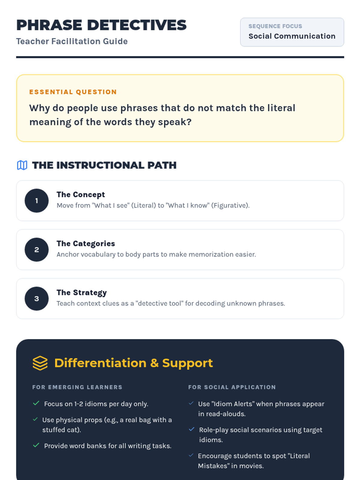 A comprehensive sequence designed for 11th-grade students with social communication needs, focusing on cognitive strategies to decode unfamiliar figurative language independently. Through substitution, visualization, emotional analysis, and social self-advocacy, students build a toolkit for navigating idiomatic expressions in real-world contexts.