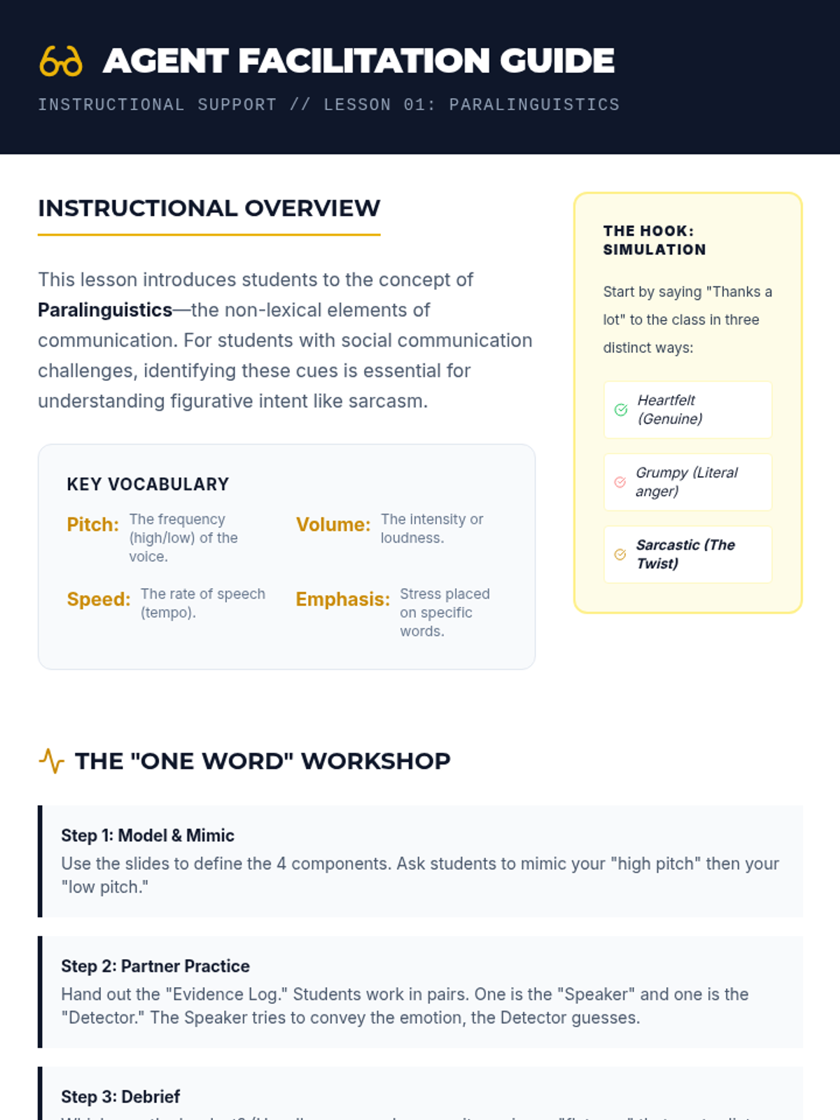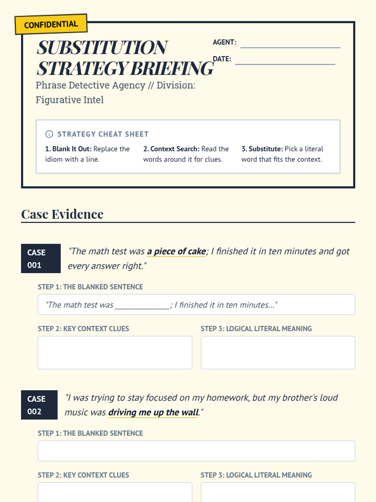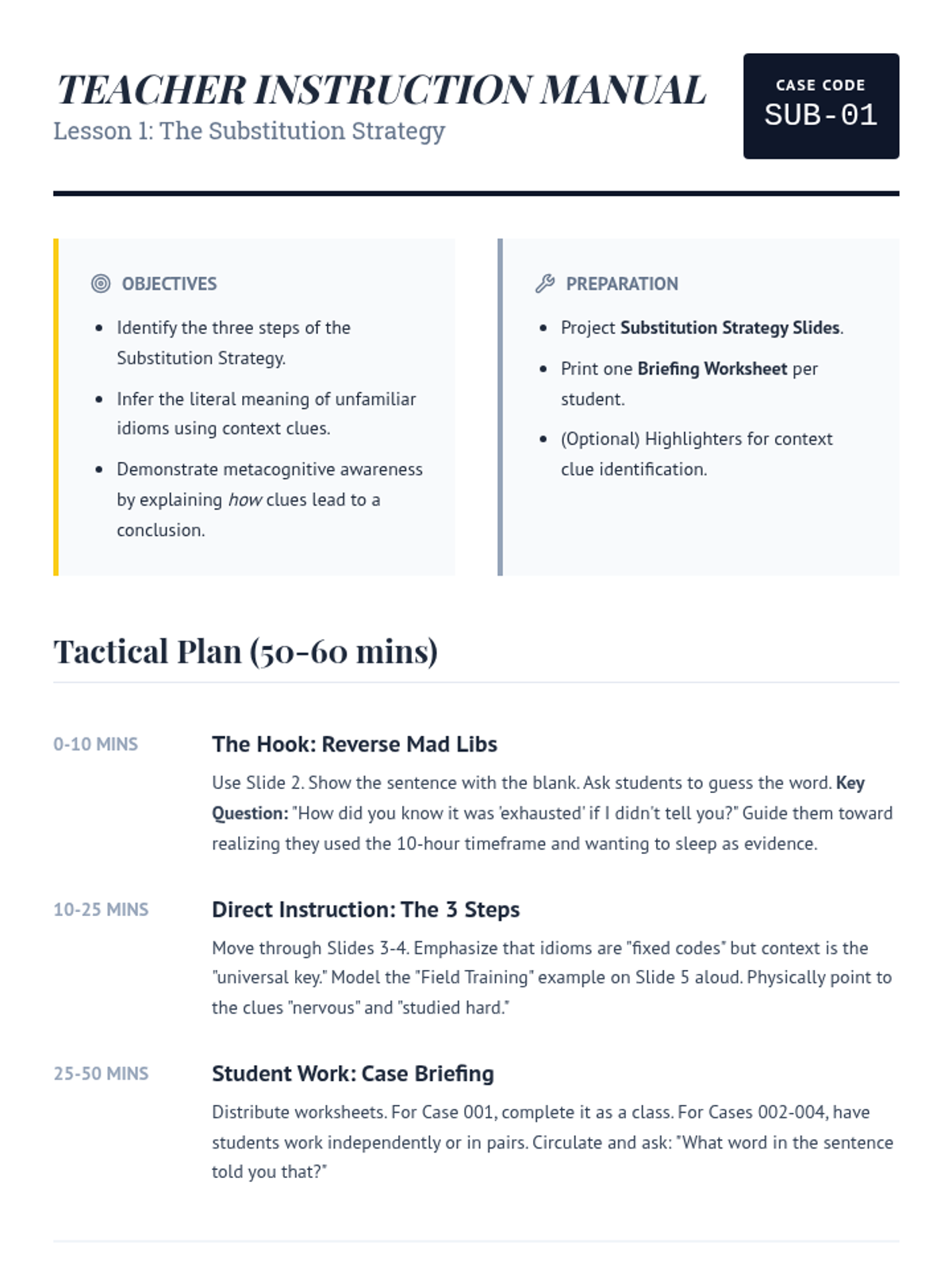 A comprehensive sequence designed for 11th-grade students with social communication needs, focusing on cognitive strategies to decode unfamiliar figurative language independently. Through substitution, visualization, emotional analysis, and social self-advocacy, students build a toolkit for navigating idiomatic expressions in real-world contexts.