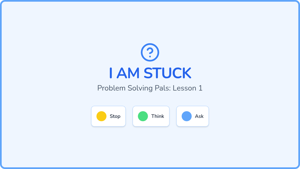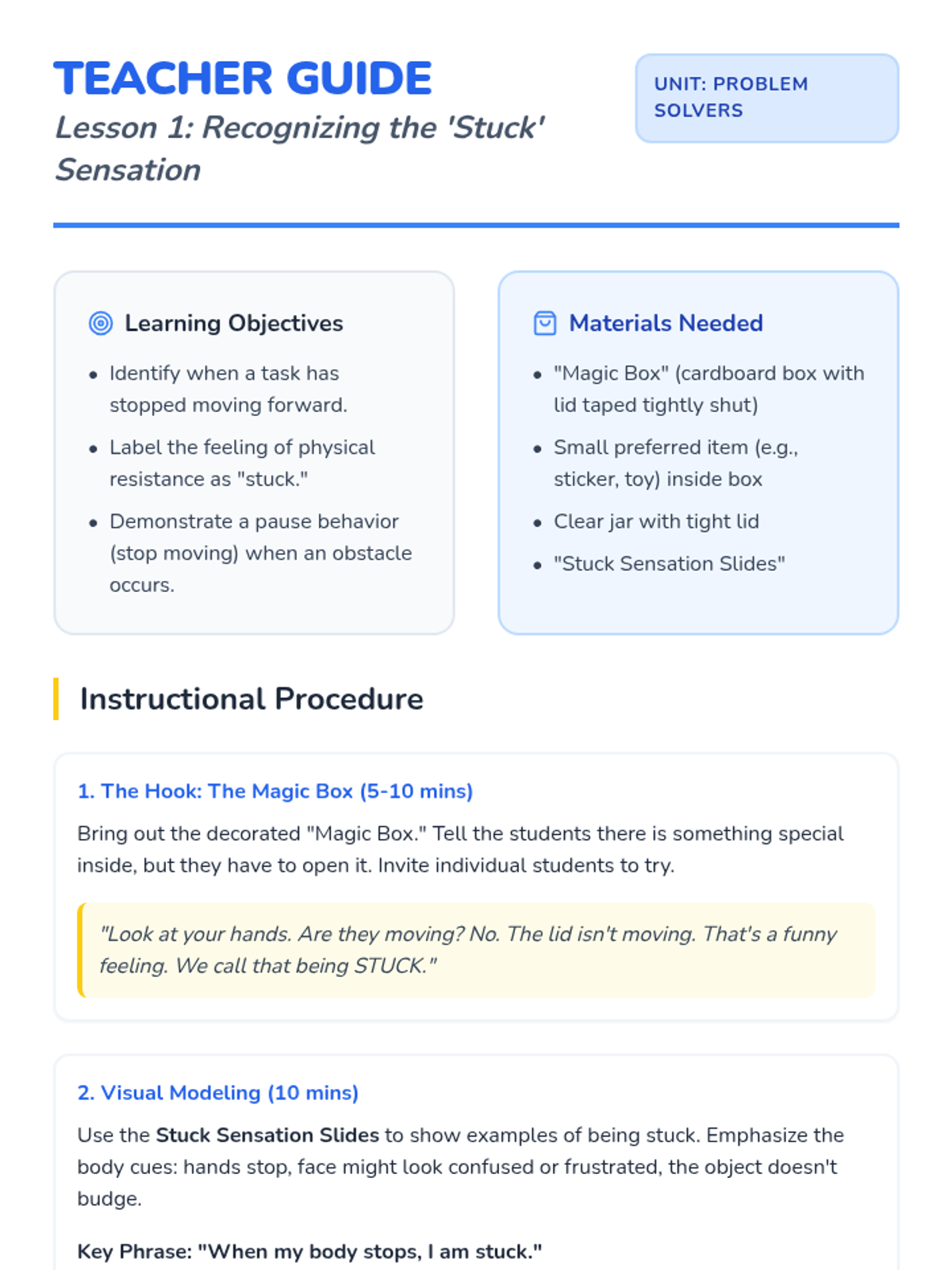 A Pre-K Special Education sequence focused on identifying obstacles and seeking help effectively. Students move from recognizing the physical sensation of being 'stuck' to using specific communication tools to solve problems.