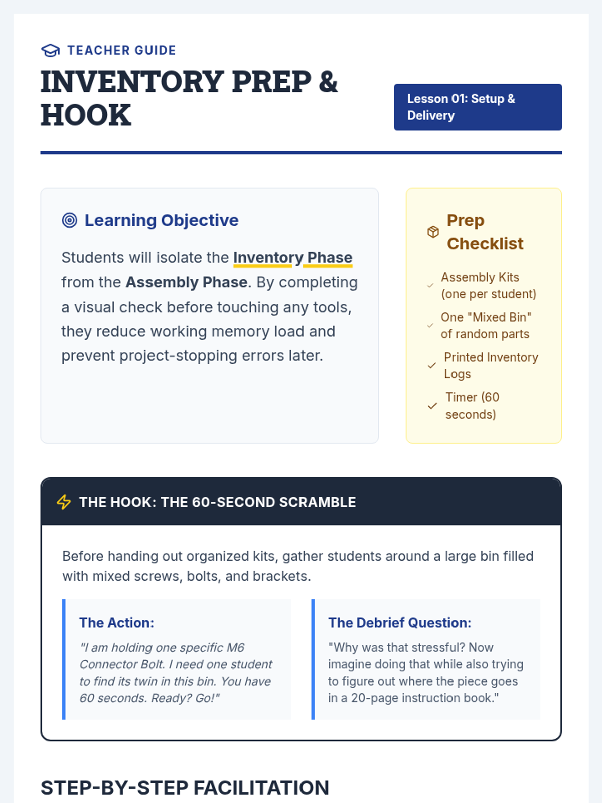 A project-based sequence for 11th-grade special education students focusing on working memory through procedural assembly. Students learn to manage cognitive load by isolating single-step instructions and verifying their work during fabrication tasks.