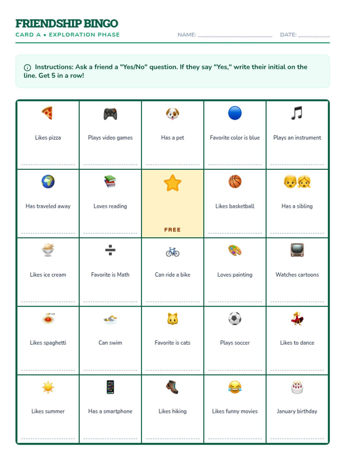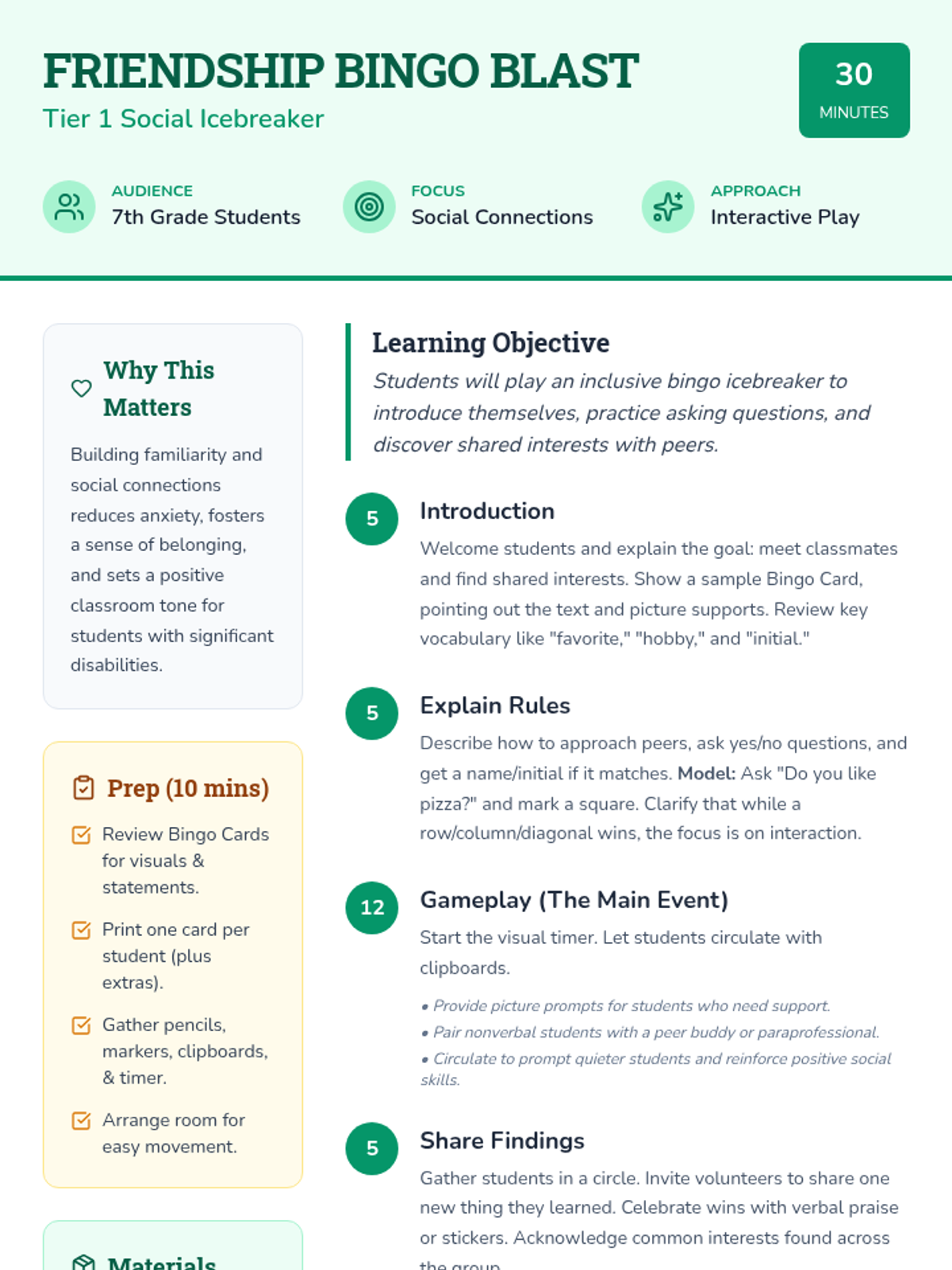 A pair of engaging icebreaker activities designed for students with significant disabilities to foster social connections and reduce anxiety through structured interaction.