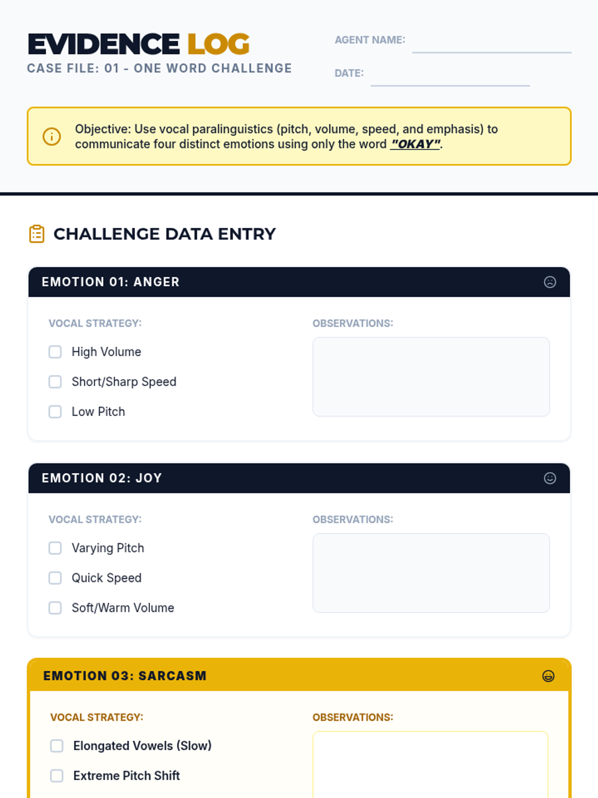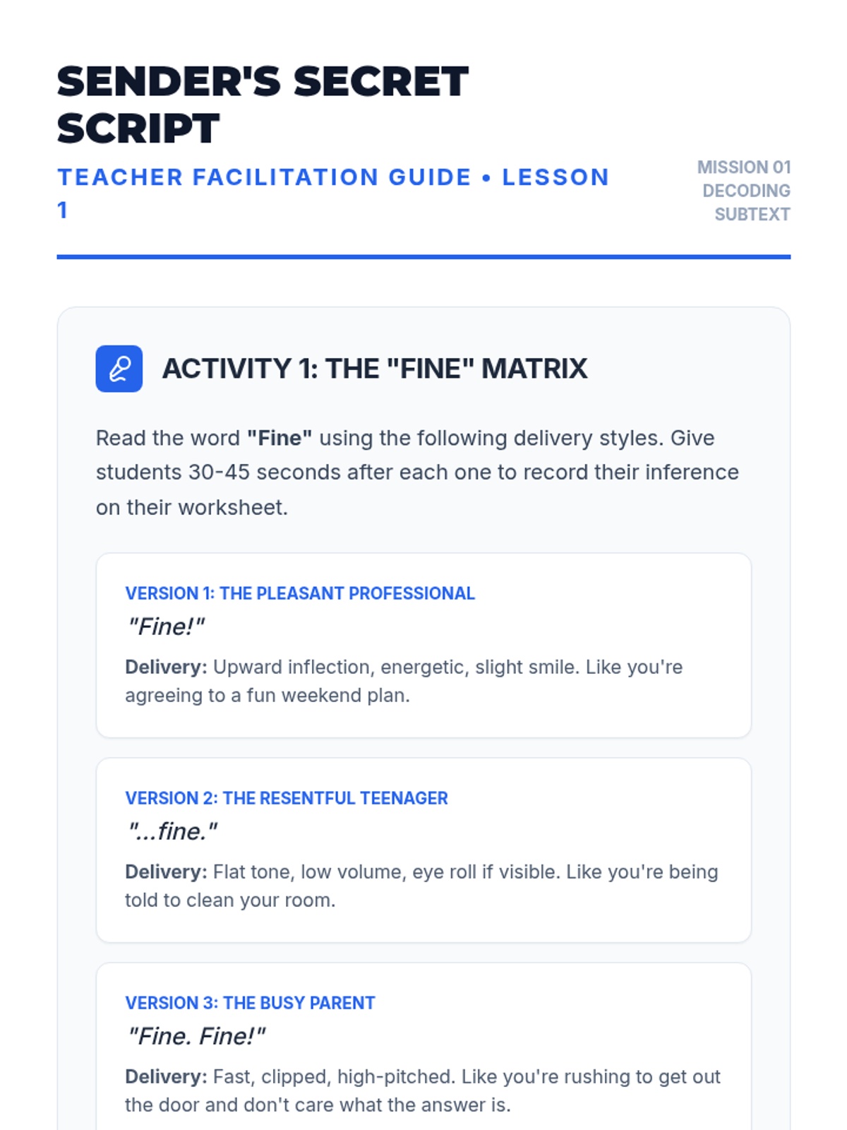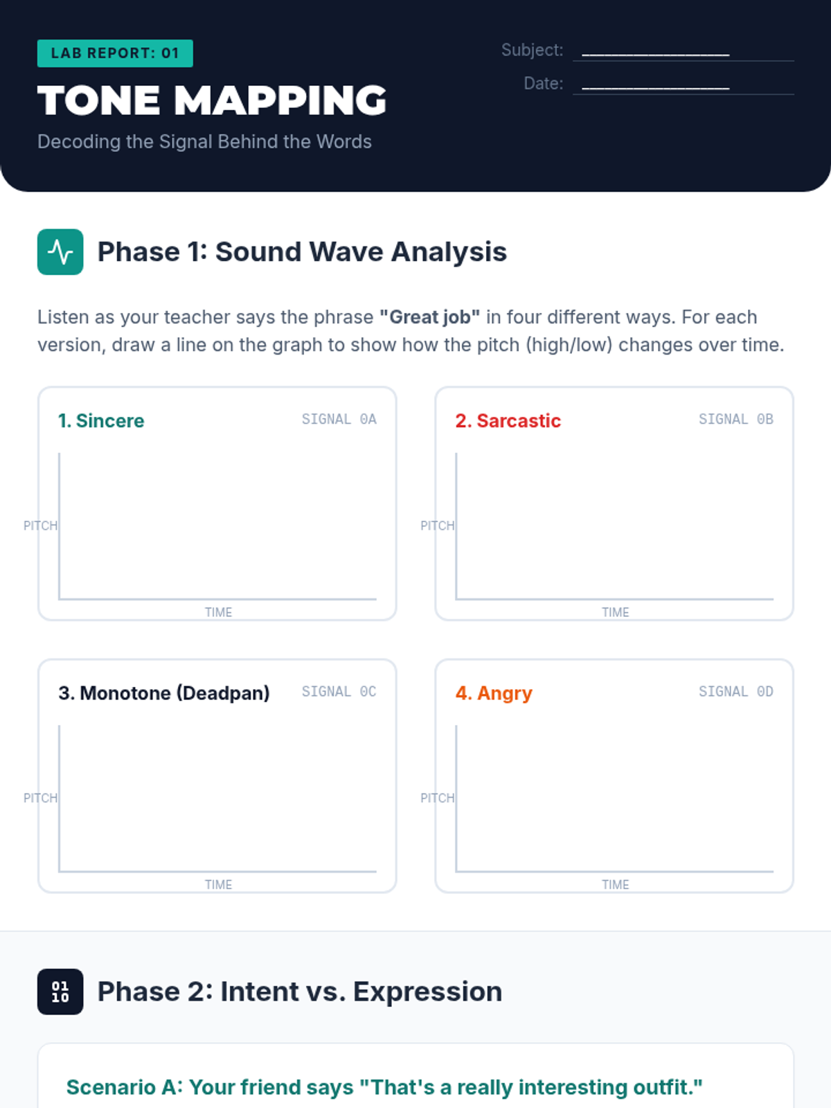 A 5-lesson sequence for 9th-grade social communication students focusing on the analytical deconstruction of tone, volume, and inflection. Students move from identifying basic vocal cues to analyzing complex social conflicts and professional interactions through a 'Vocal Lab' investigative lens.